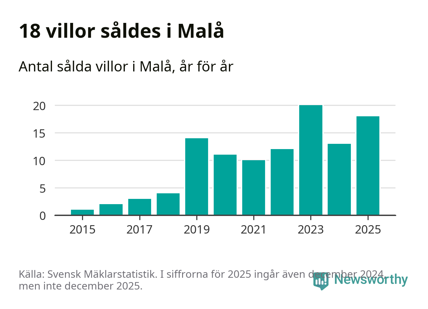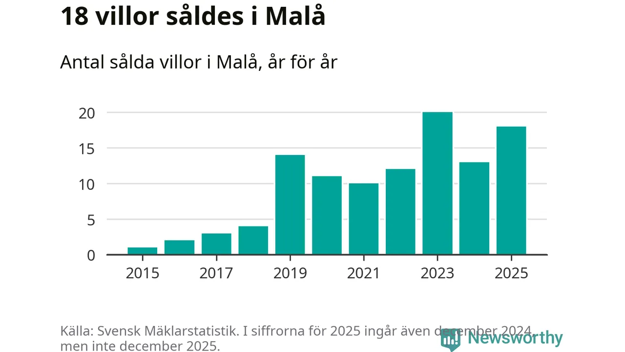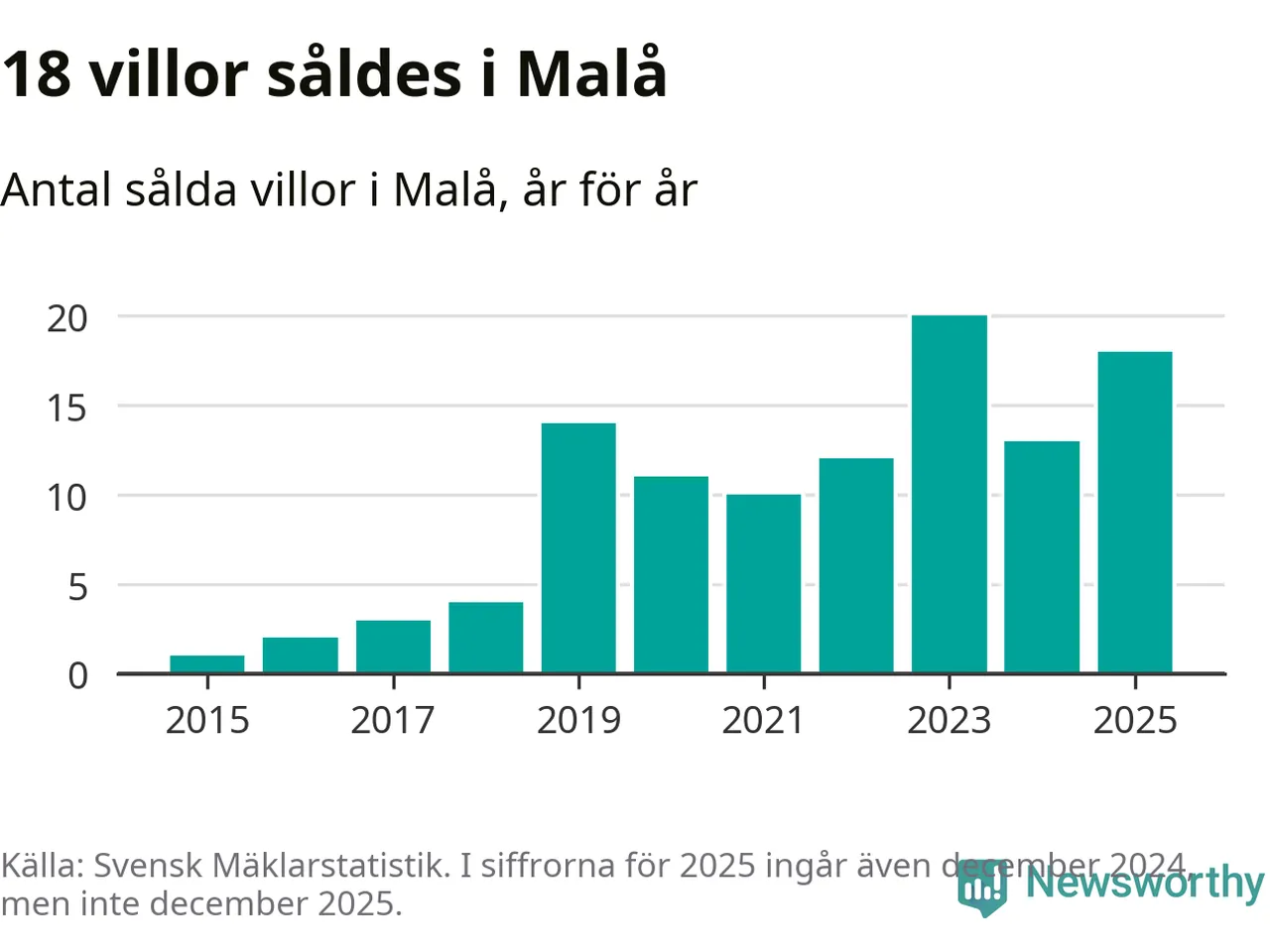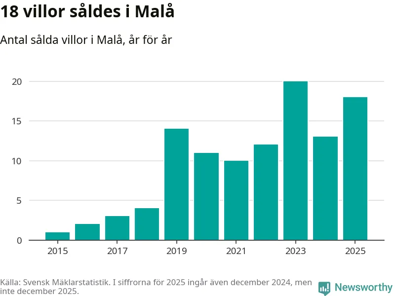 Däremot ökade antalet sålda villor. Totalt såldes 18 villor, att jämföra med 13 under 2024.