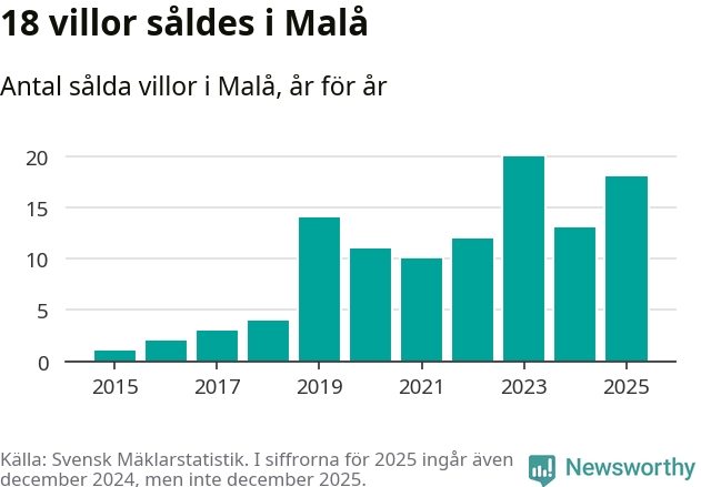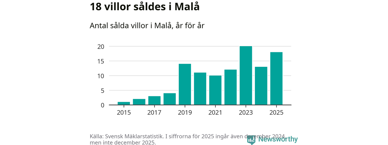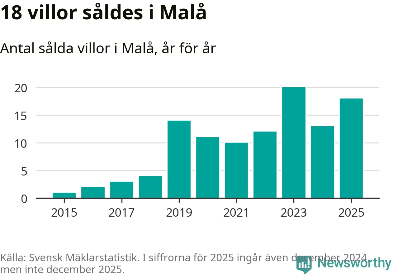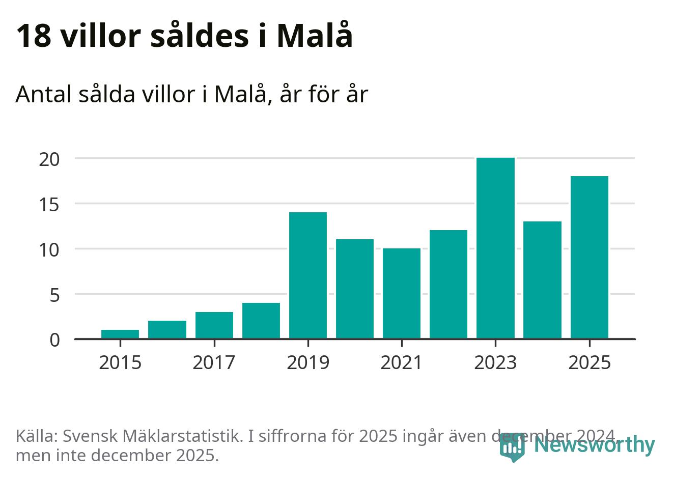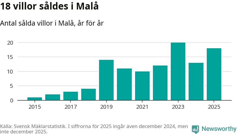 Däremot ökade antalet sålda villor. Totalt såldes 18 villor, att jämföra med 13 under 2024.