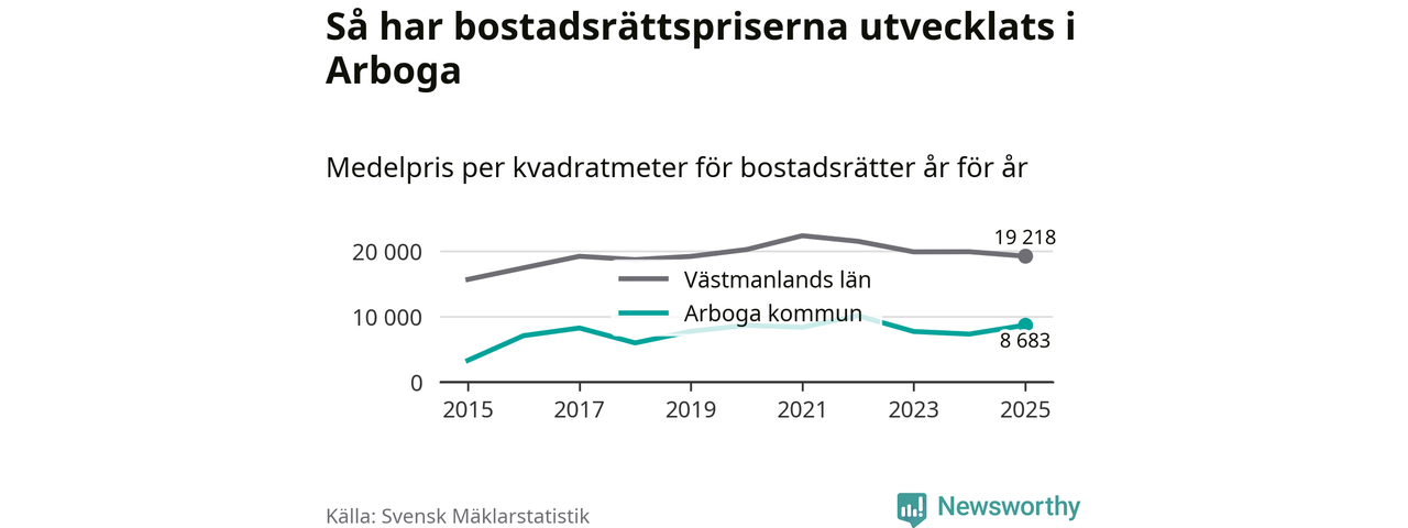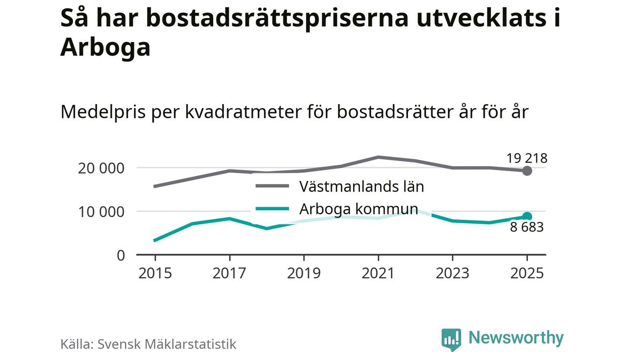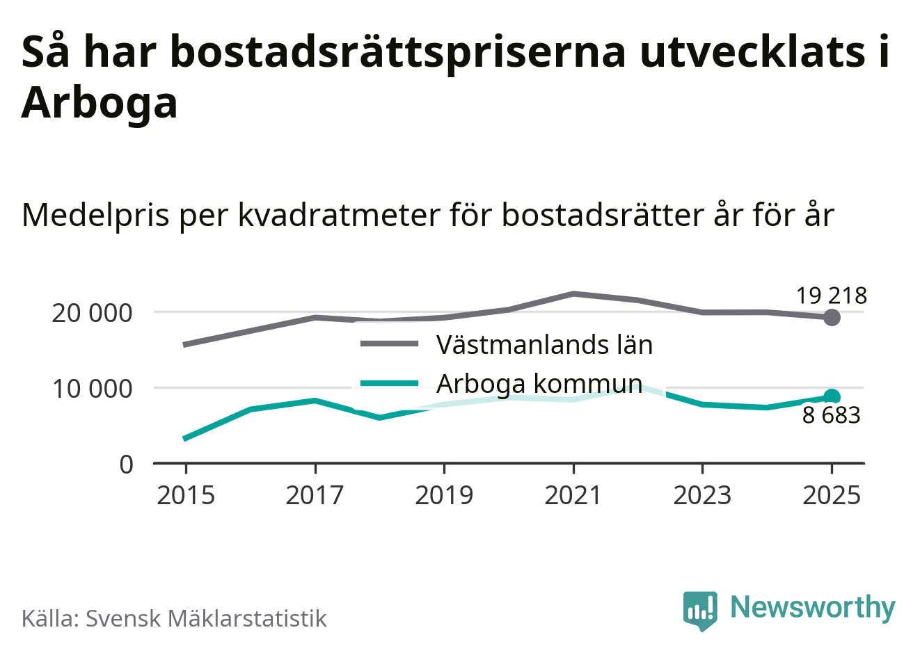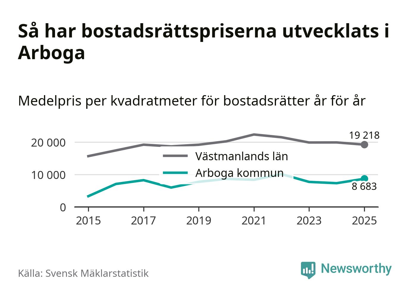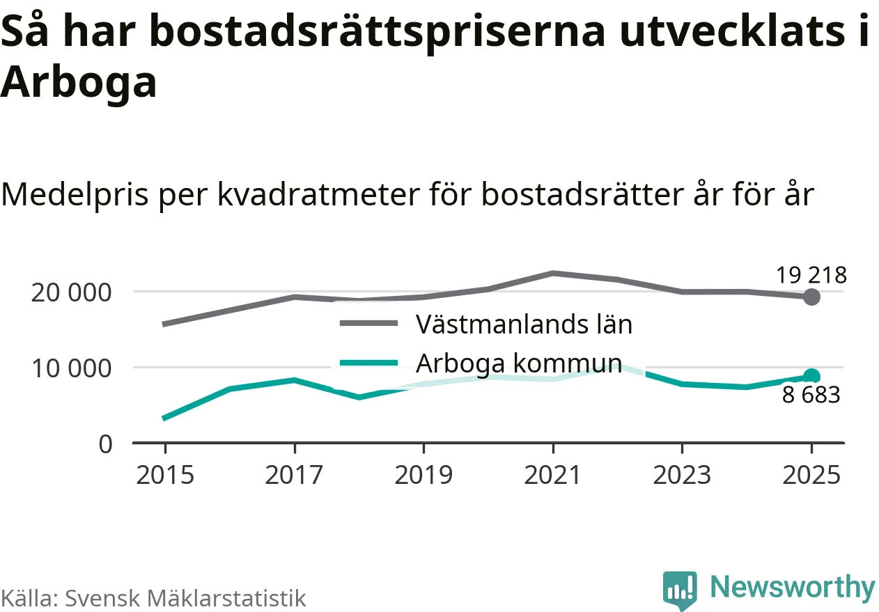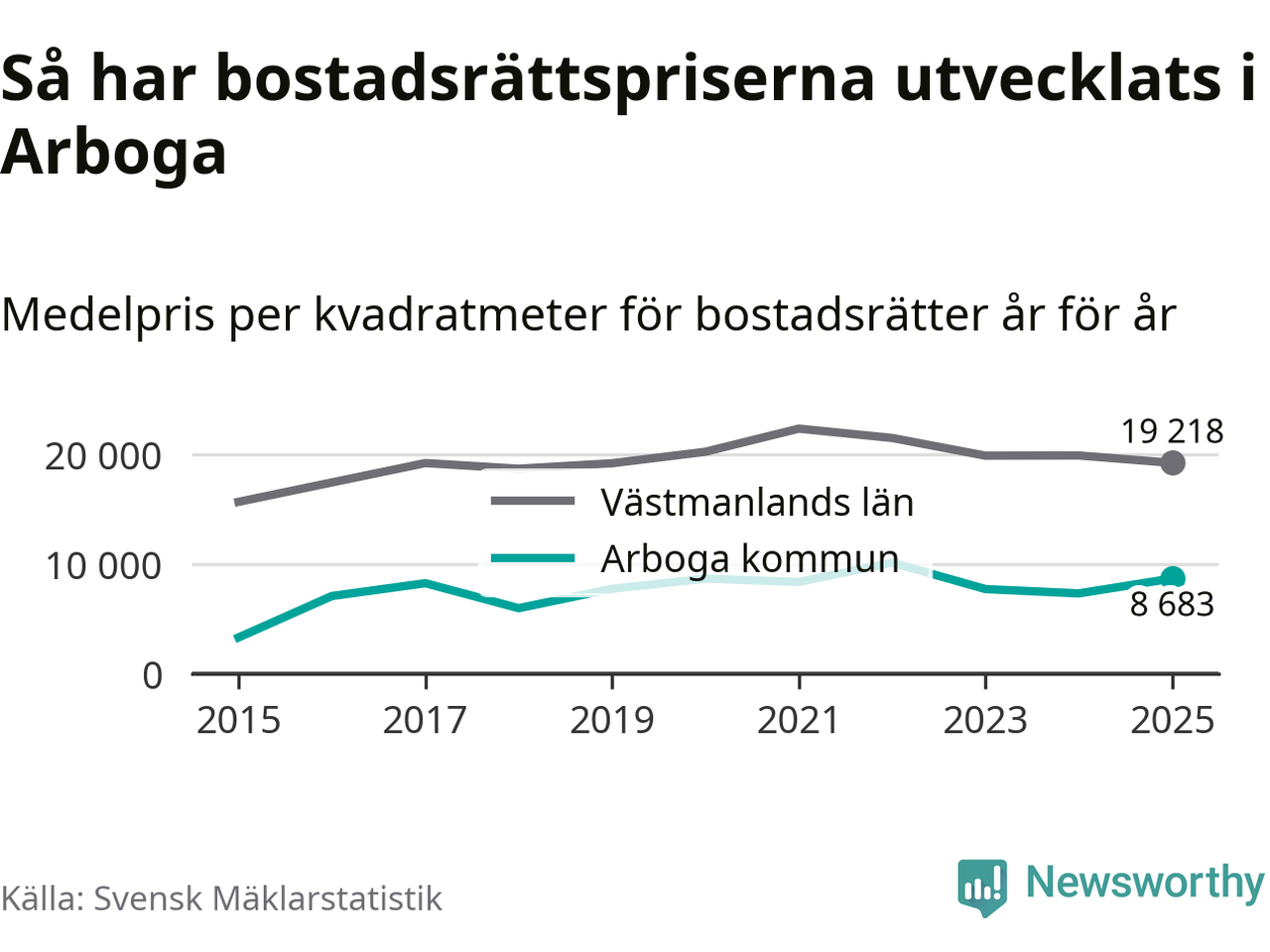 Det såldes totalt 86 bostadsrätter i Arboga kommun under året. Genomsnittspriset per kvadratmeter landade på 8 683 kronor. Det är en ökning med 19 procent i kommunen på ett år.
