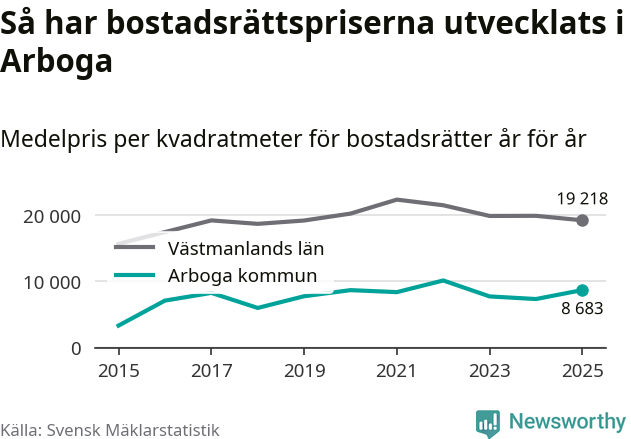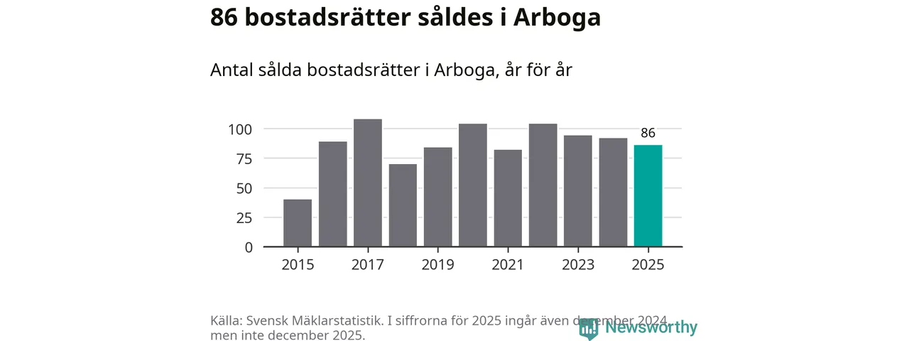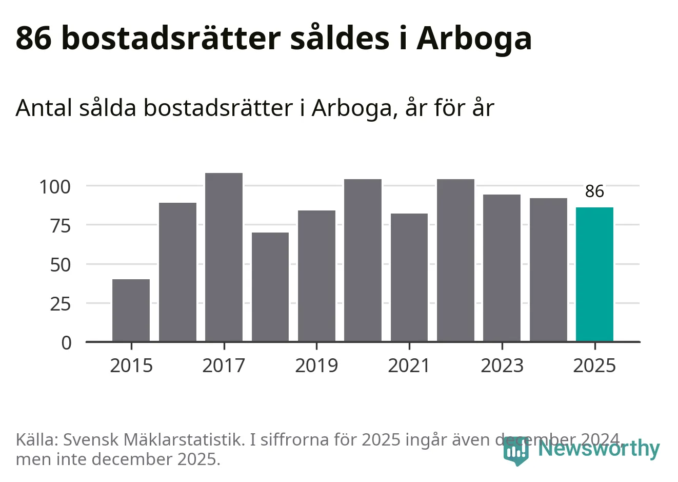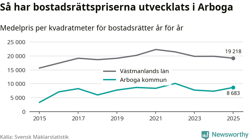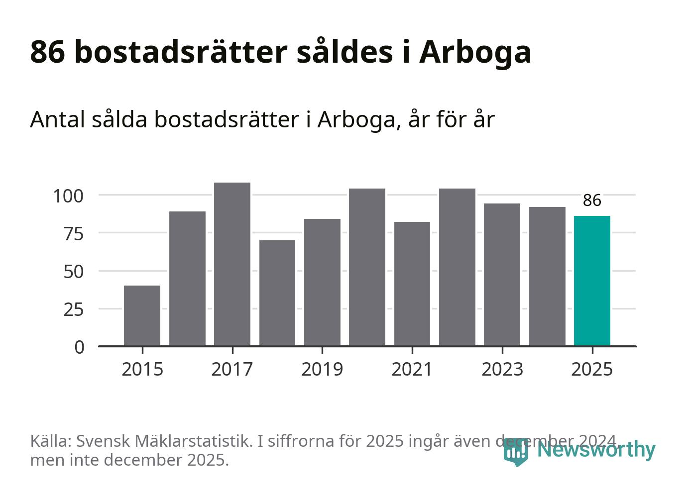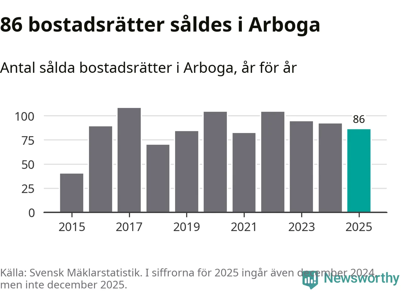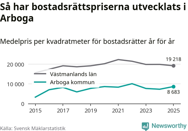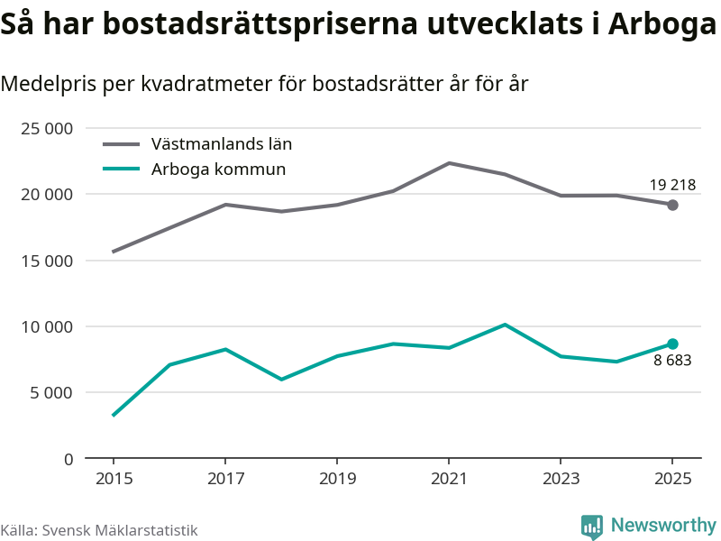 Det såldes totalt 86 bostadsrätter i Arboga kommun under året. Genomsnittspriset per kvadratmeter landade på 8 683 kronor. Det är en ökning med 19 procent i kommunen på ett år.