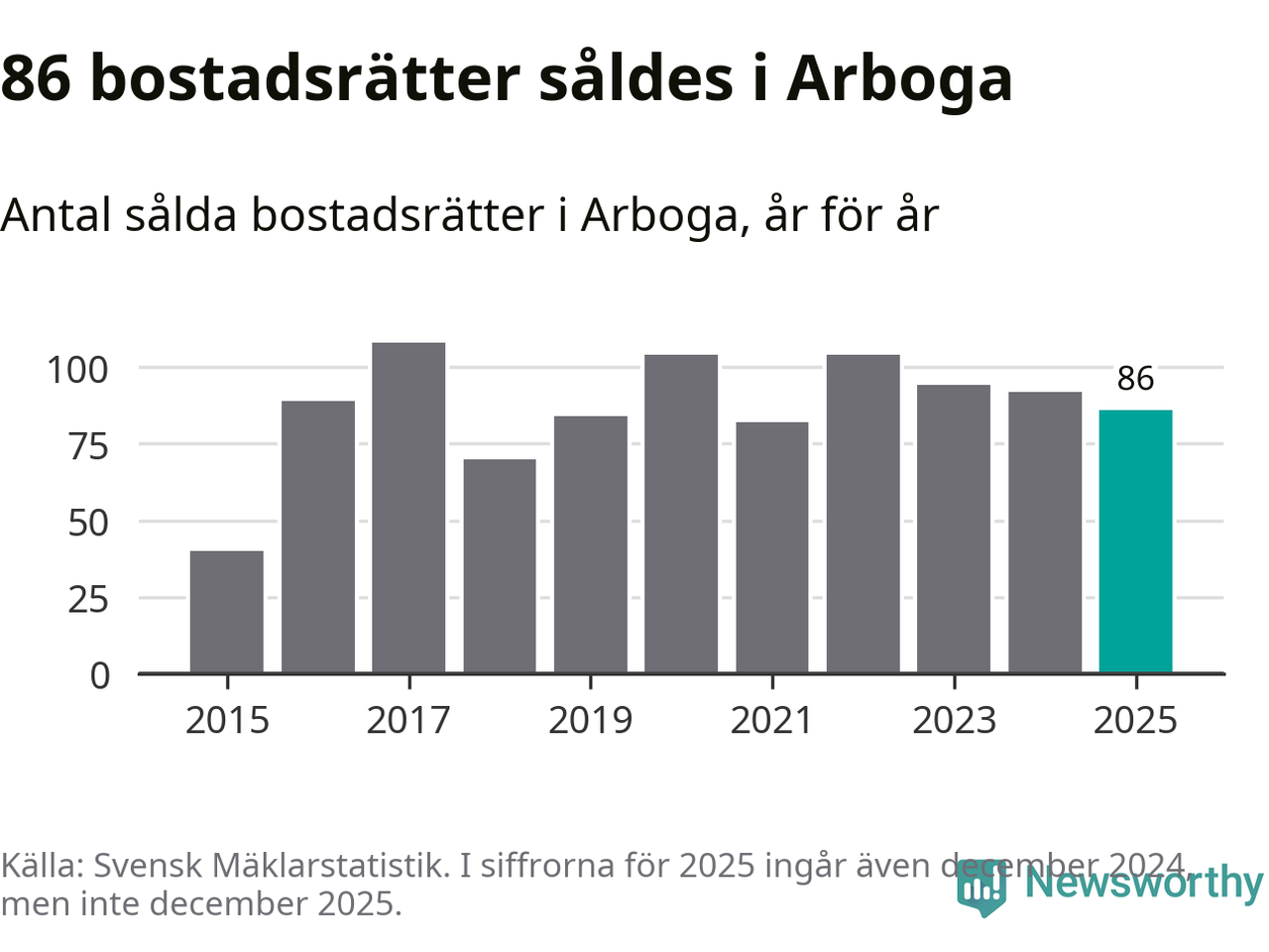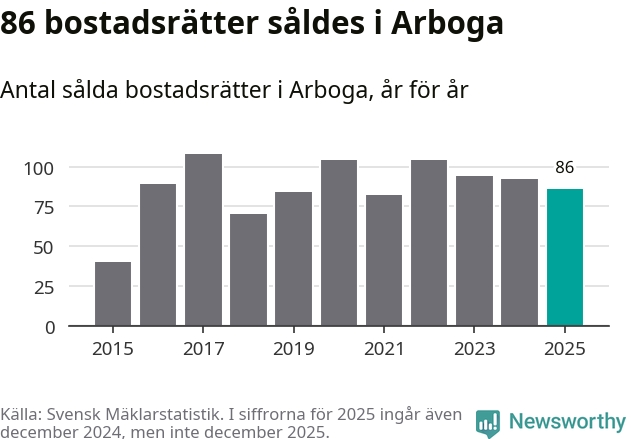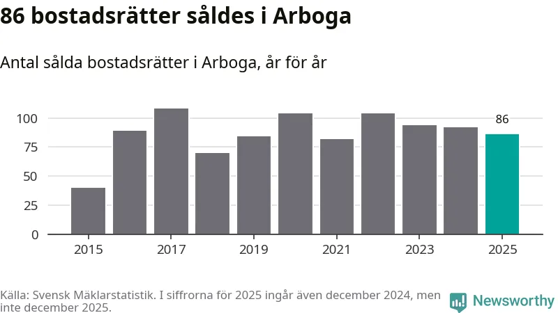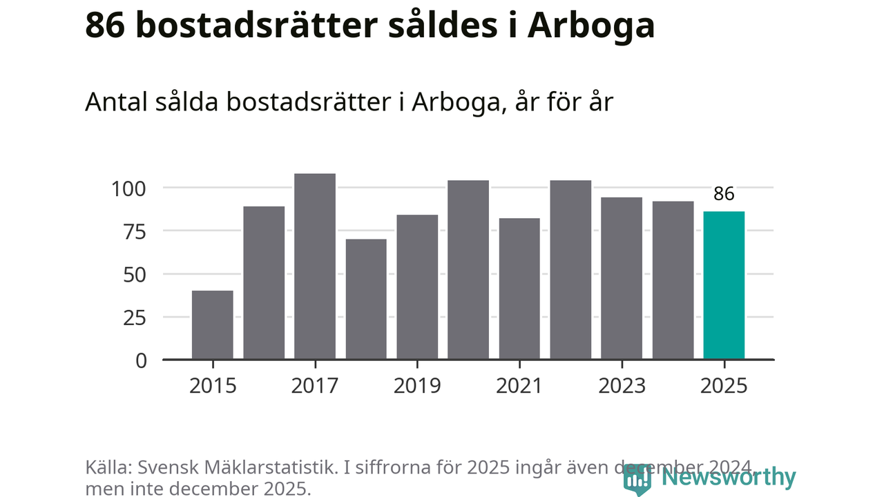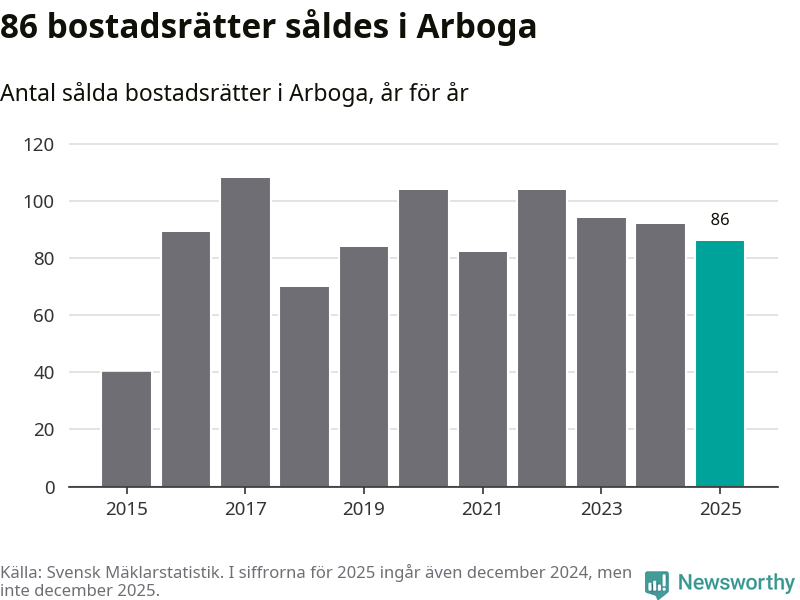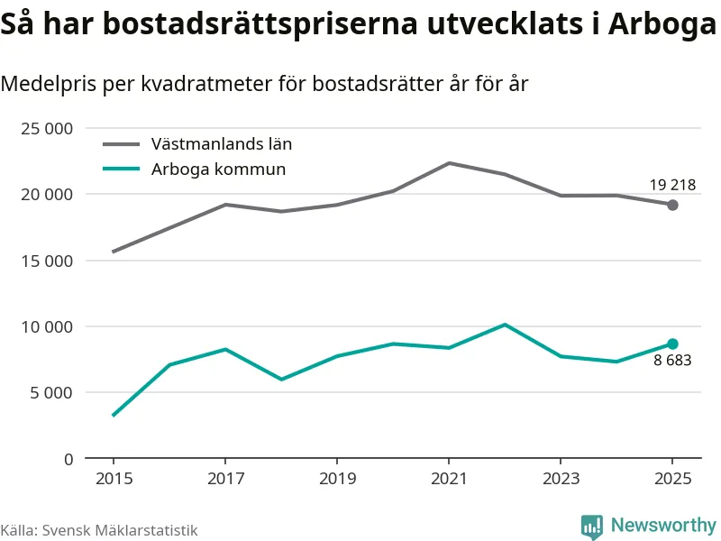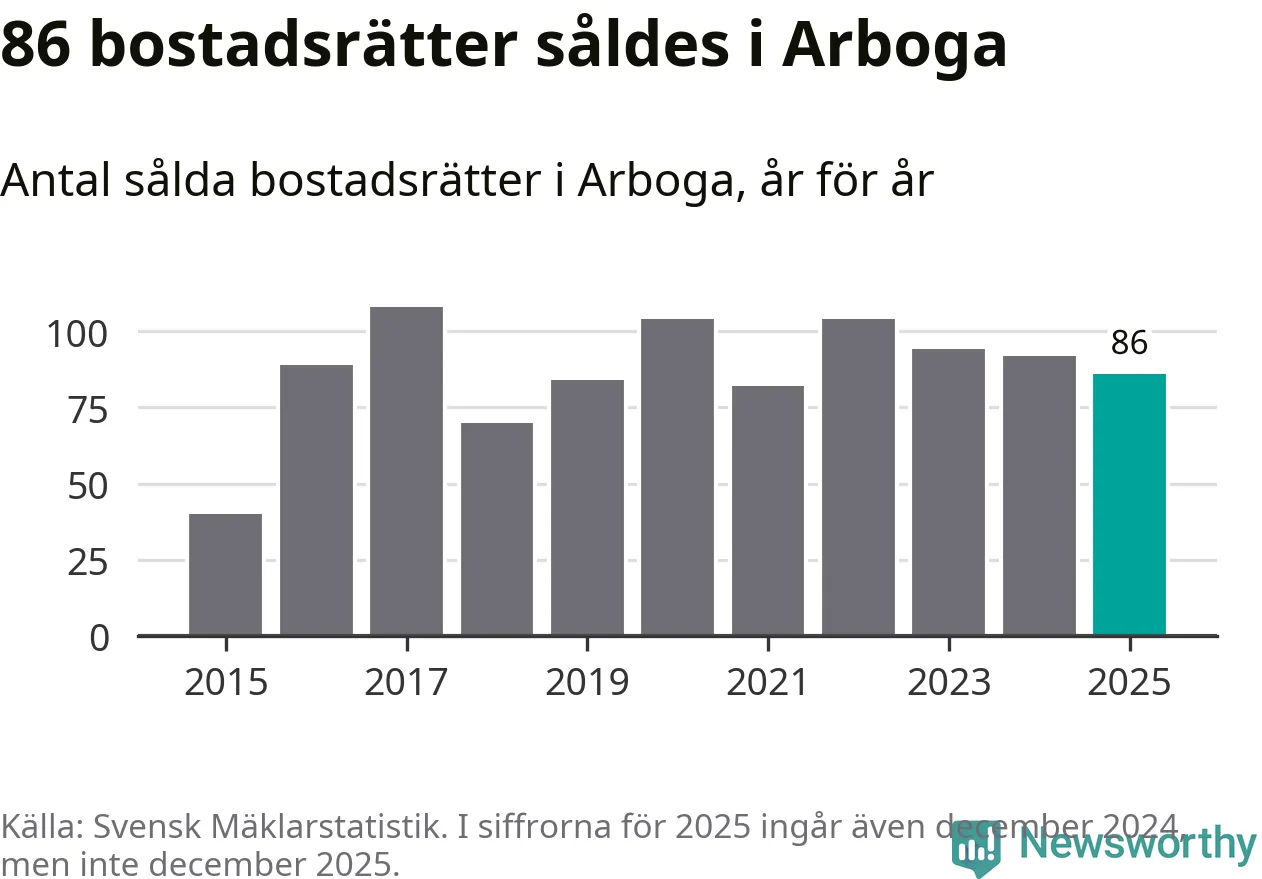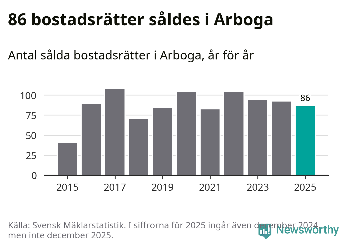 Det såldes totalt 86 bostadsrätter i Arboga kommun under året. Genomsnittspriset per kvadratmeter landade på 8 683 kronor. Det är en ökning med 19 procent i kommunen på ett år.