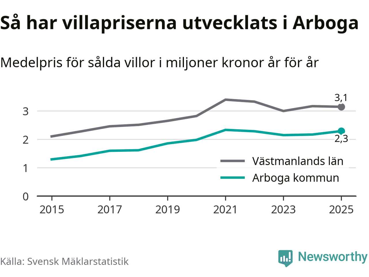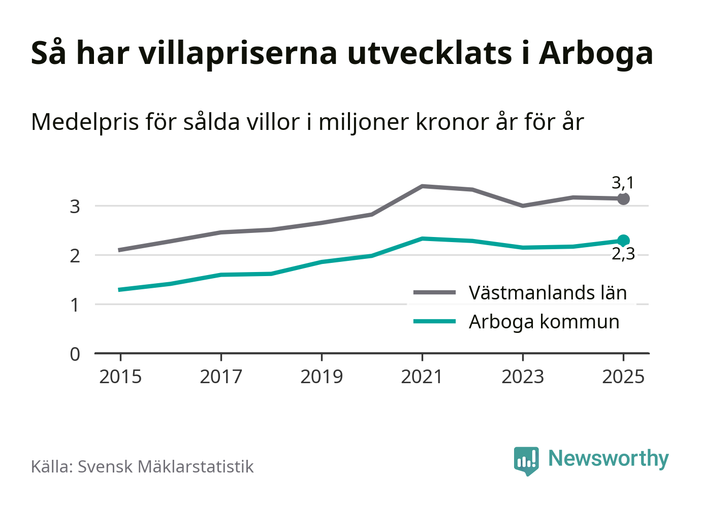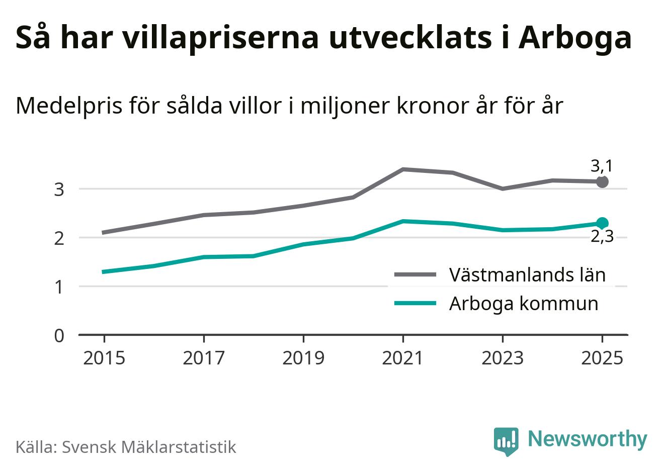 2,3 miljoner kronor är medelpriset för de villor som såldes i Arboga kommun under året, eller 20 097 kronor per kvadratmeter. Det innebär en prisökning med sex procent på ett år och är andra året i rad som priserna ökar i kommunen.