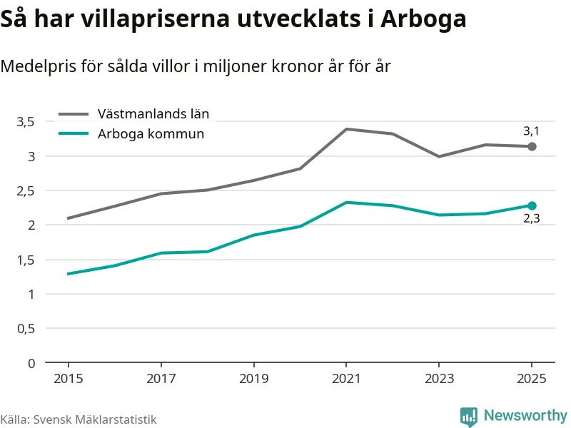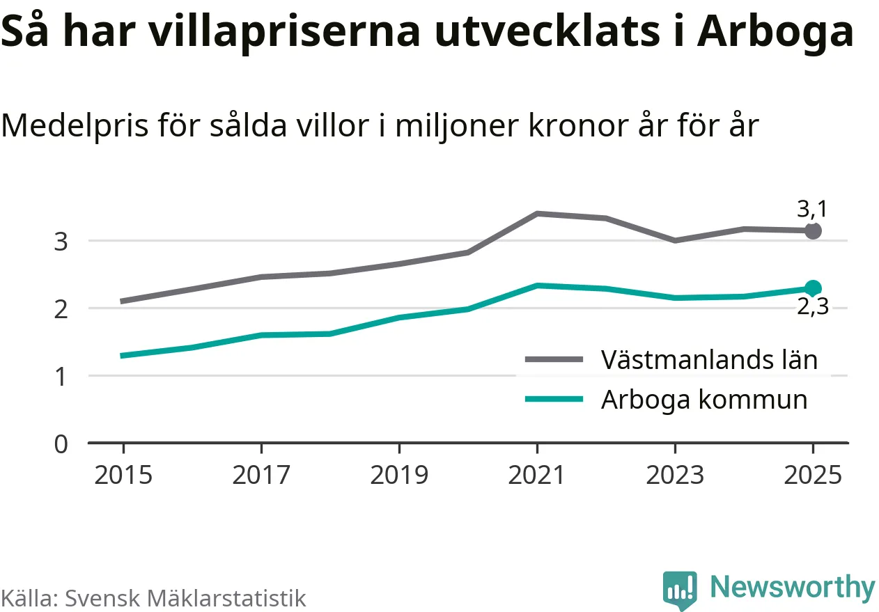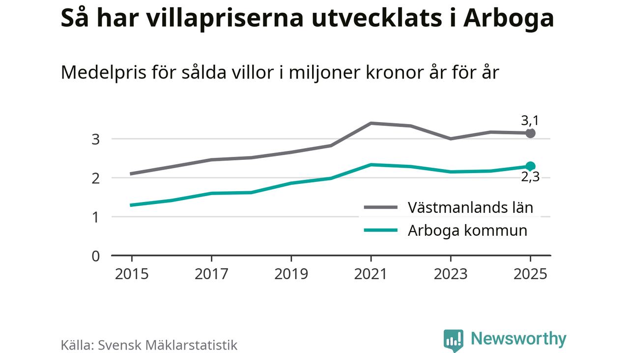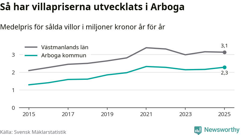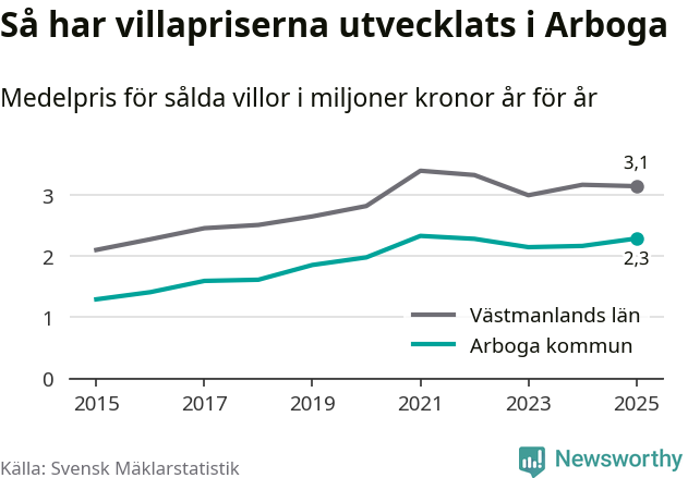 2,3 miljoner kronor är medelpriset för de villor som såldes i Arboga kommun under året, eller 20 097 kronor per kvadratmeter. Det innebär en prisökning med sex procent på ett år och är andra året i rad som priserna ökar i kommunen.
