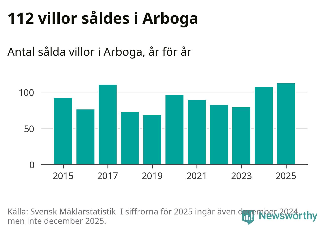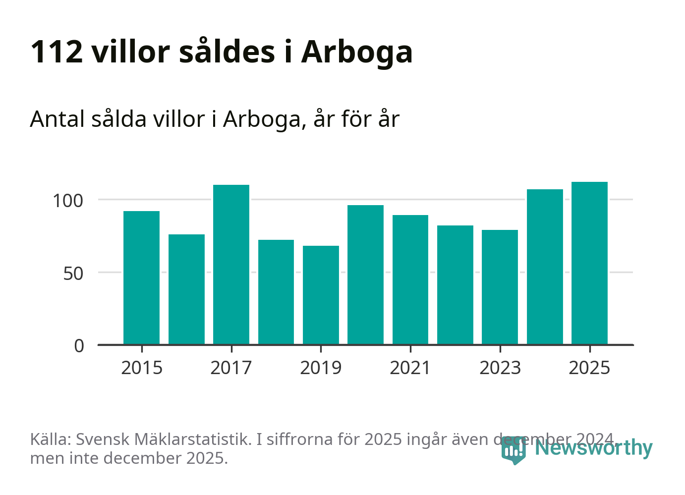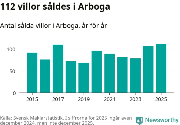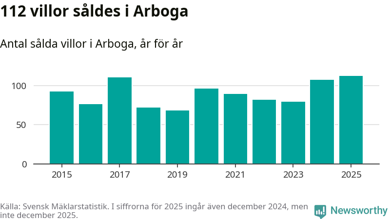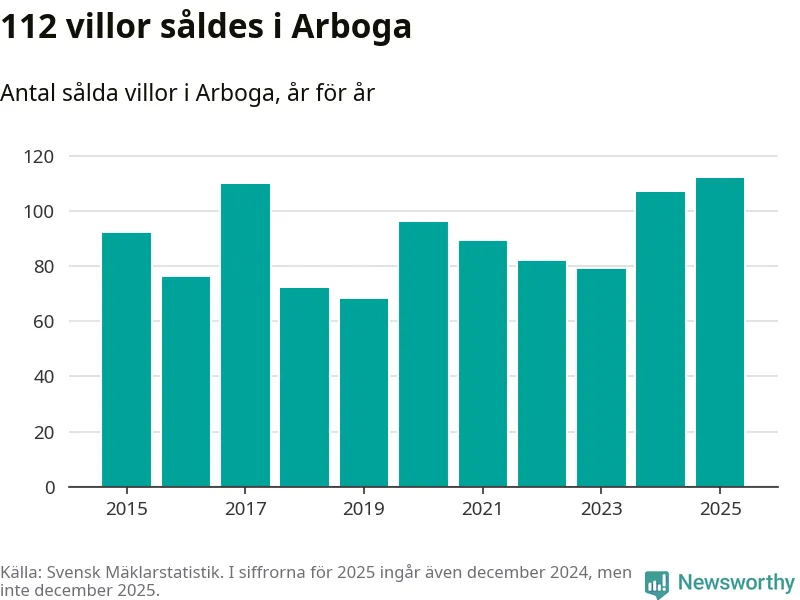 Antalet sålda villor ökade också. Totalt såldes 112 villor, att jämföra med 107 under 2024. Det är fler än något annat år sedan 2015.