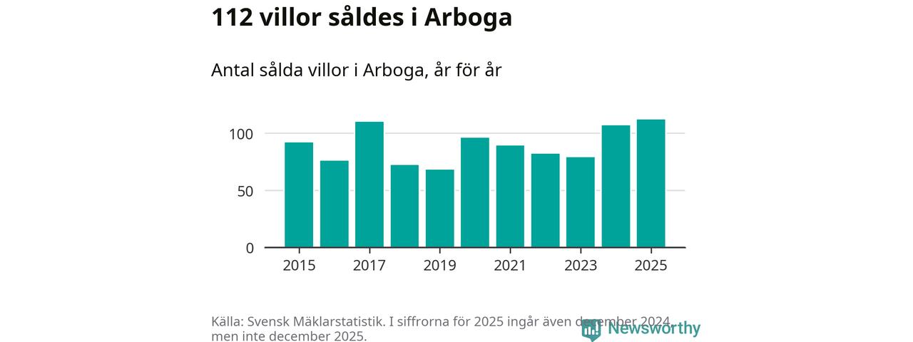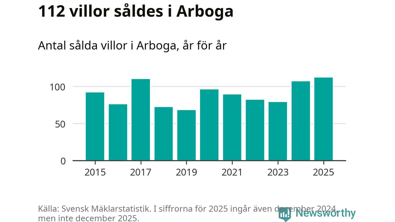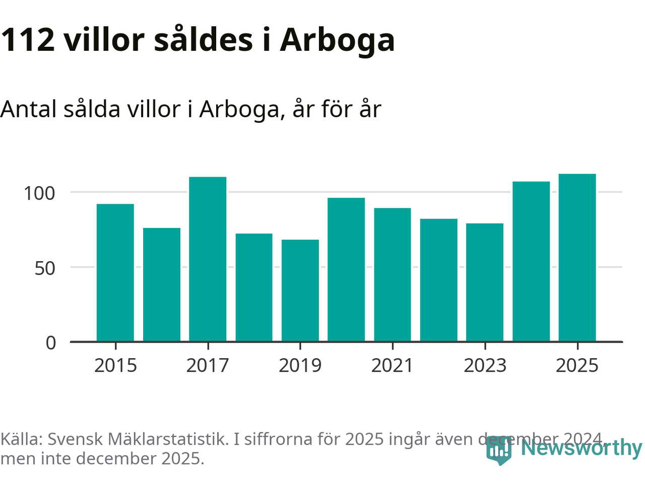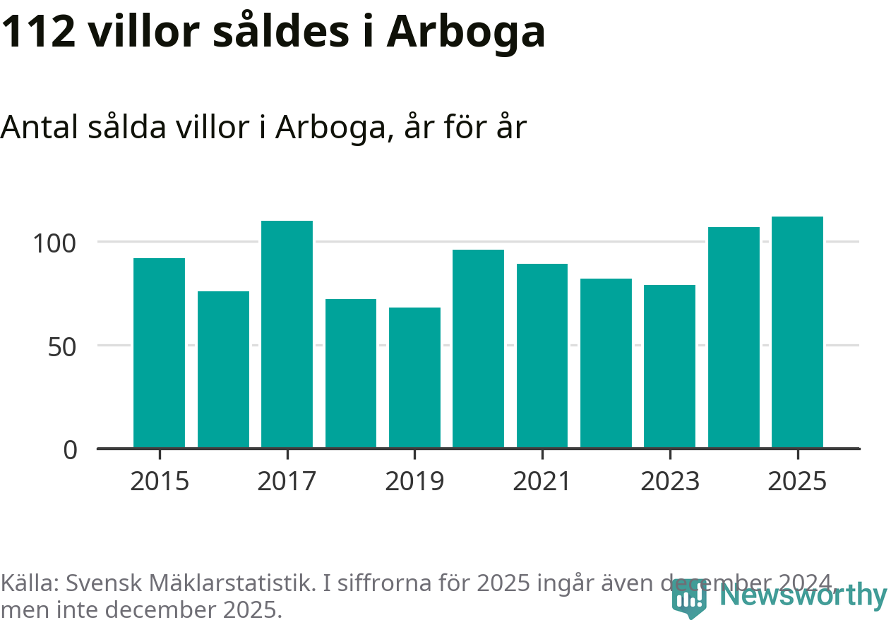 Antalet sålda villor ökade också. Totalt såldes 112 villor, att jämföra med 107 under 2024. Det är fler än något annat år sedan 2015.