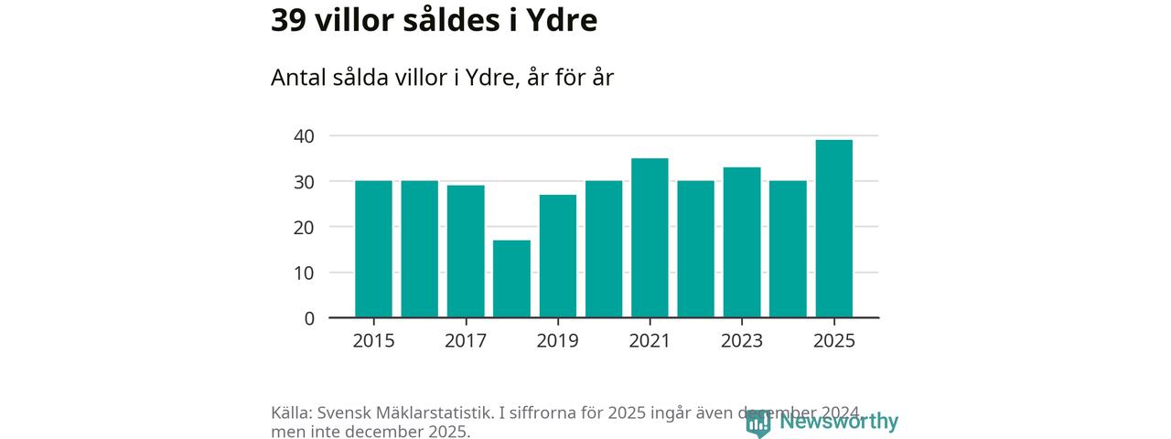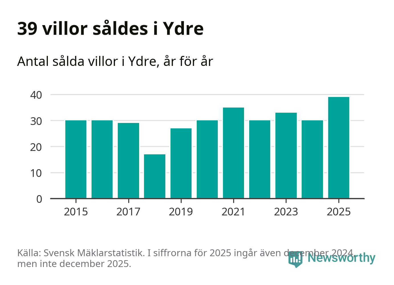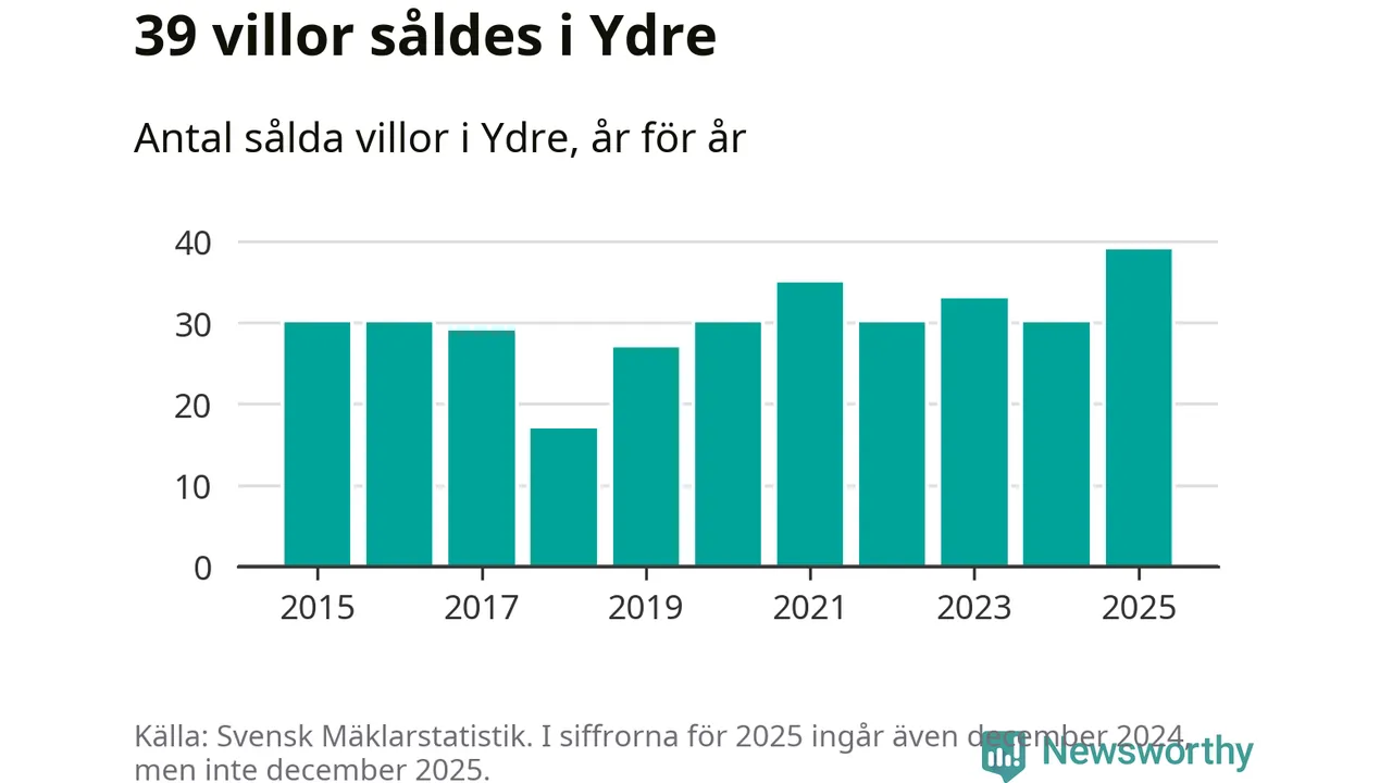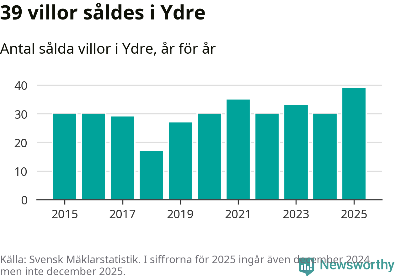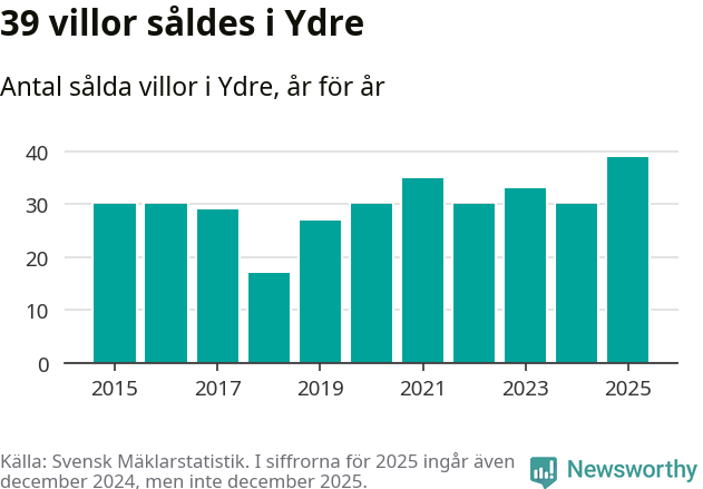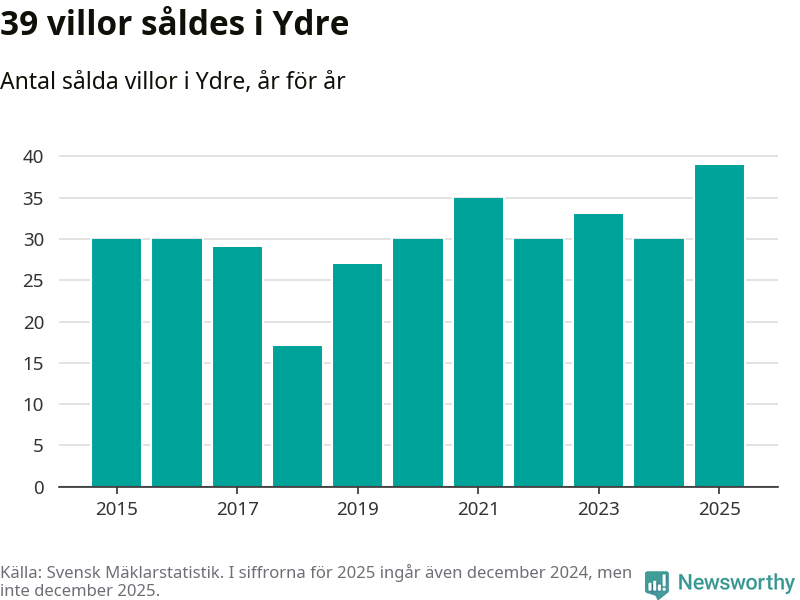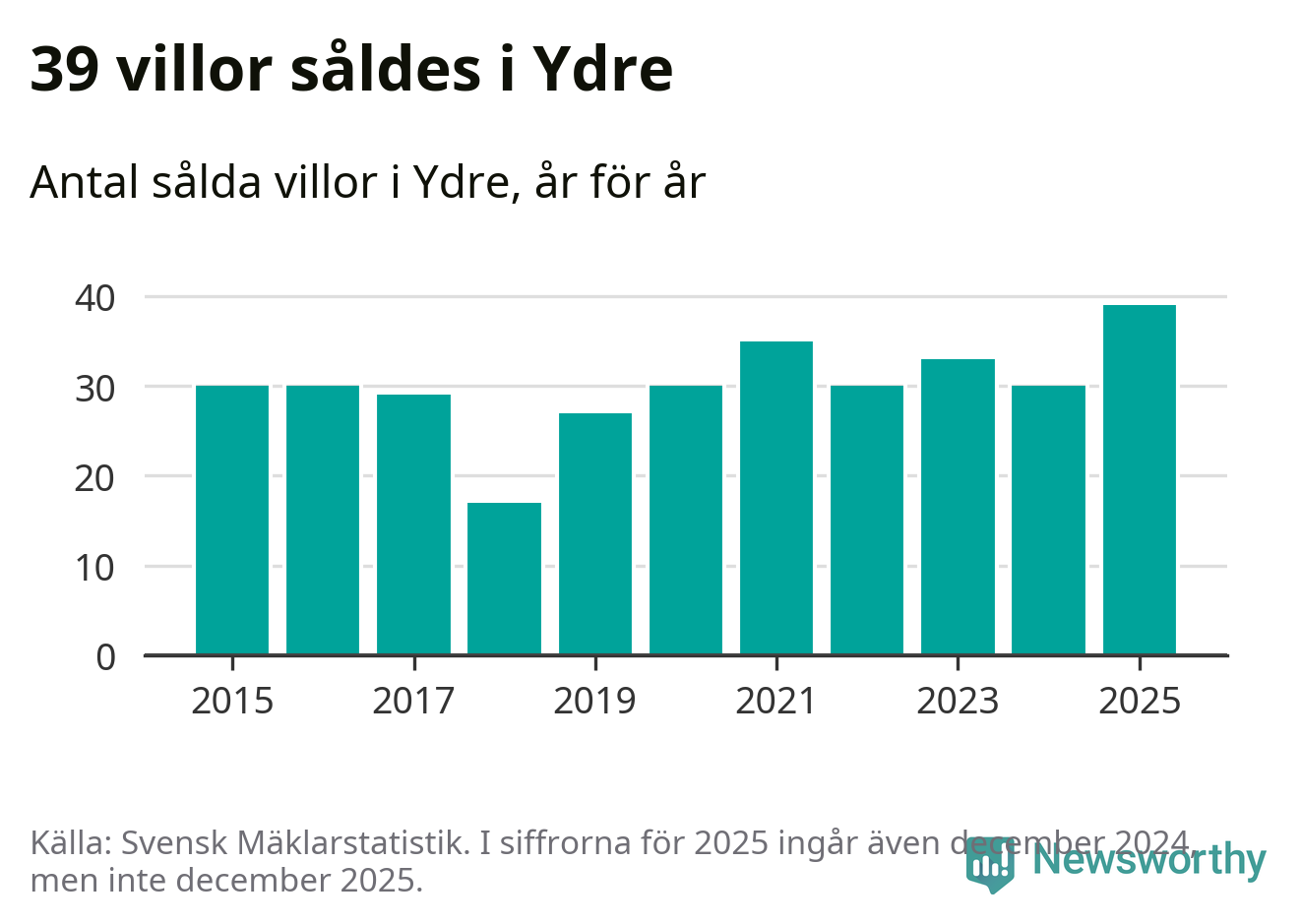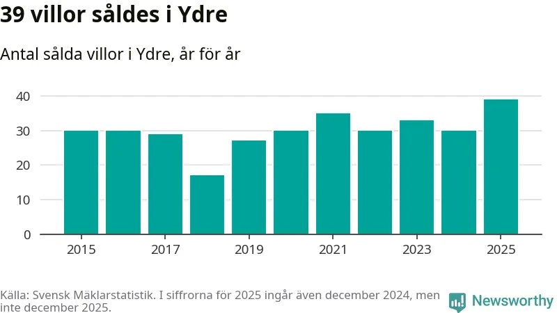 Antalet sålda villor ökade också. Totalt såldes 39 villor, att jämföra med 30 under 2024. Det är fler än något annat år sedan 2015.