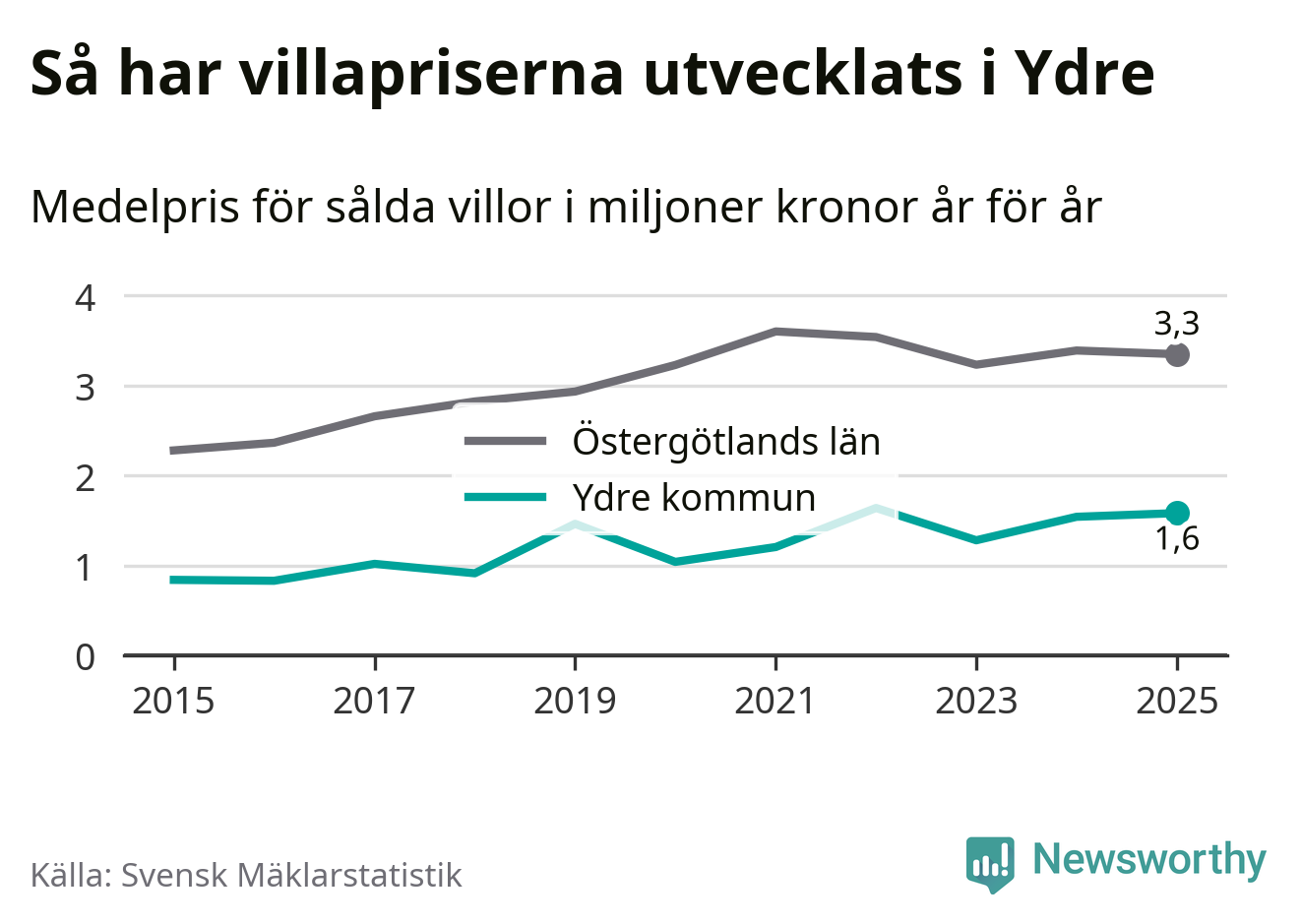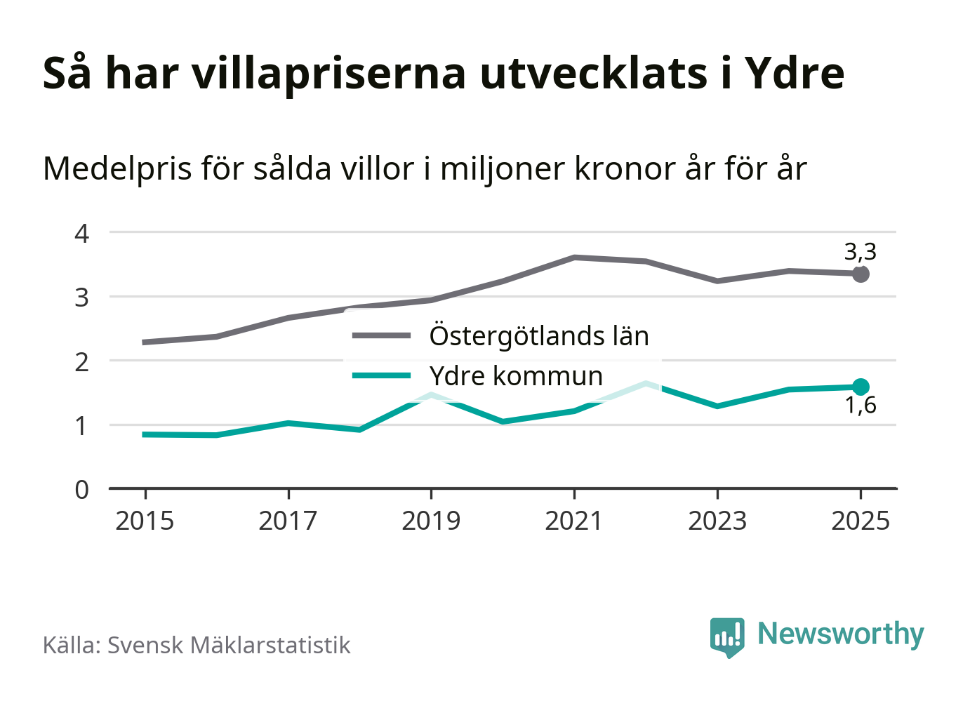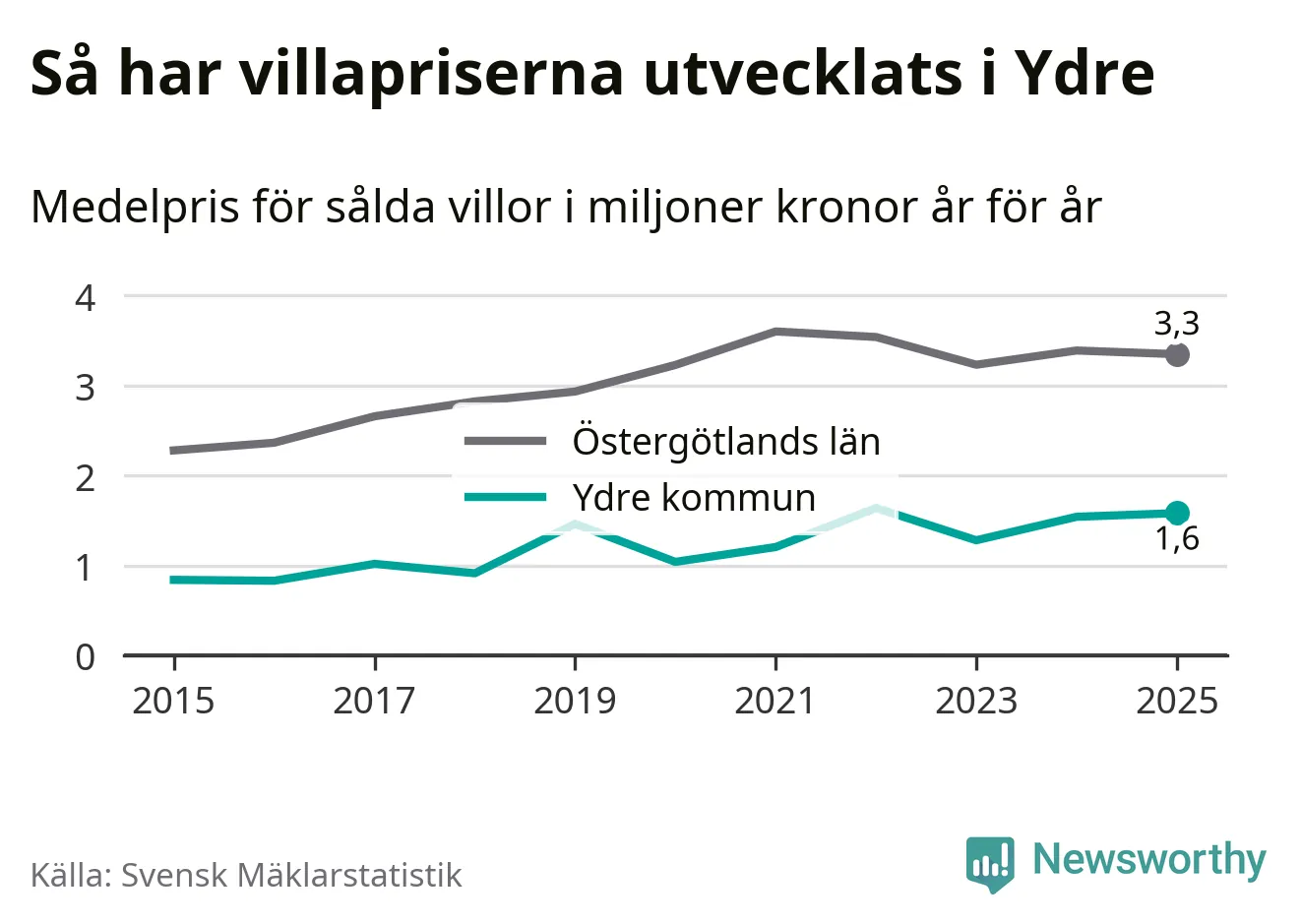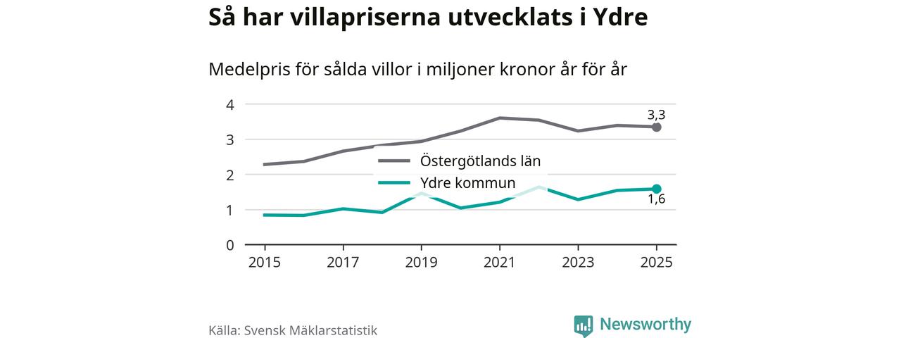1,6 miljoner kronor är medelpriset för de villor som såldes i Ydre kommun under året, eller 16 002 kronor per kvadratmeter. Det innebär en prisökning med tre procent på ett år och är andra året i rad som priserna ökar i kommunen.