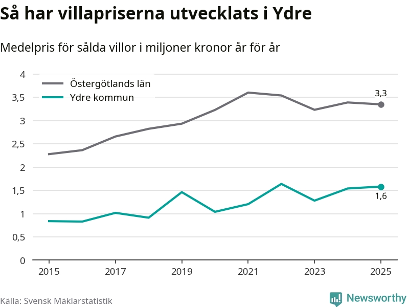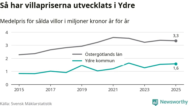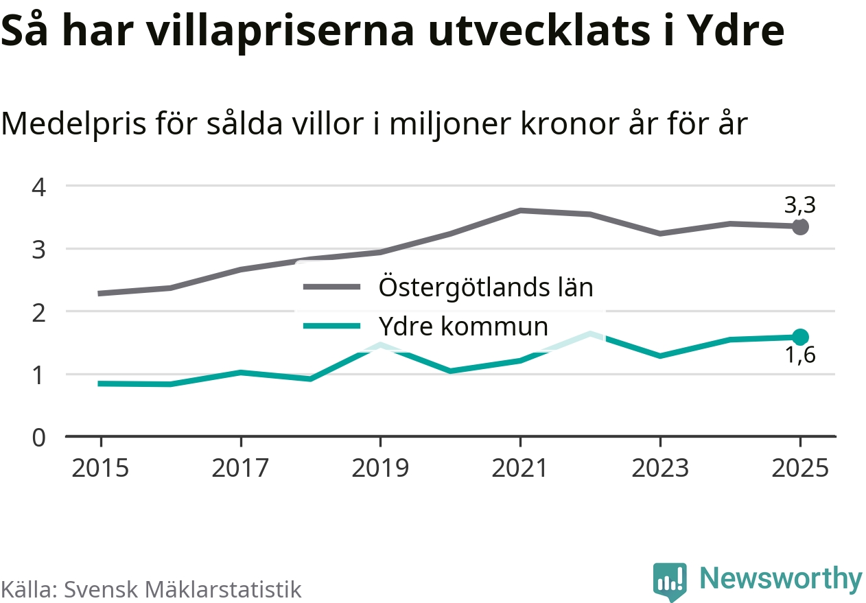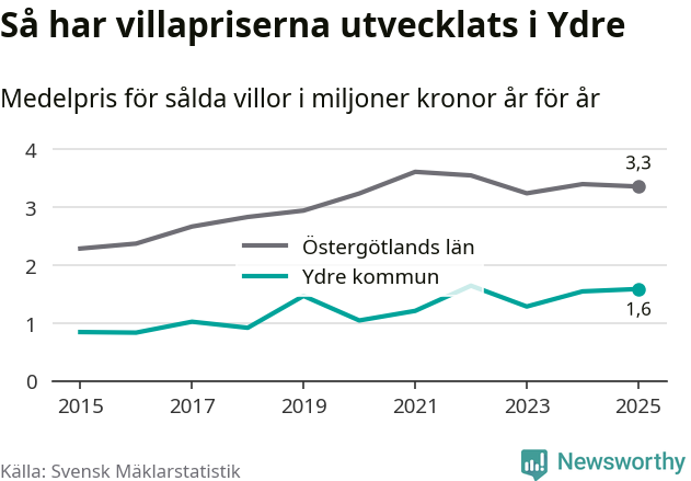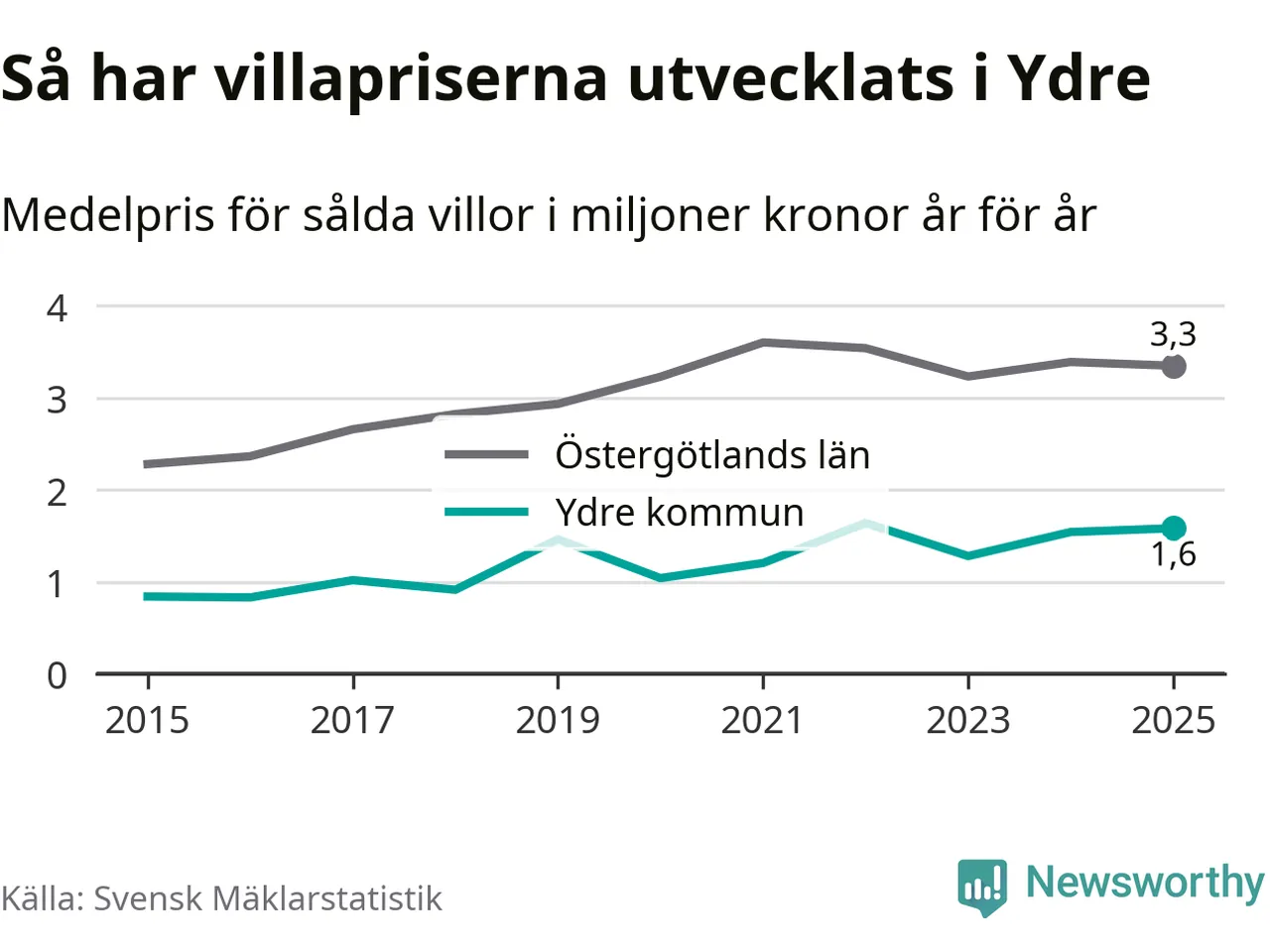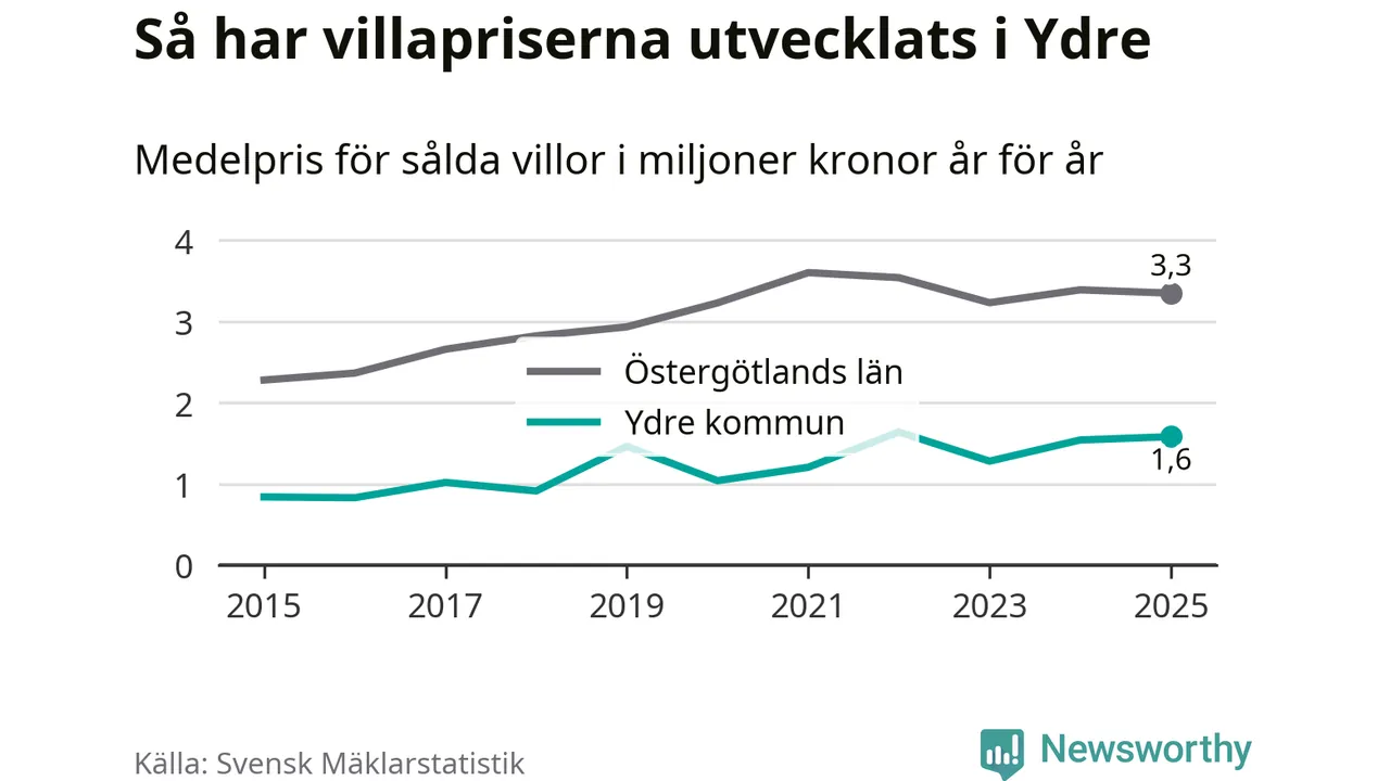 1,6 miljoner kronor är medelpriset för de villor som såldes i Ydre kommun under året, eller 16 002 kronor per kvadratmeter. Det innebär en prisökning med tre procent på ett år och är andra året i rad som priserna ökar i kommunen.