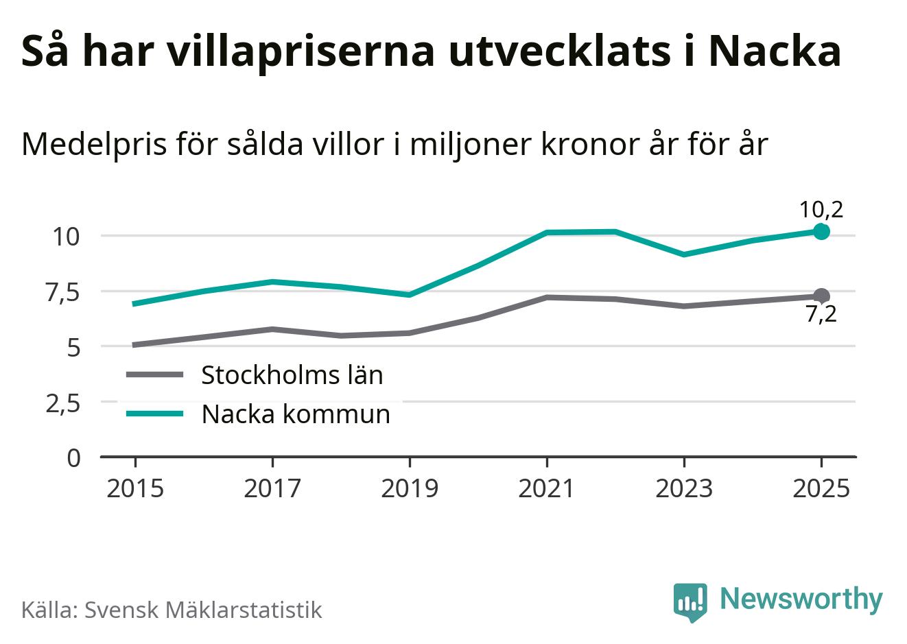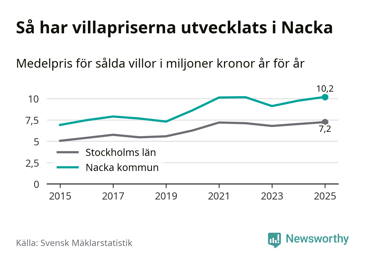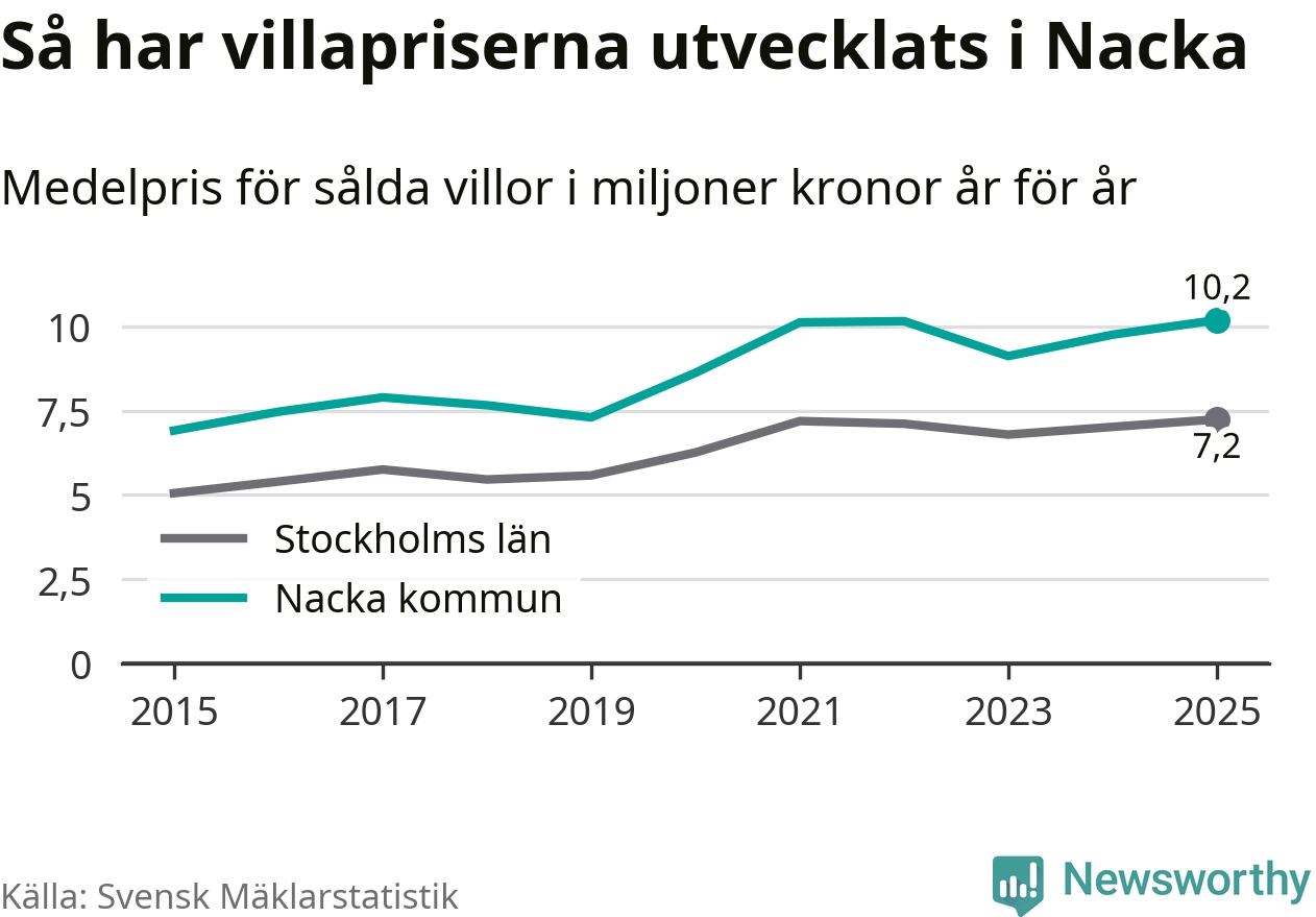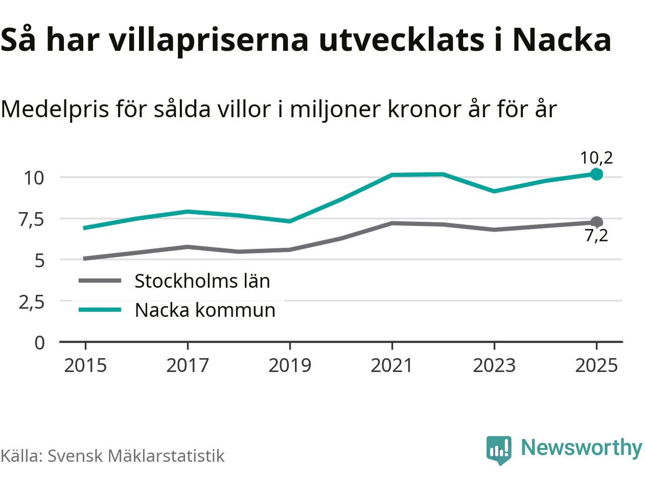 10,2 miljoner kronor är medelpriset för de villor som såldes i Nacka kommun under året, eller 73 067 kronor per kvadratmeter. Det innebär en prisökning med fyra procent på ett år. Det är det högsta årssnittet på åtminstone tio år. Bryter man upp siffrorna per kvartal har dock ännu högre villapriser noterats i Nacka vintern 2021/22.