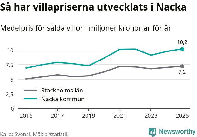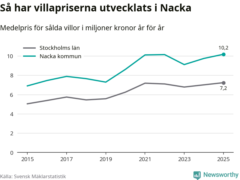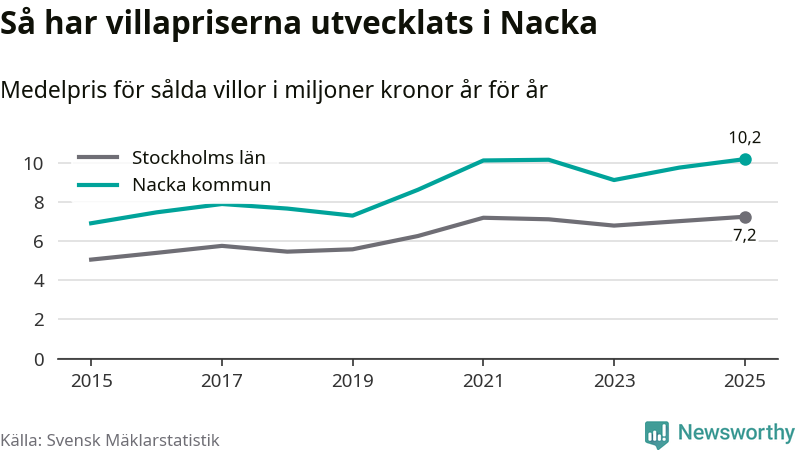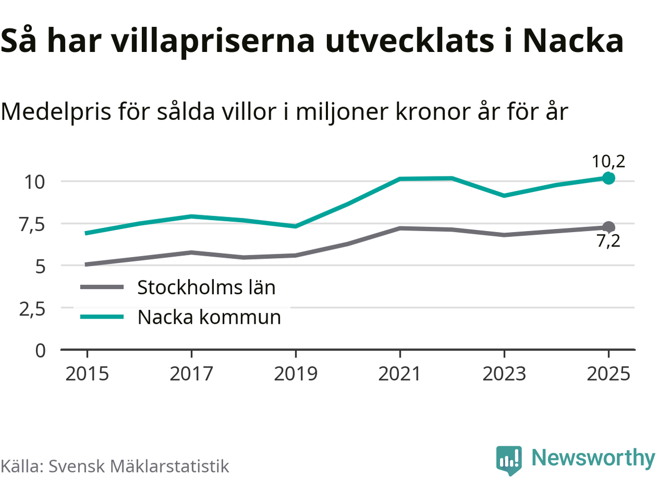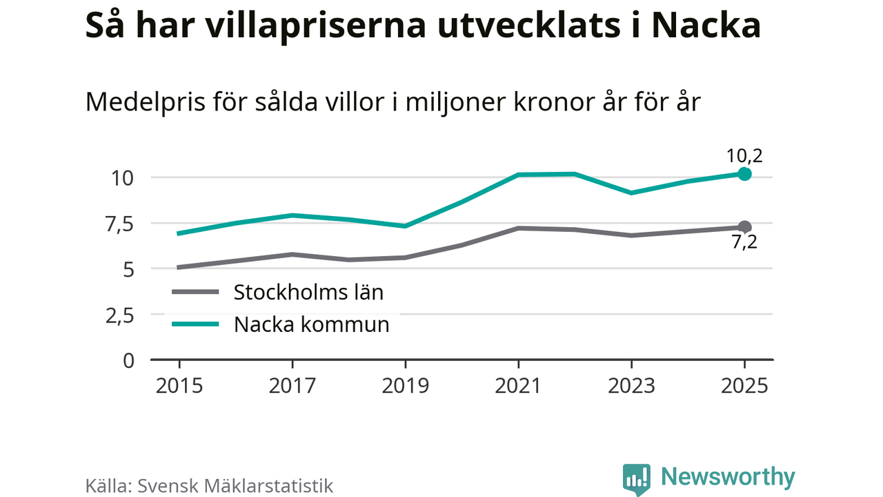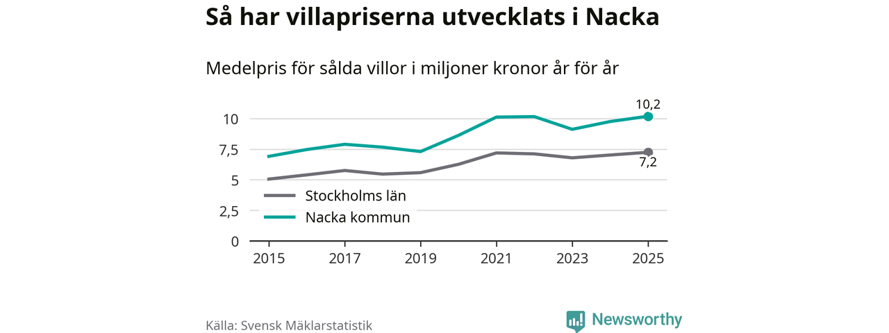 10,2 miljoner kronor är medelpriset för de villor som såldes i Nacka kommun under året, eller 73 067 kronor per kvadratmeter. Det innebär en prisökning med fyra procent på ett år. Det är det högsta årssnittet på åtminstone tio år. Bryter man upp siffrorna per kvartal har dock ännu högre villapriser noterats i Nacka vintern 2021/22.