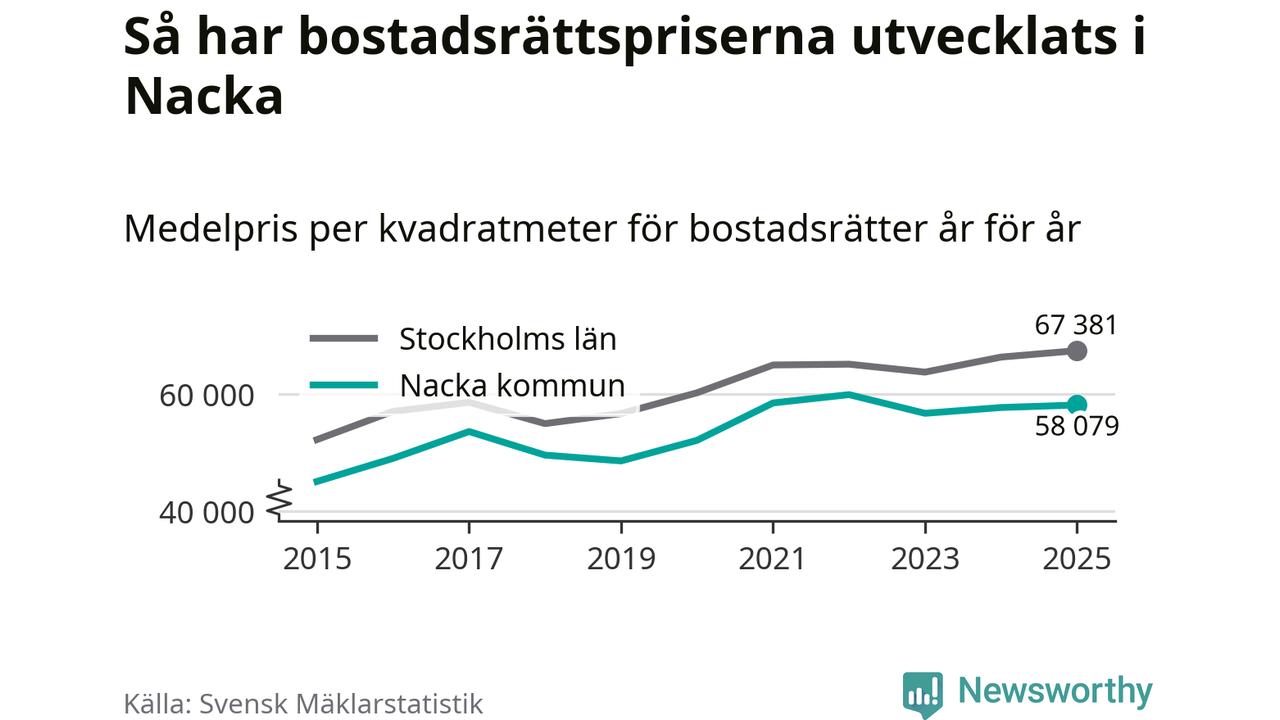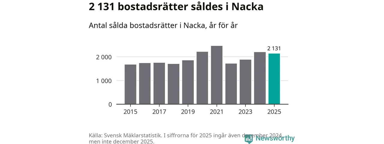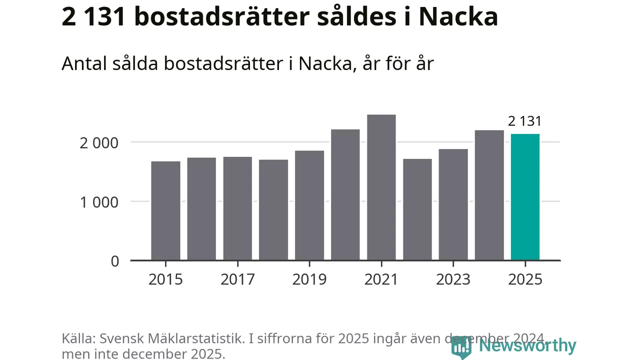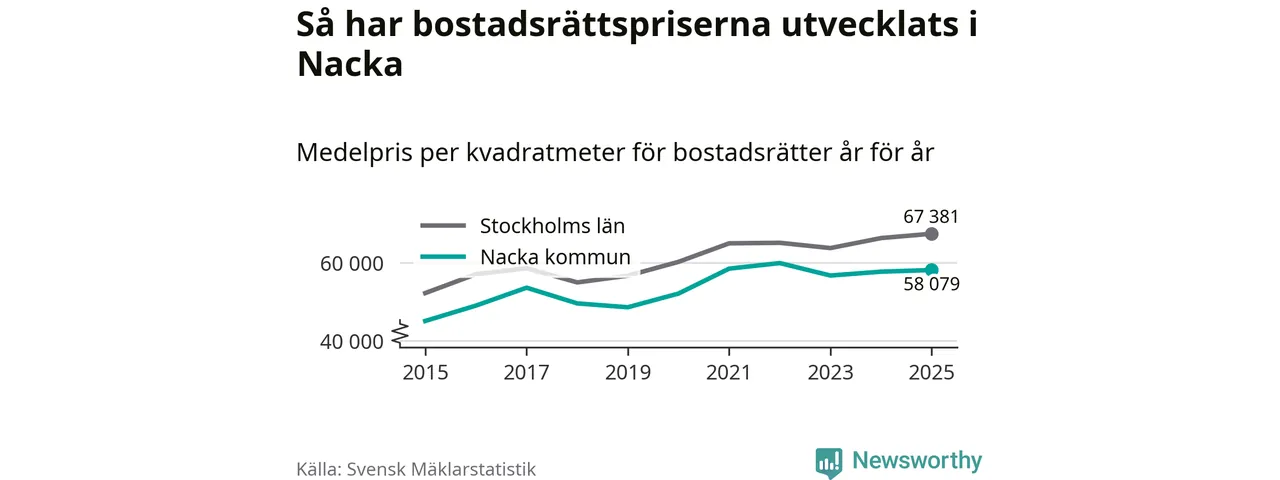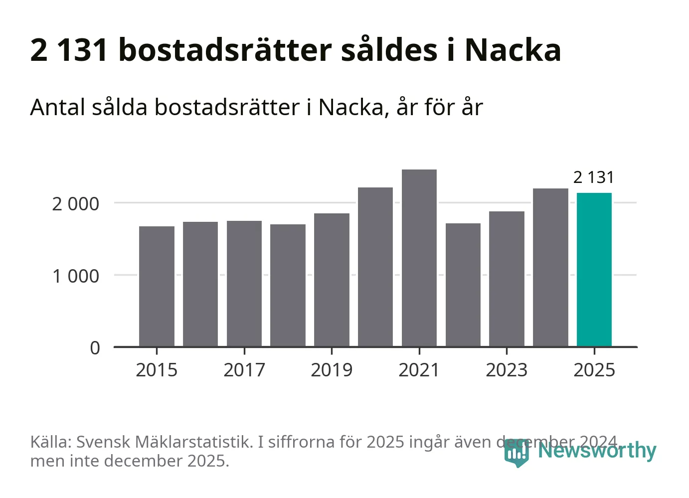 Det såldes totalt 2 131 bostadsrätter i Nacka kommun under året. Genomsnittspriset per kvadratmeter landade på 58 079 kronor, vilket är ungefär samma nivå som förra året.
