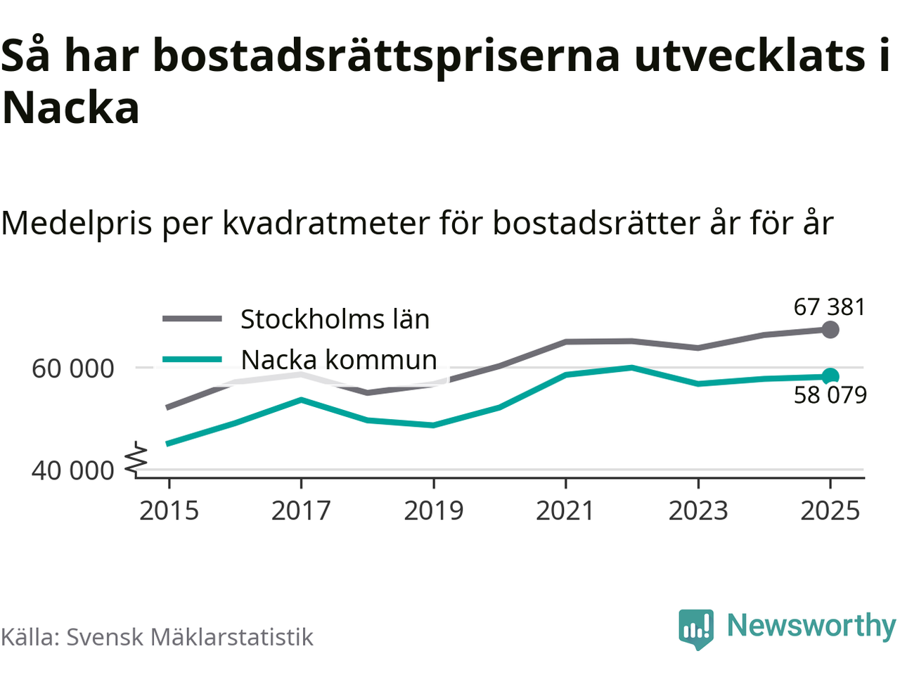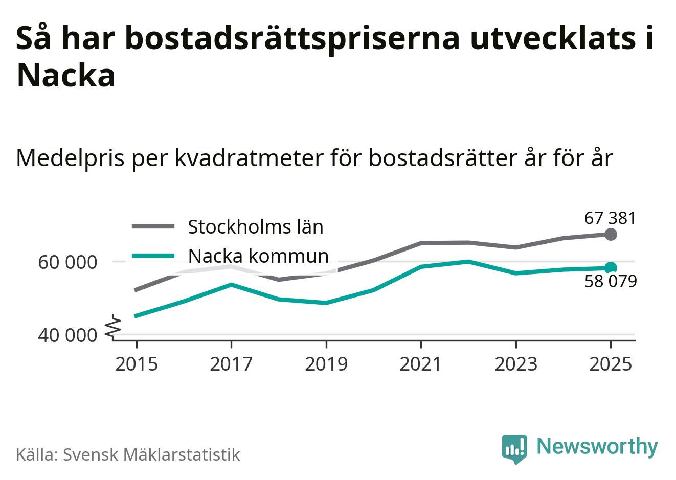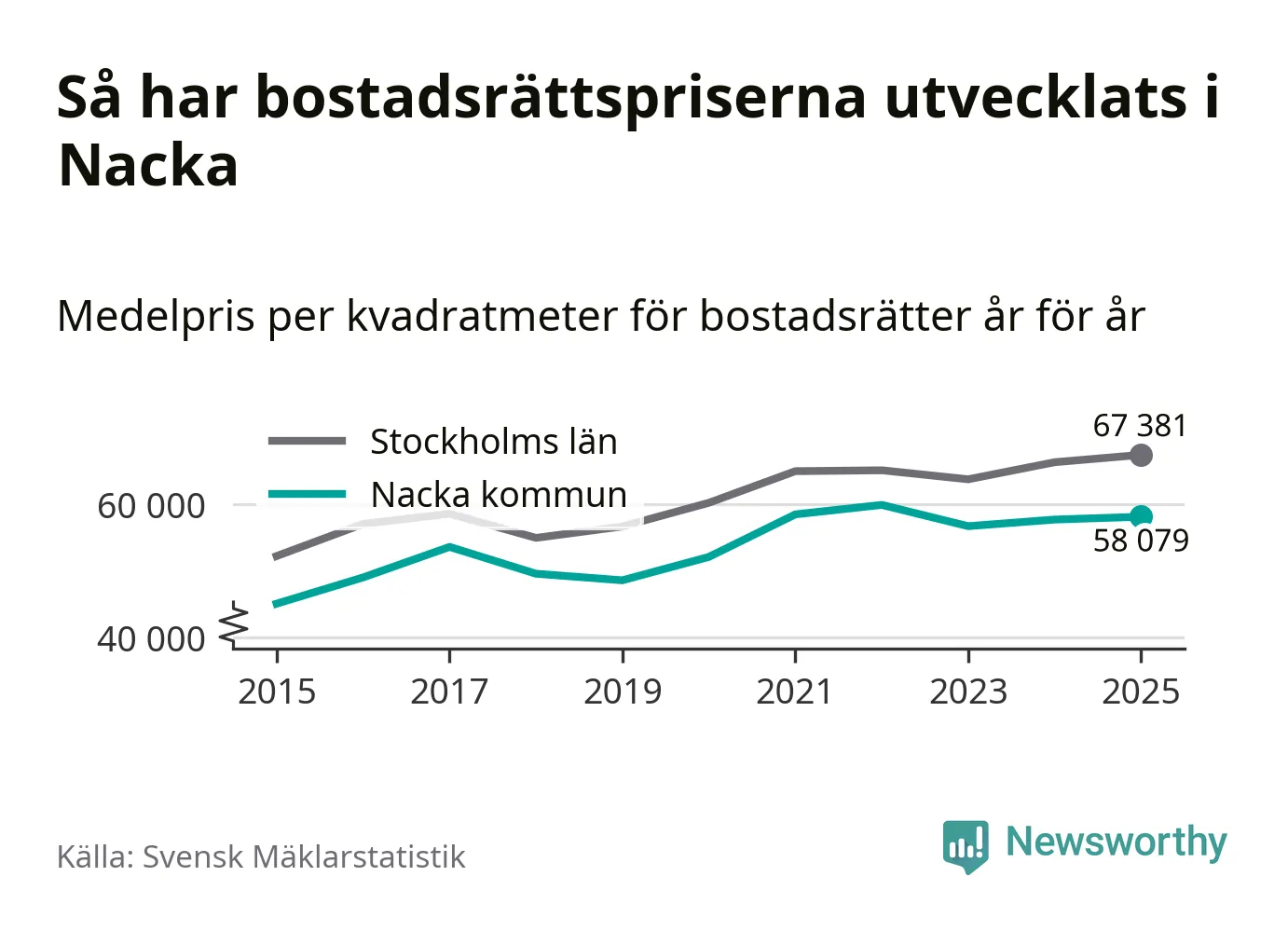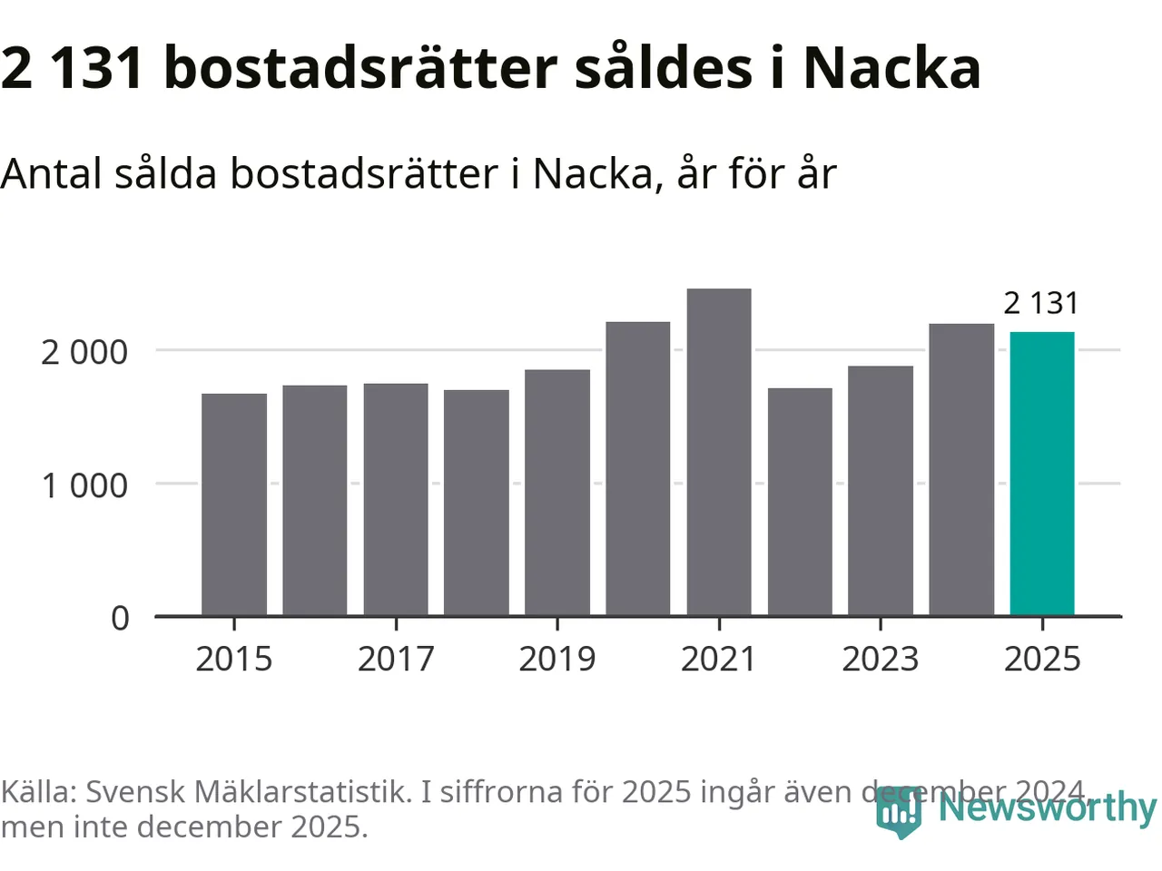 Det såldes totalt 2 131 bostadsrätter i Nacka kommun under året. Genomsnittspriset per kvadratmeter landade på 58 079 kronor, vilket är ungefär samma nivå som förra året.