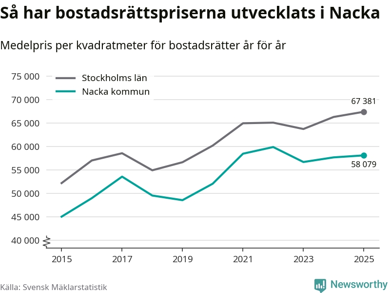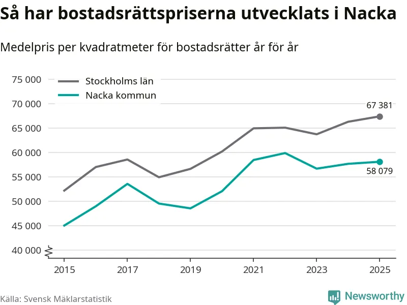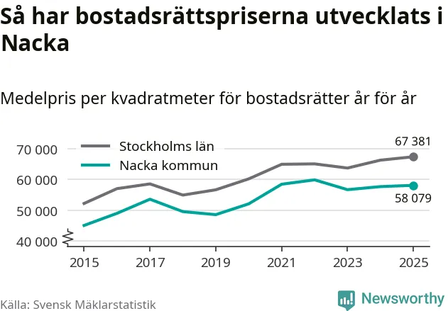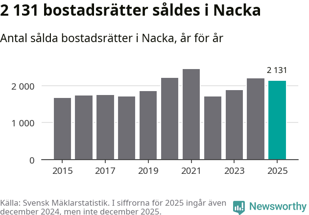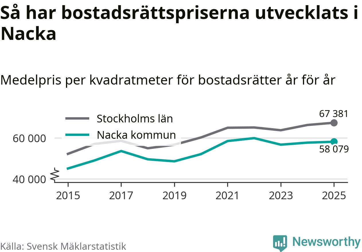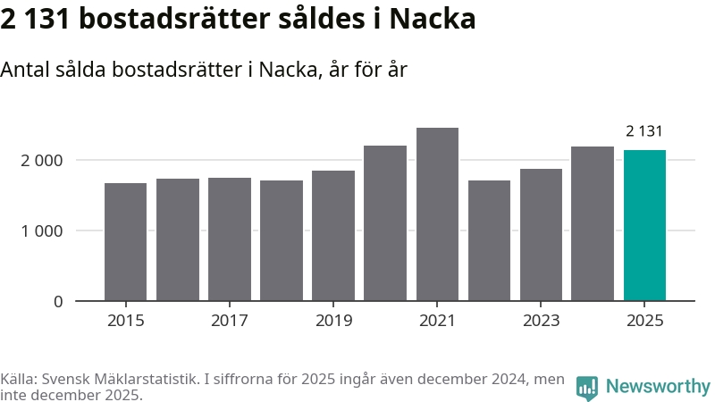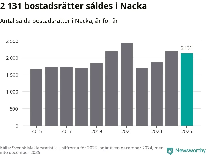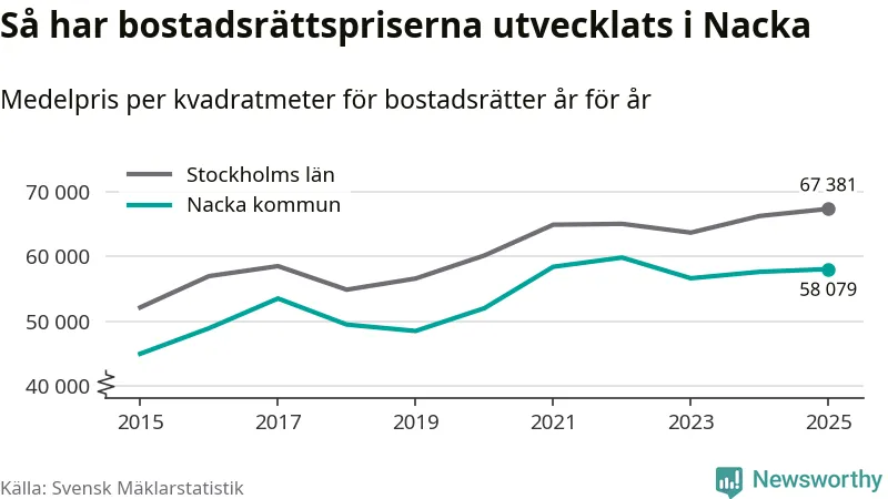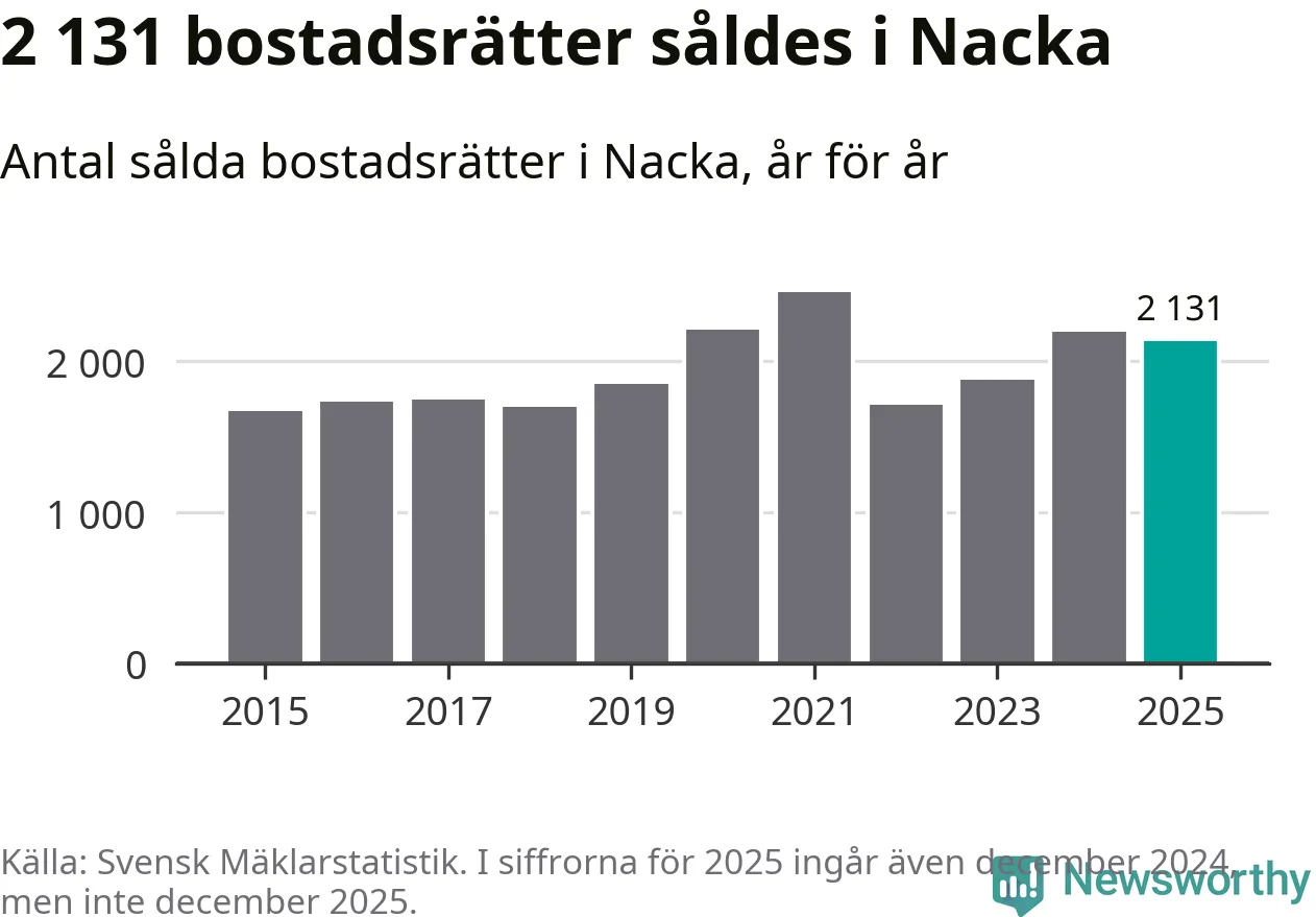 Det såldes totalt 2 131 bostadsrätter i Nacka kommun under året. Genomsnittspriset per kvadratmeter landade på 58 079 kronor, vilket är ungefär samma nivå som förra året.