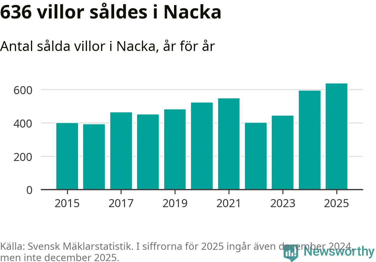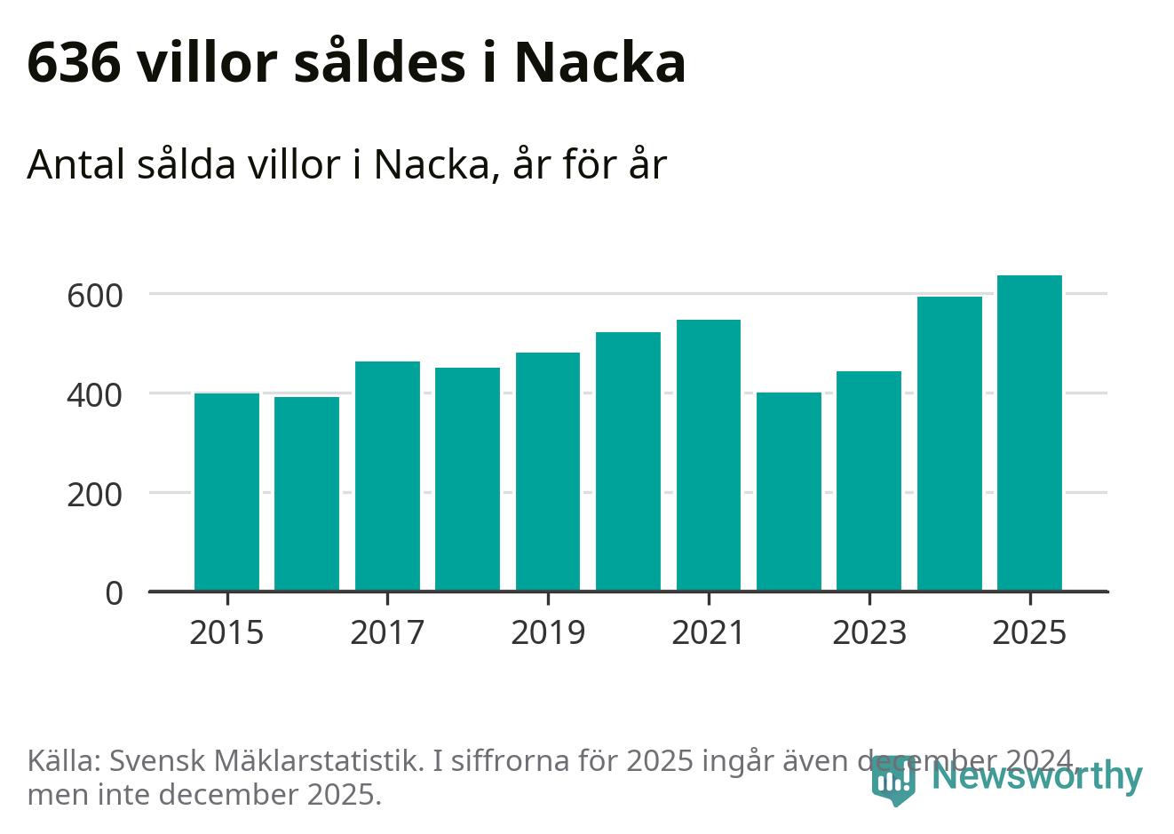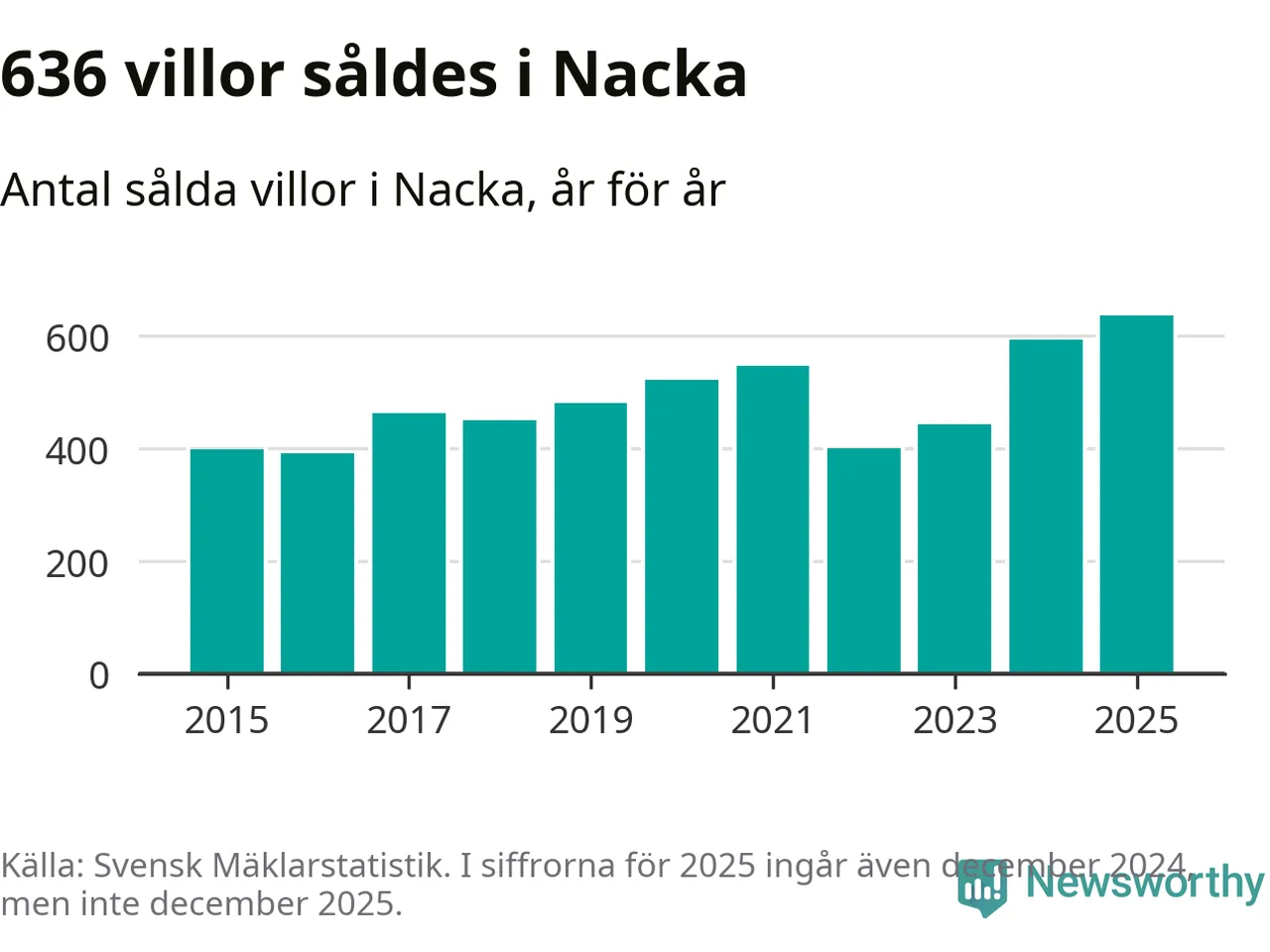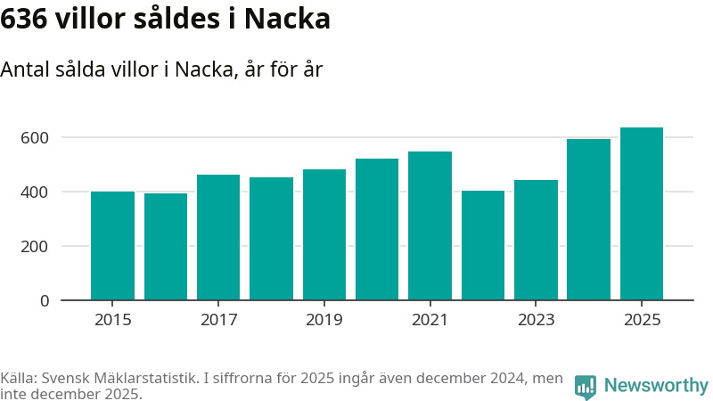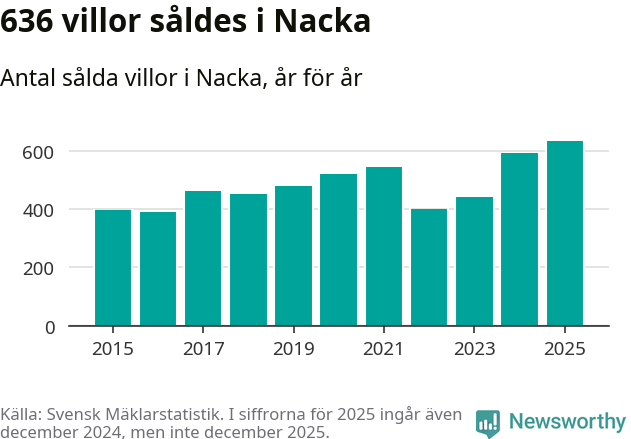 Antalet sålda villor ökade också. Totalt såldes 636 villor, att jämföra med 593 under 2024. Det är fler än något annat år sedan 2015.
