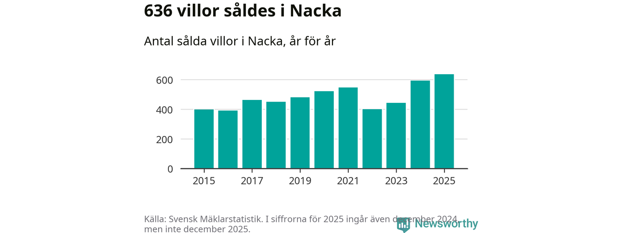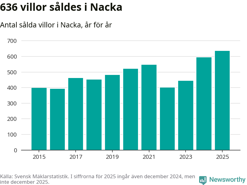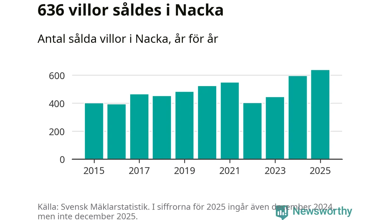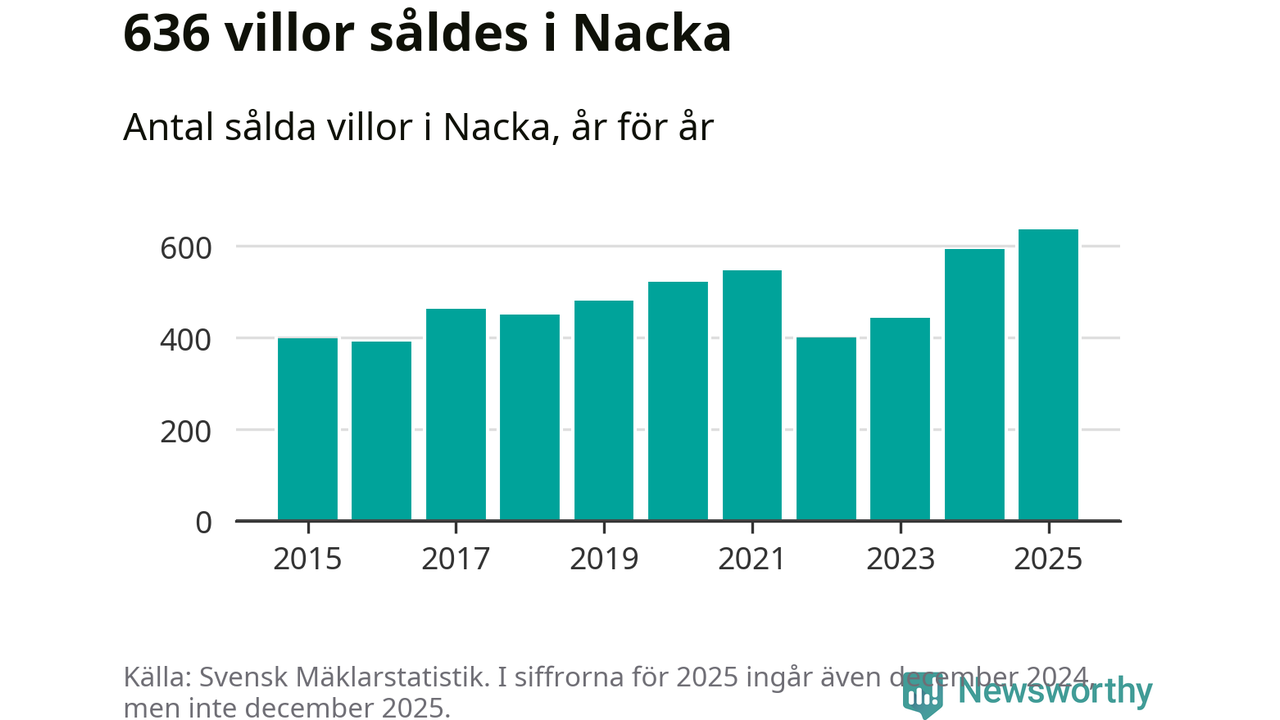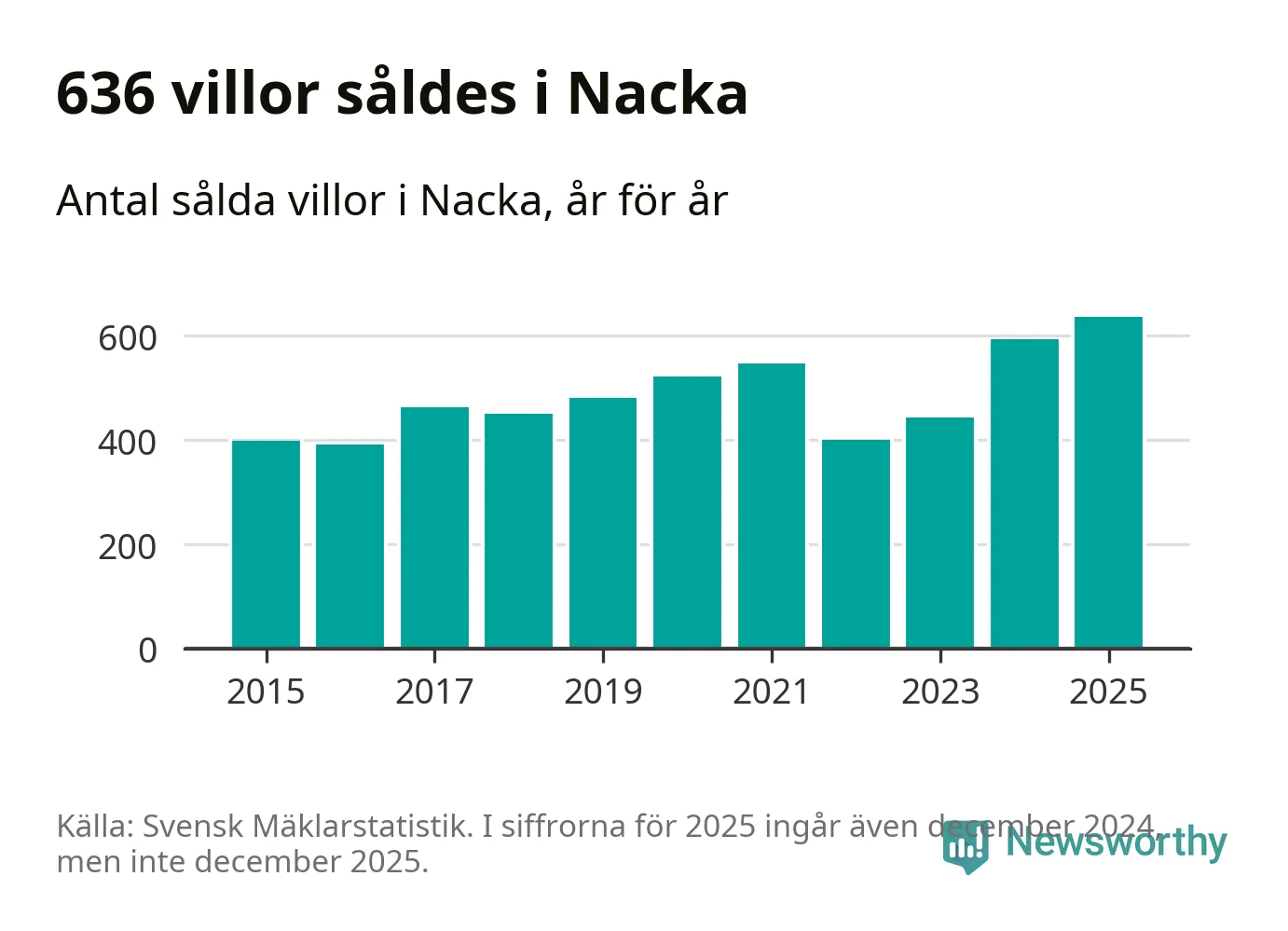 Antalet sålda villor ökade också. Totalt såldes 636 villor, att jämföra med 593 under 2024. Det är fler än något annat år sedan 2015.