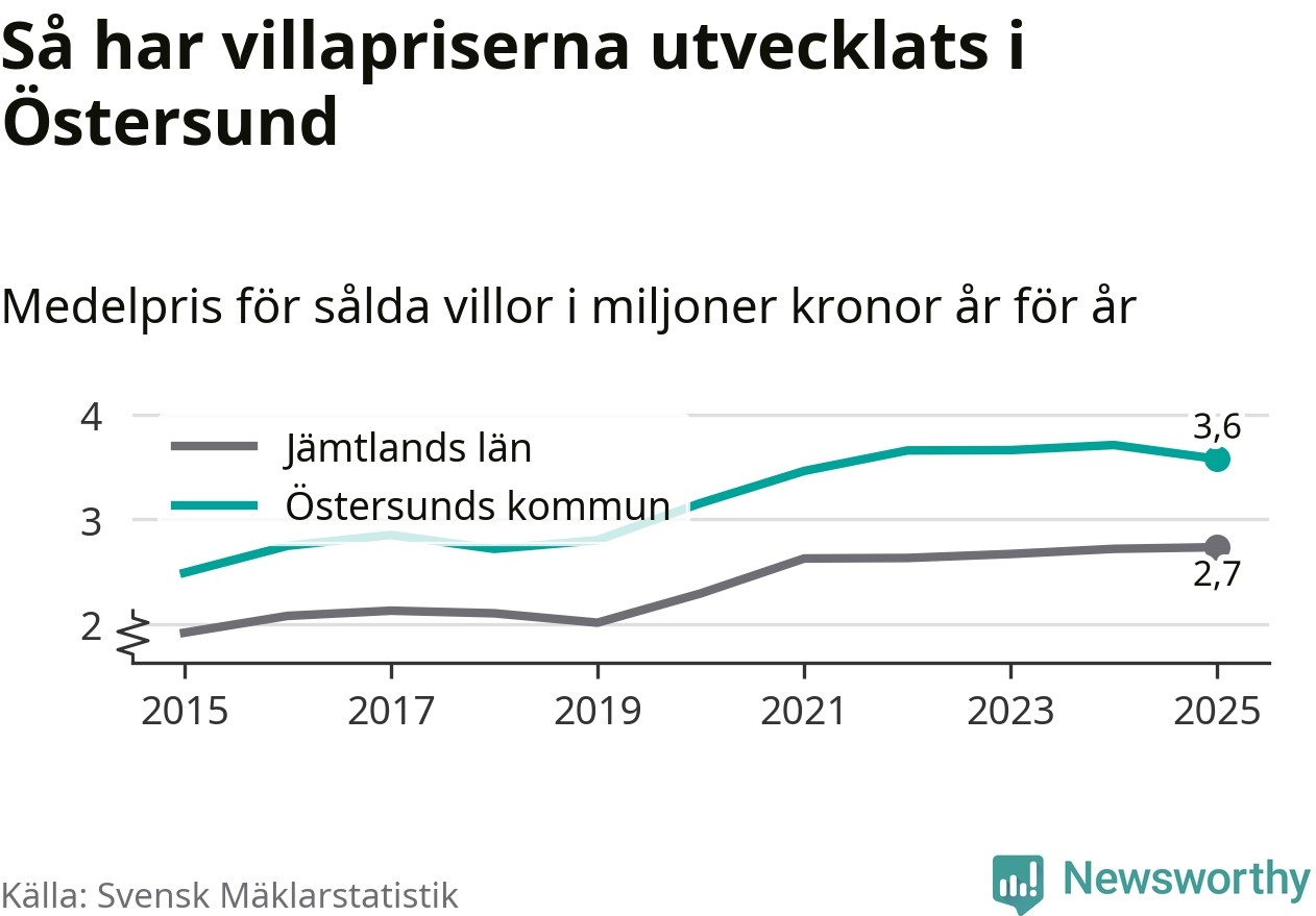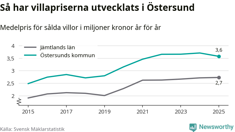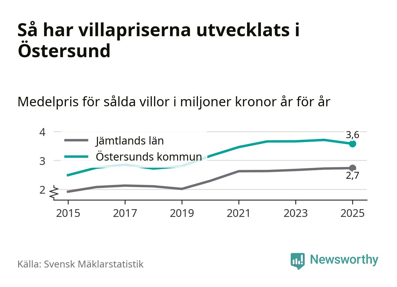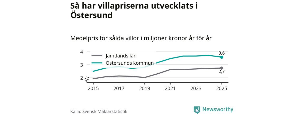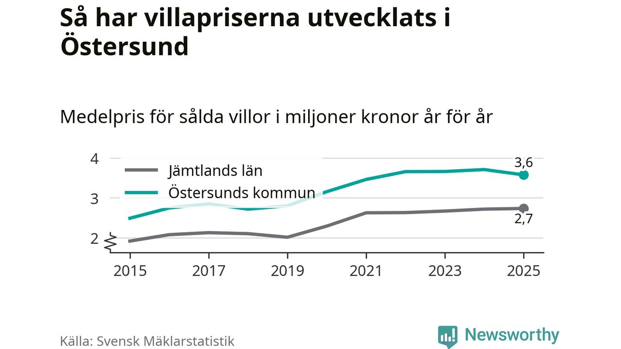 3,6 miljoner kronor är medelpriset för de villor som såldes i Östersunds kommun under året, eller 28 870 kronor per kvadratmeter. Det innebär en prisminskning med fyra procent på ett år.