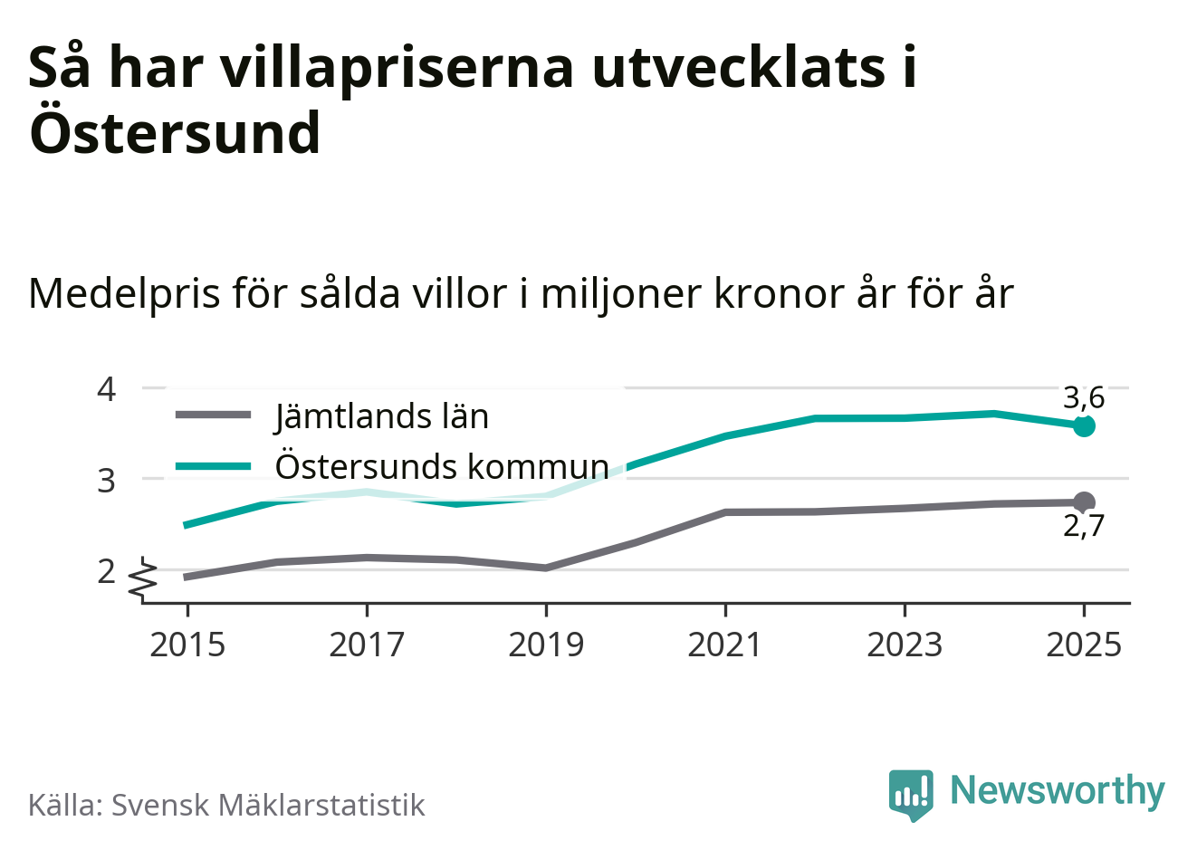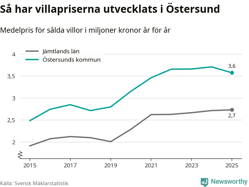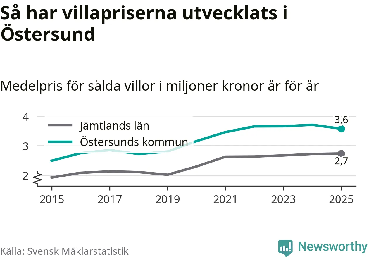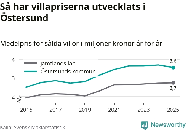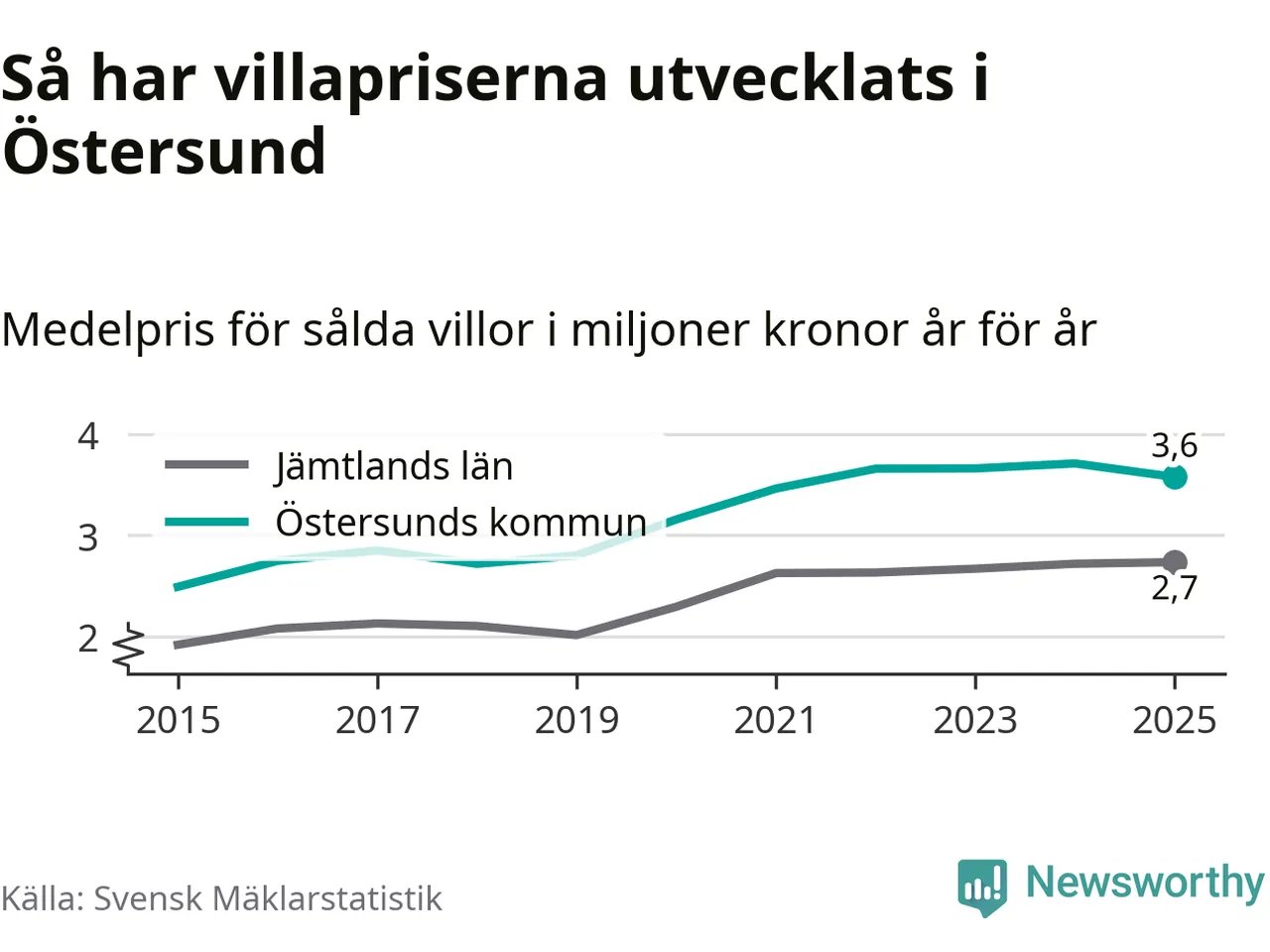 3,6 miljoner kronor är medelpriset för de villor som såldes i Östersunds kommun under året, eller 28 870 kronor per kvadratmeter. Det innebär en prisminskning med fyra procent på ett år.
