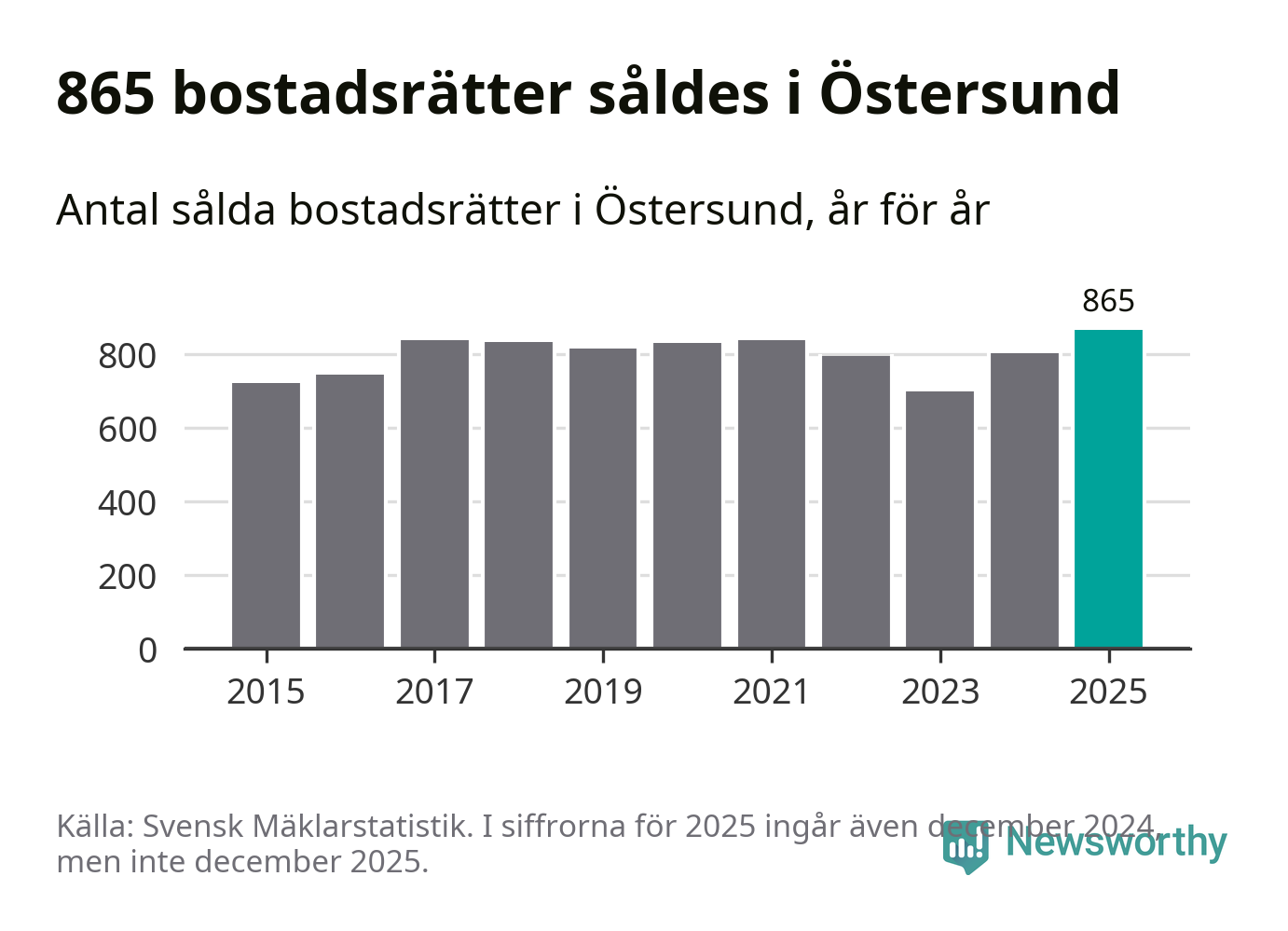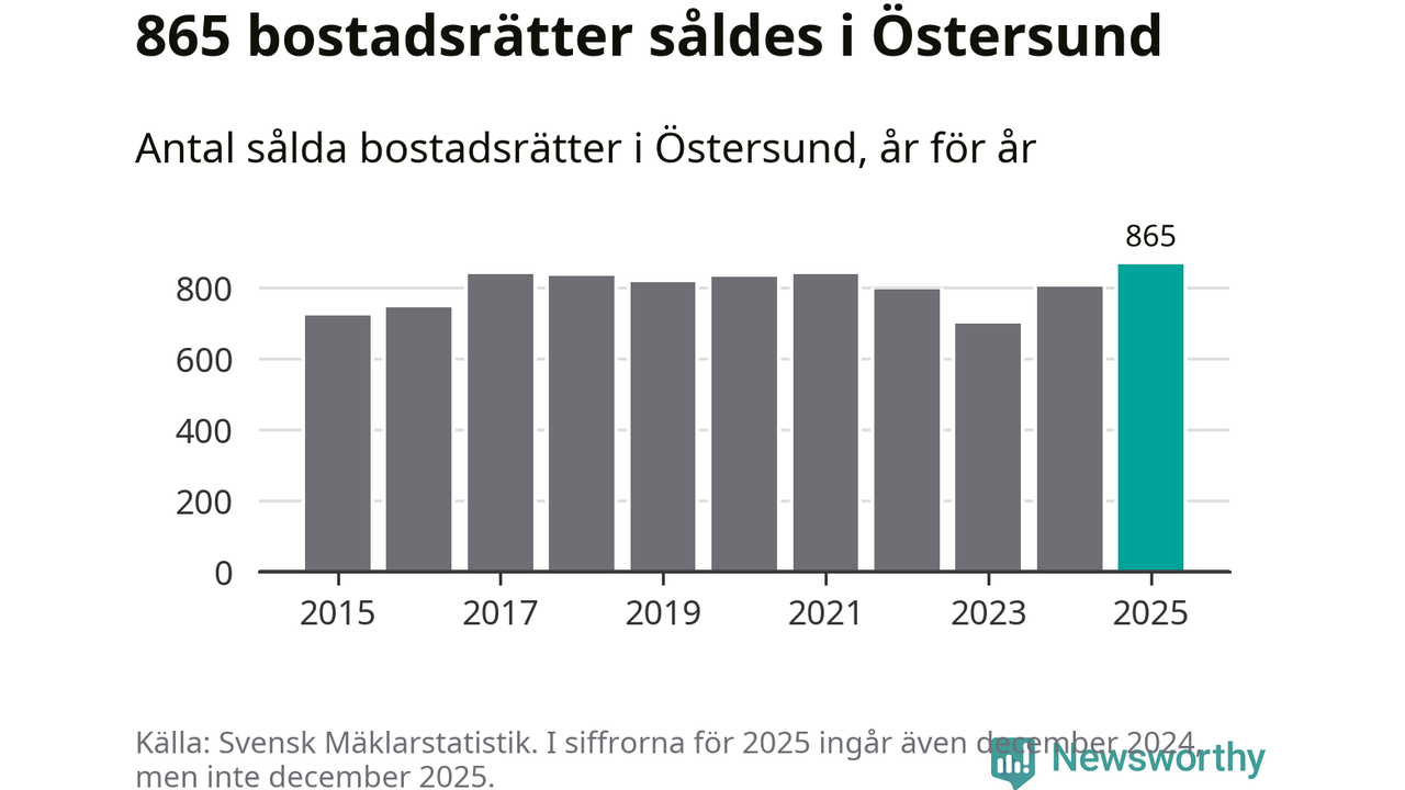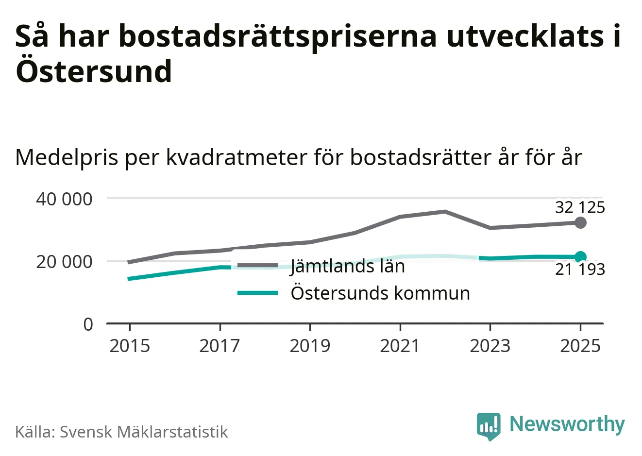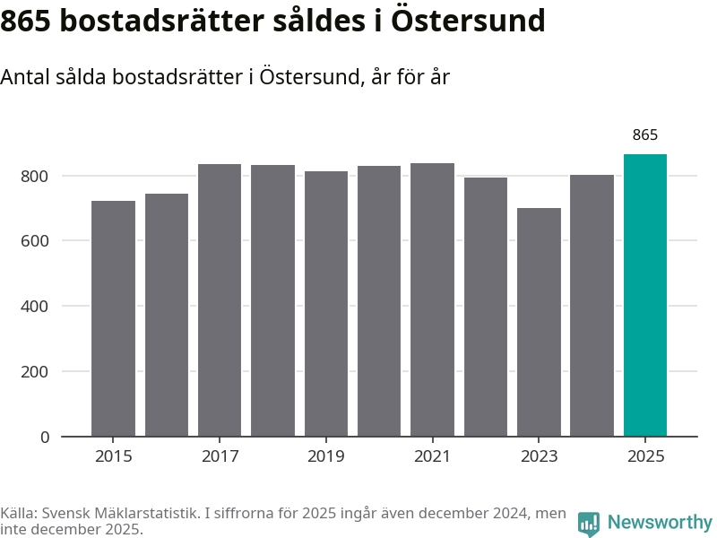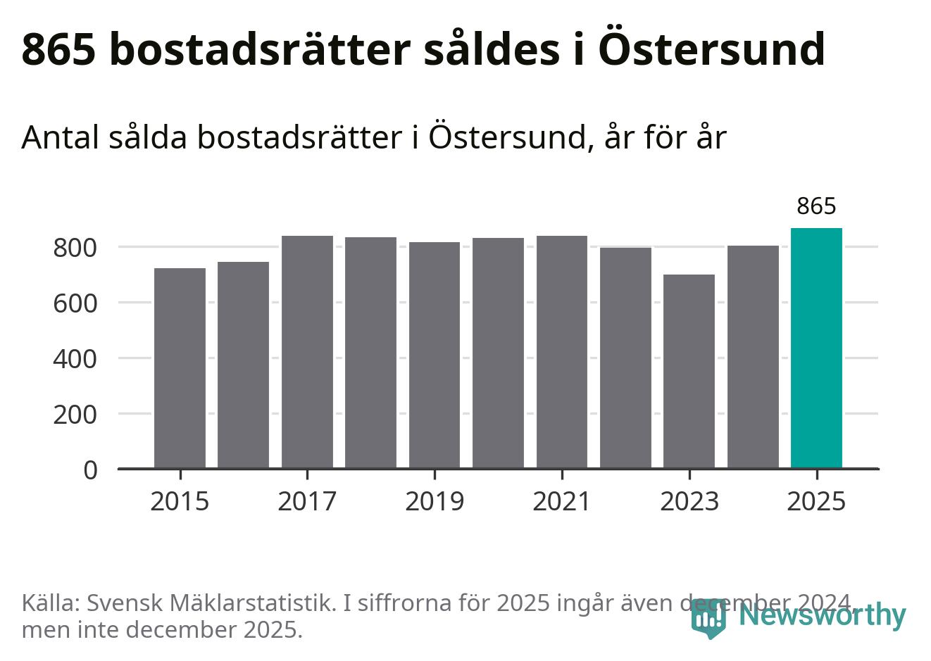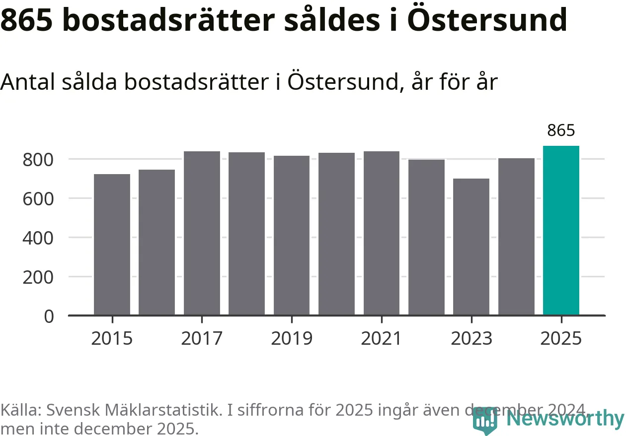 Det såldes totalt 865 bostadsrätter i Östersunds kommun under året. Det är fler än något annat år sedan 2015. Genomsnittspriset per kvadratmeter landade på 21 193 kronor, vilket är ungefär samma nivå som förra året.