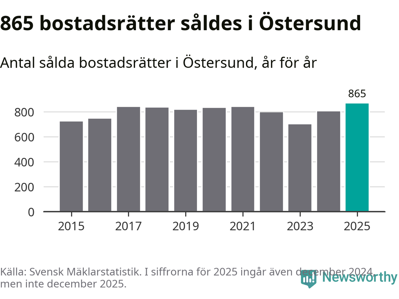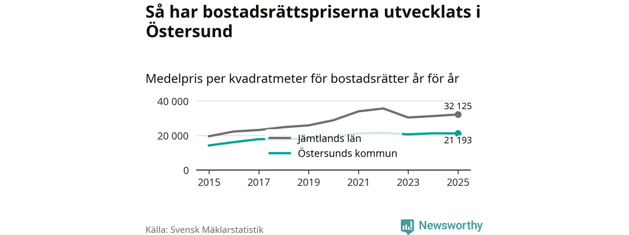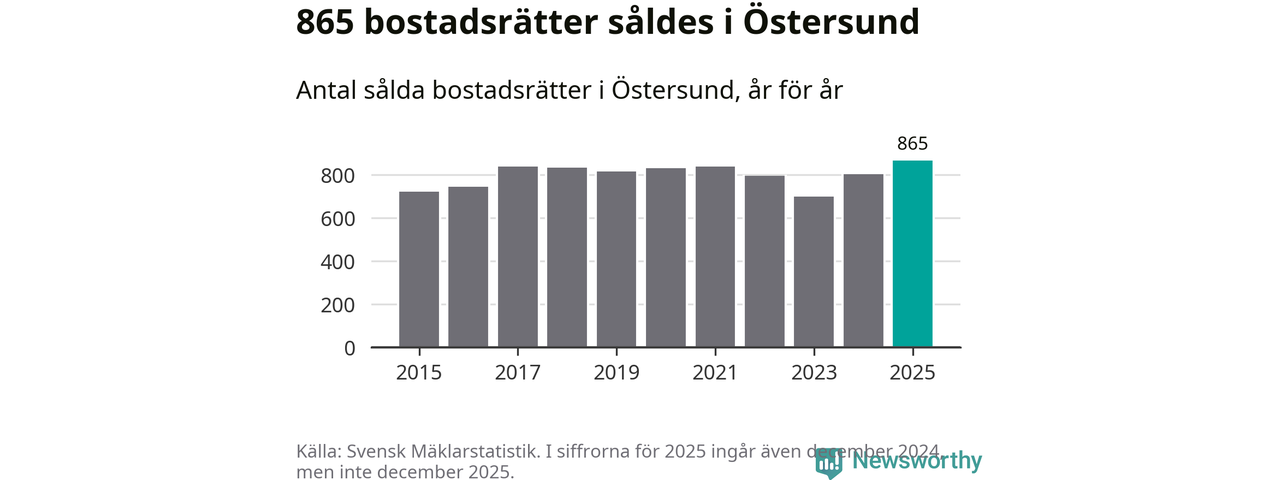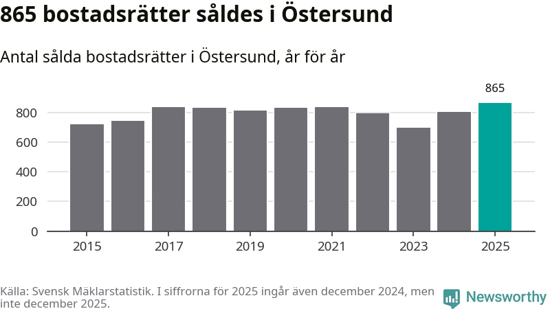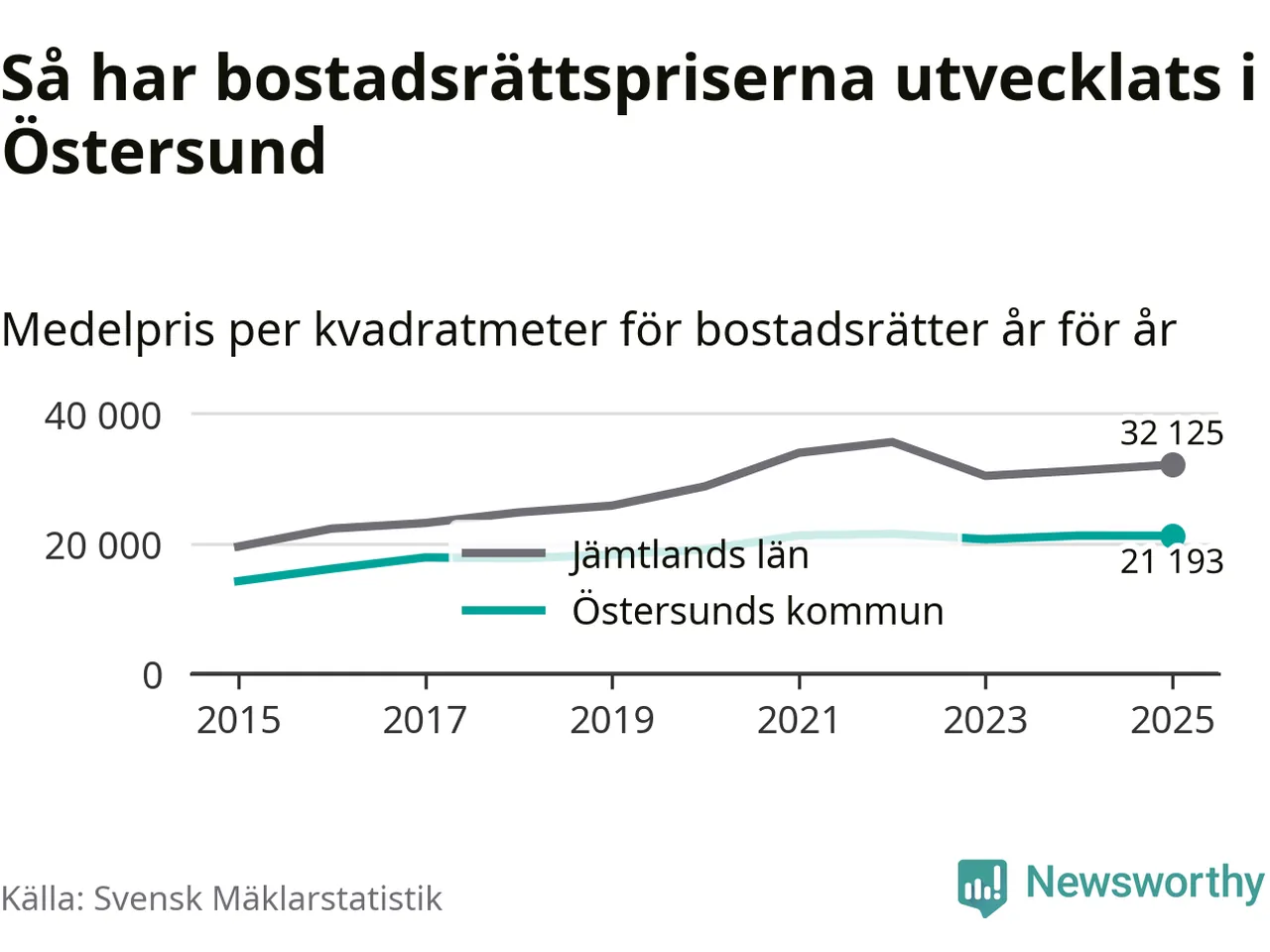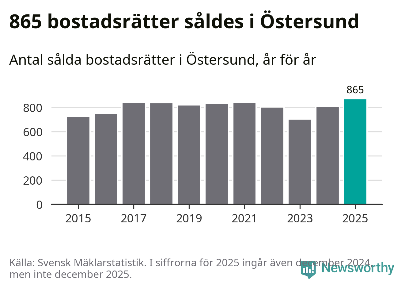 Det såldes totalt 865 bostadsrätter i Östersunds kommun under året. Det är fler än något annat år sedan 2015. Genomsnittspriset per kvadratmeter landade på 21 193 kronor, vilket är ungefär samma nivå som förra året.