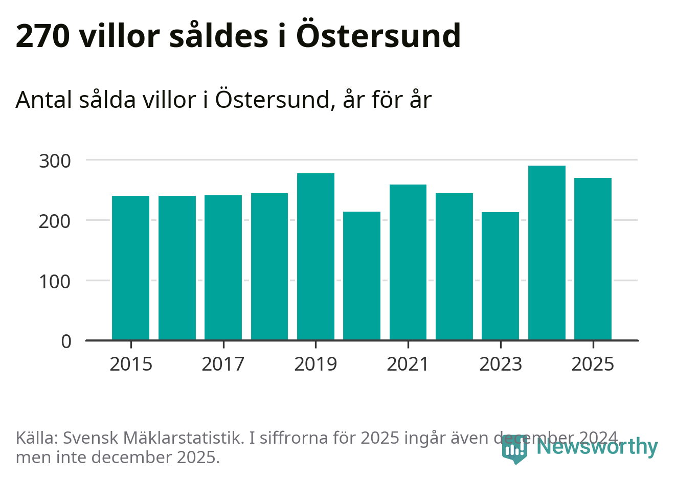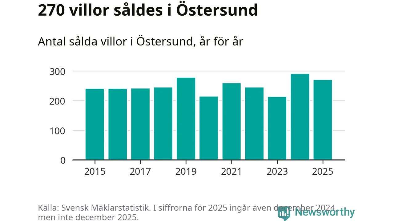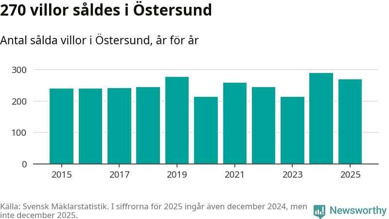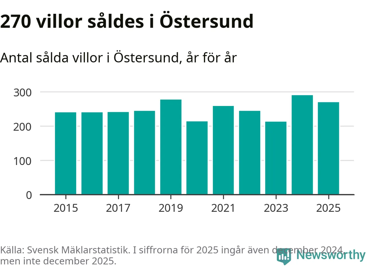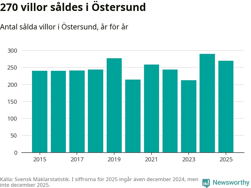 Antalet sålda villor minskade också. Totalt såldes 270 villor, att jämföra med 290 under 2024.
