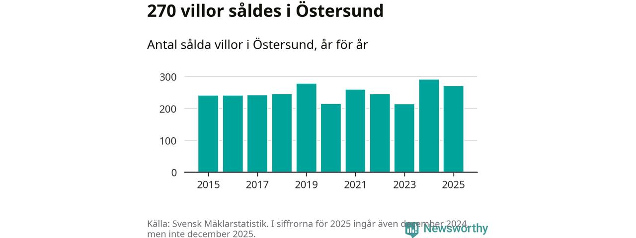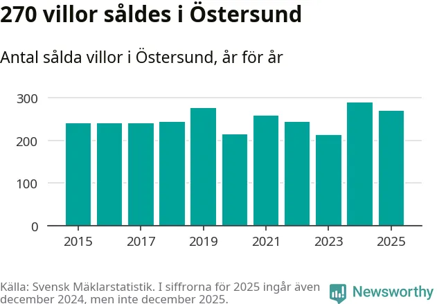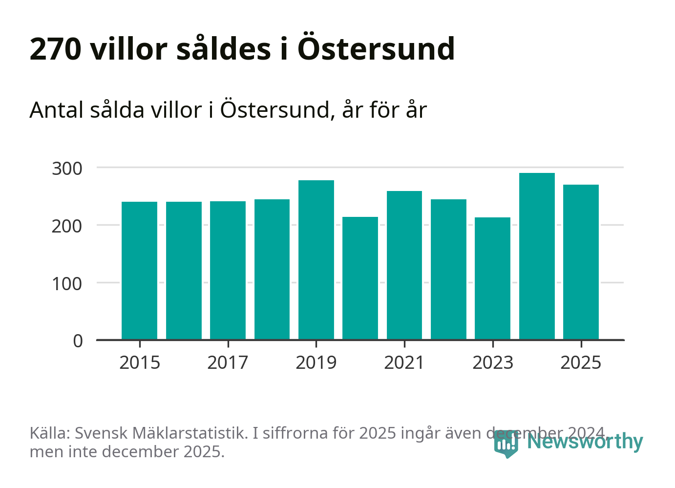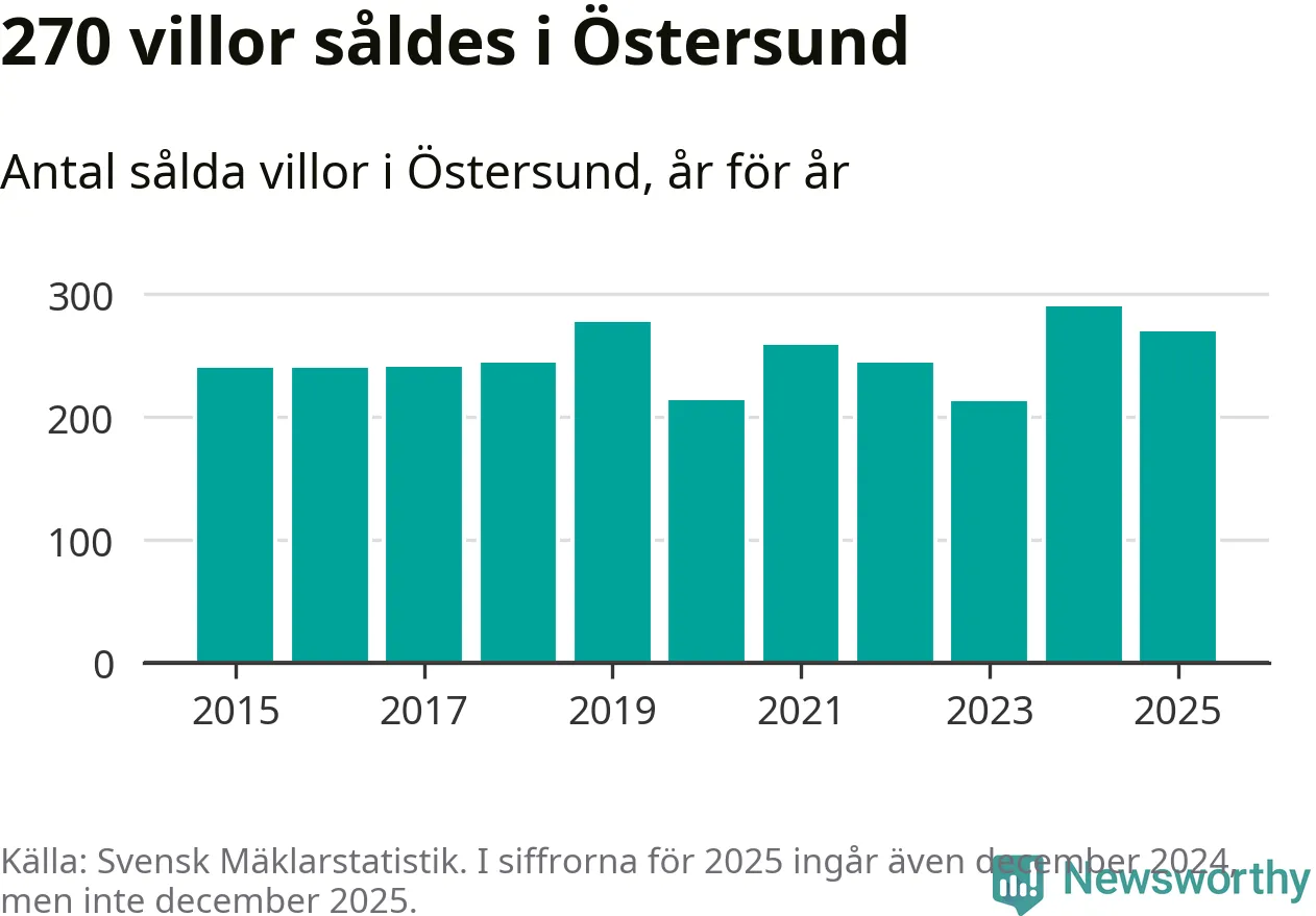 Antalet sålda villor minskade också. Totalt såldes 270 villor, att jämföra med 290 under 2024.