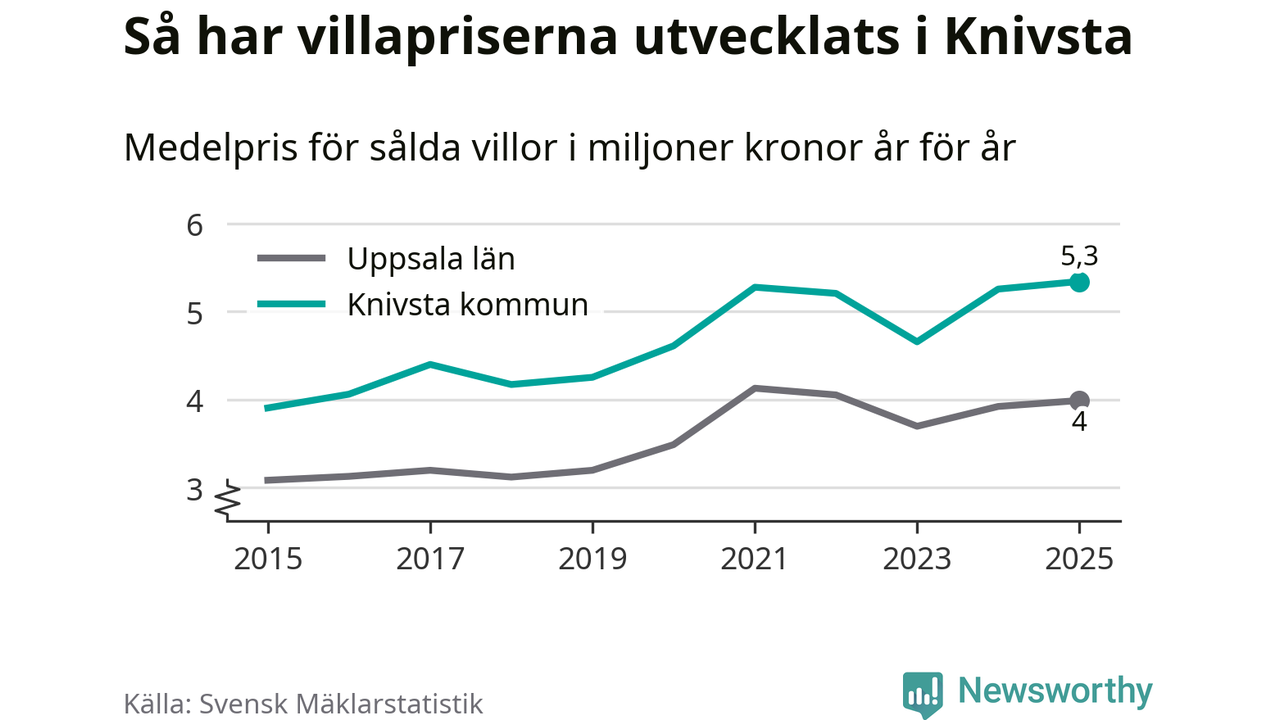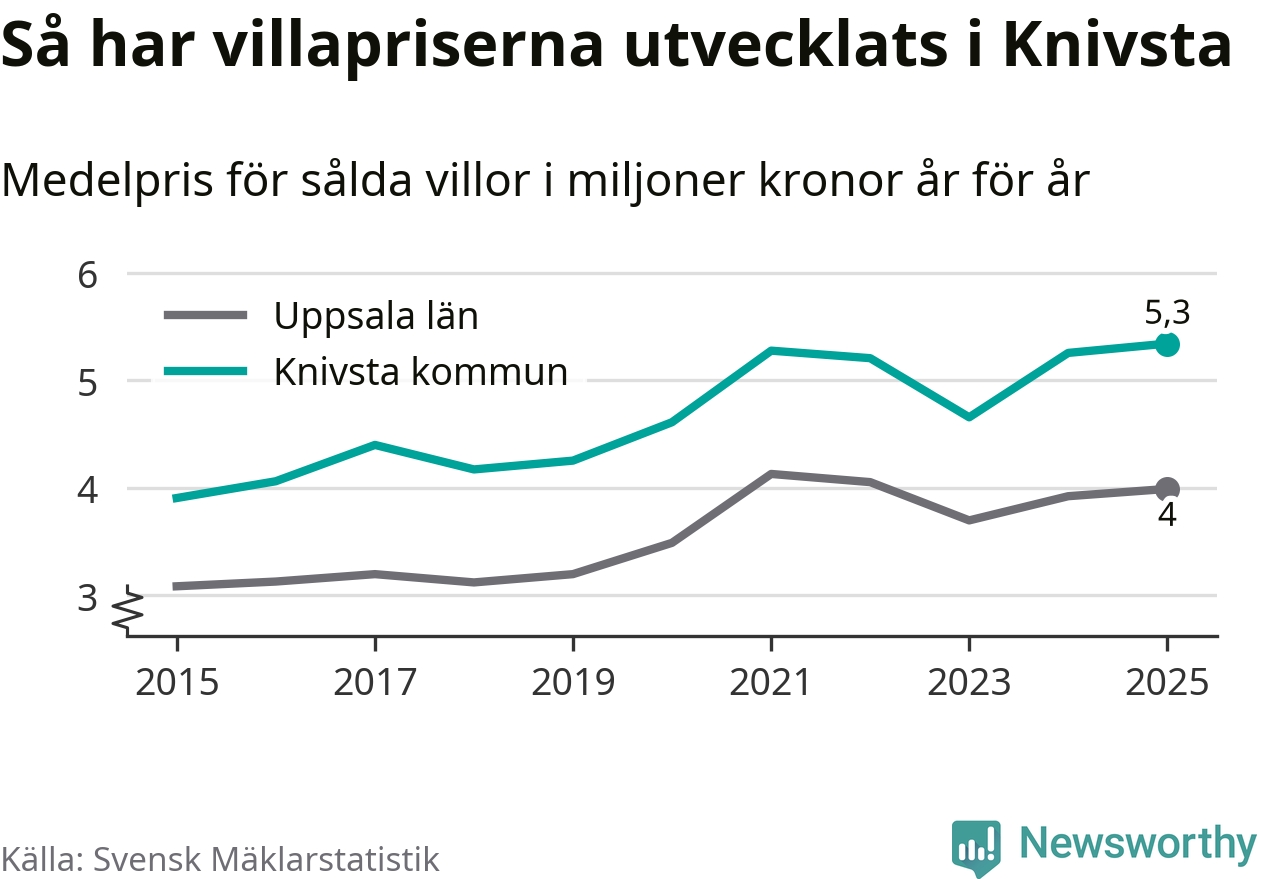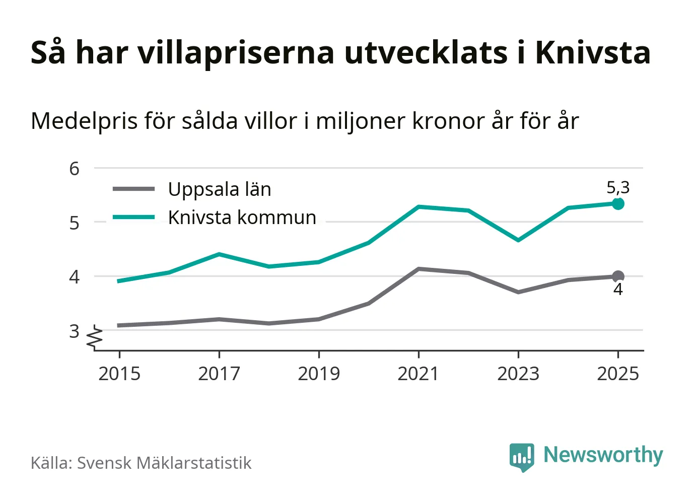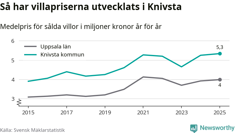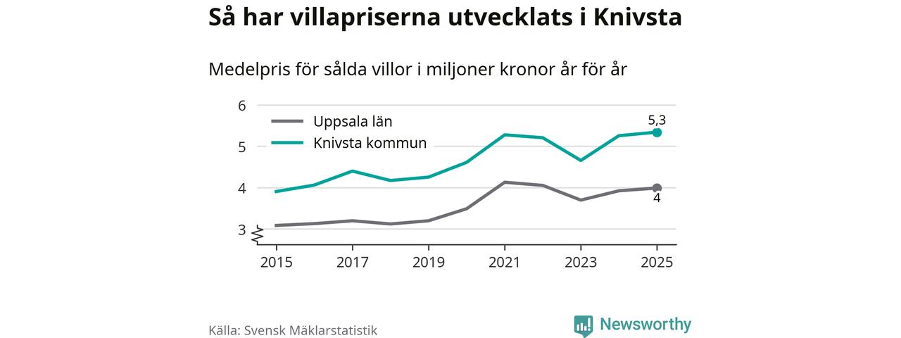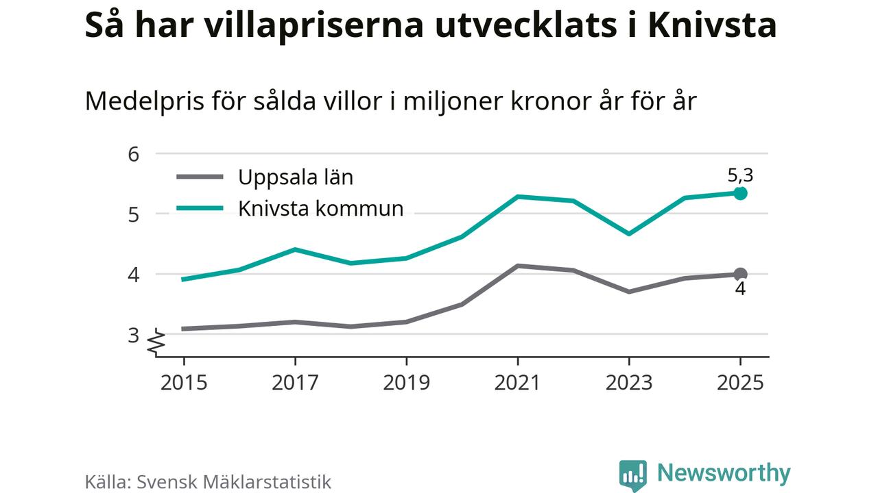 5,3 miljoner kronor är medelpriset för de villor som såldes i Knivsta kommun under året, eller 37 626 kronor per kvadratmeter. Det innebär en prisökning med två procent på ett år. Det är det högsta årssnittet på åtminstone tio år.