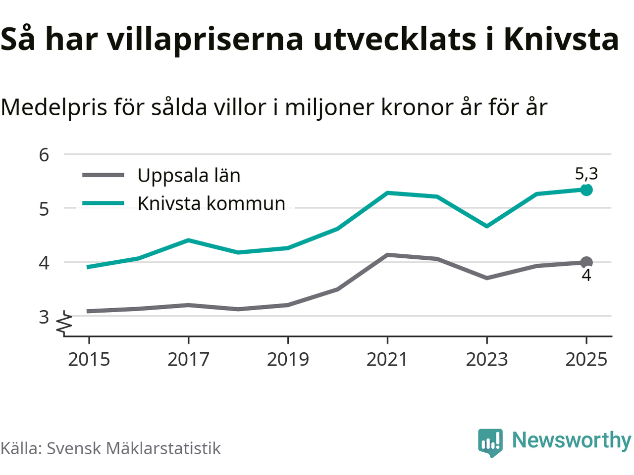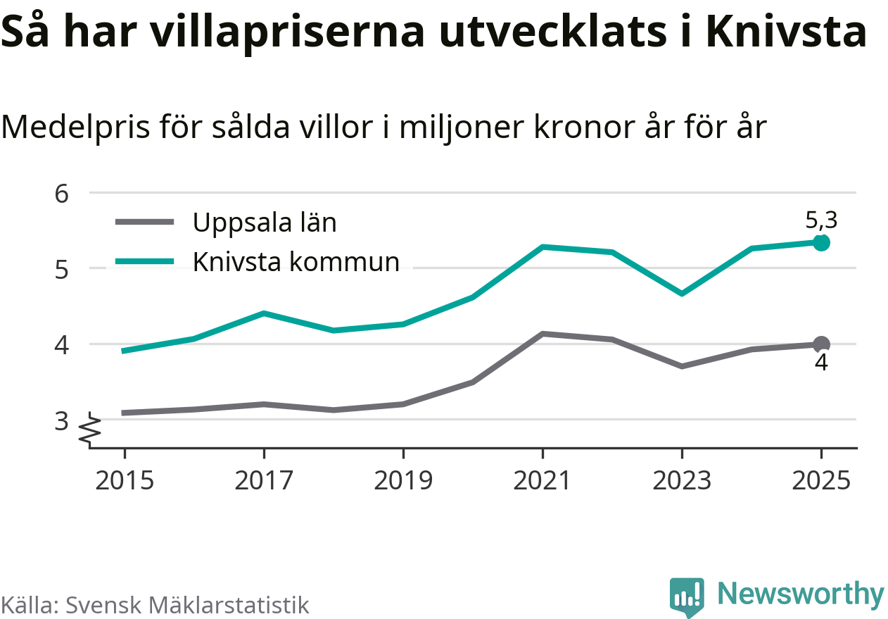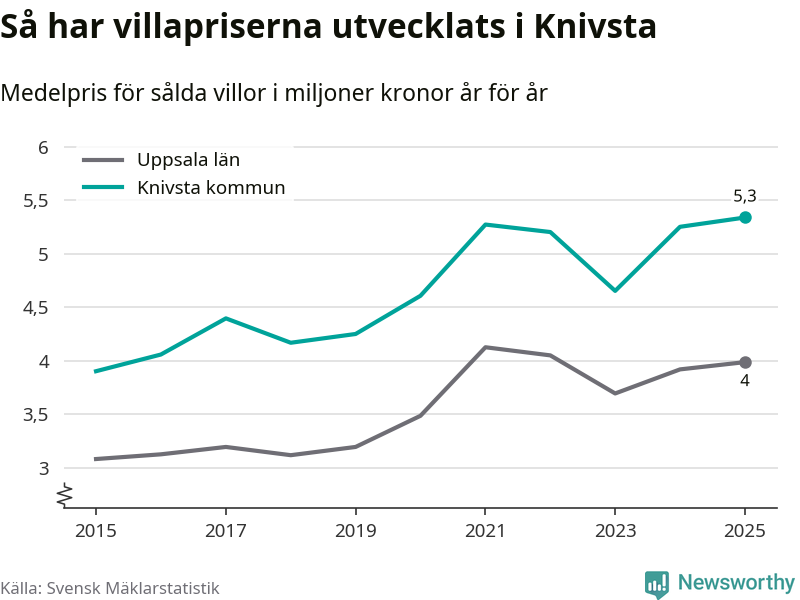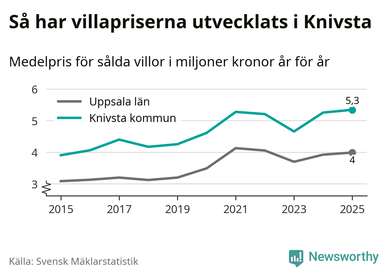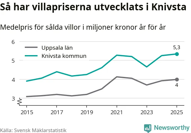 5,3 miljoner kronor är medelpriset för de villor som såldes i Knivsta kommun under året, eller 37 626 kronor per kvadratmeter. Det innebär en prisökning med två procent på ett år. Det är det högsta årssnittet på åtminstone tio år.