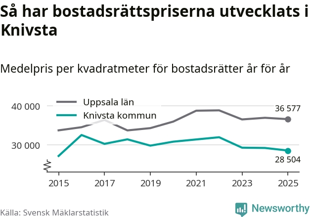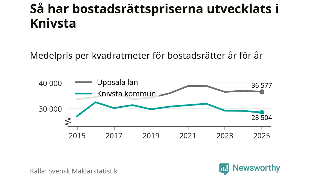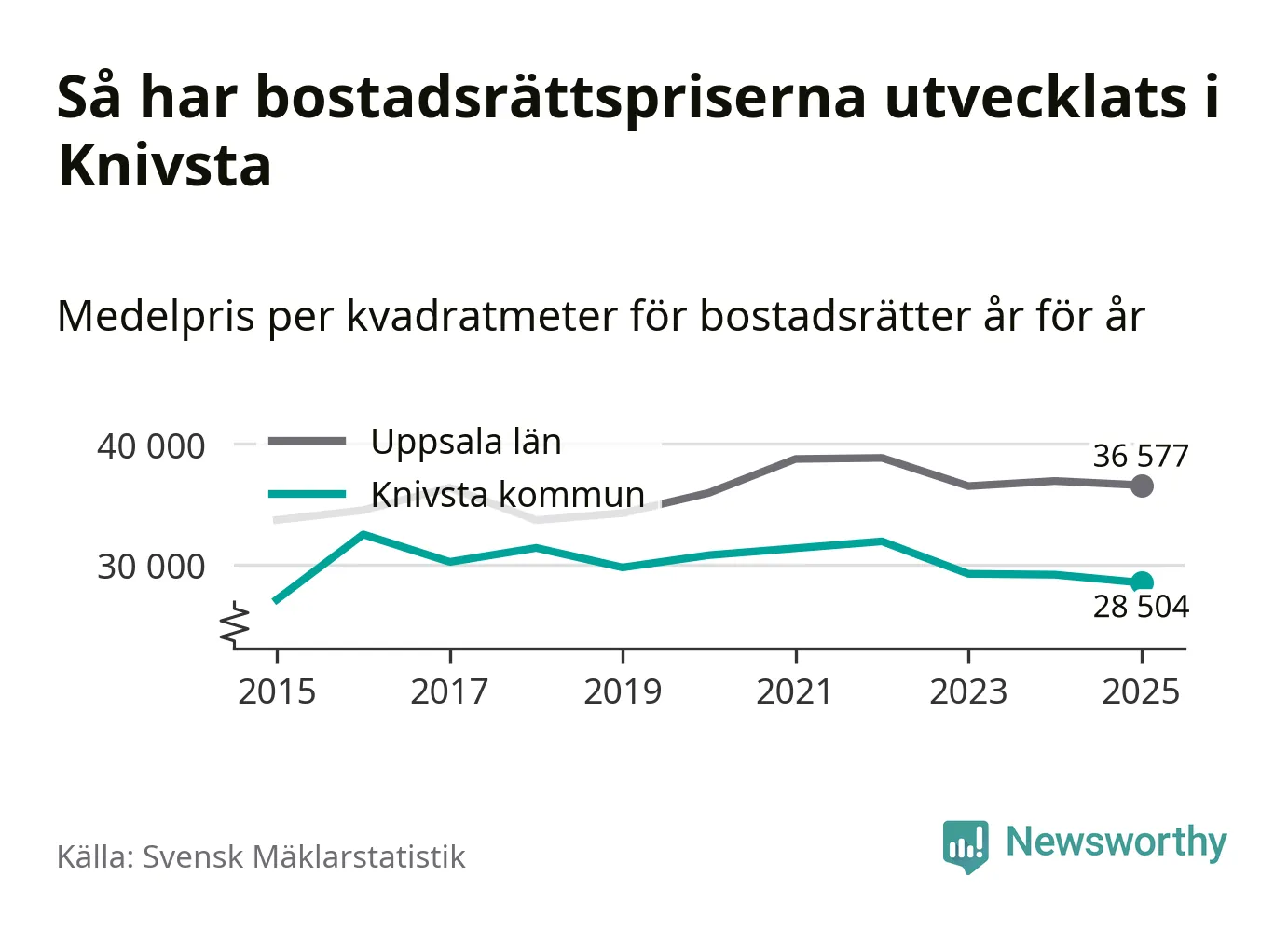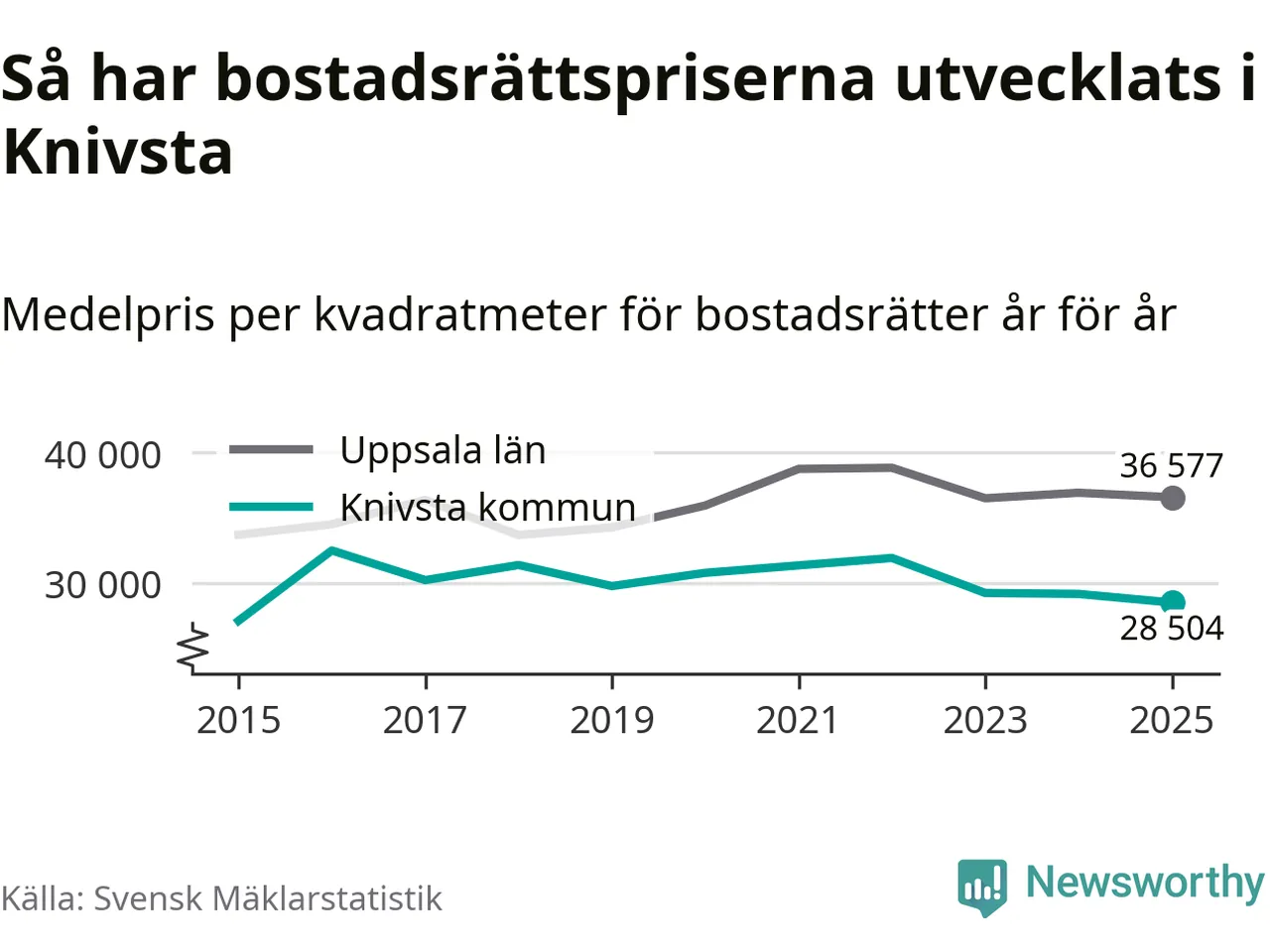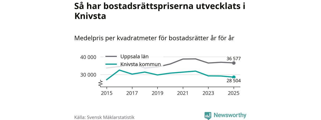 Det såldes totalt 221 bostadsrätter i Knivsta kommun under året. Genomsnittspriset per kvadratmeter landade på 28 504 kronor. Det är en minskning med två procent i kommunen på ett år.