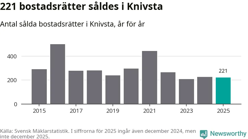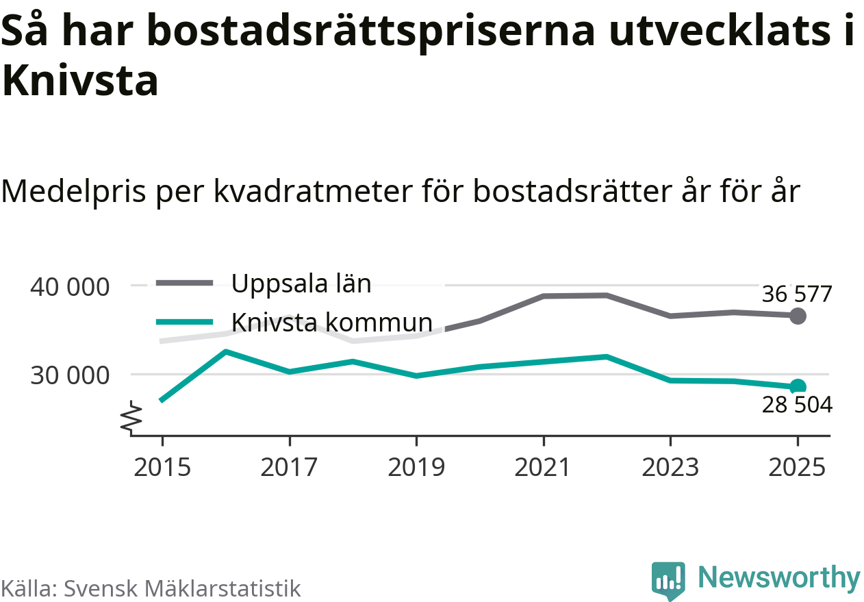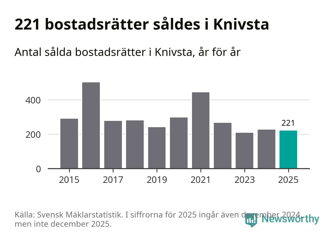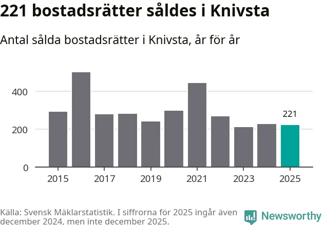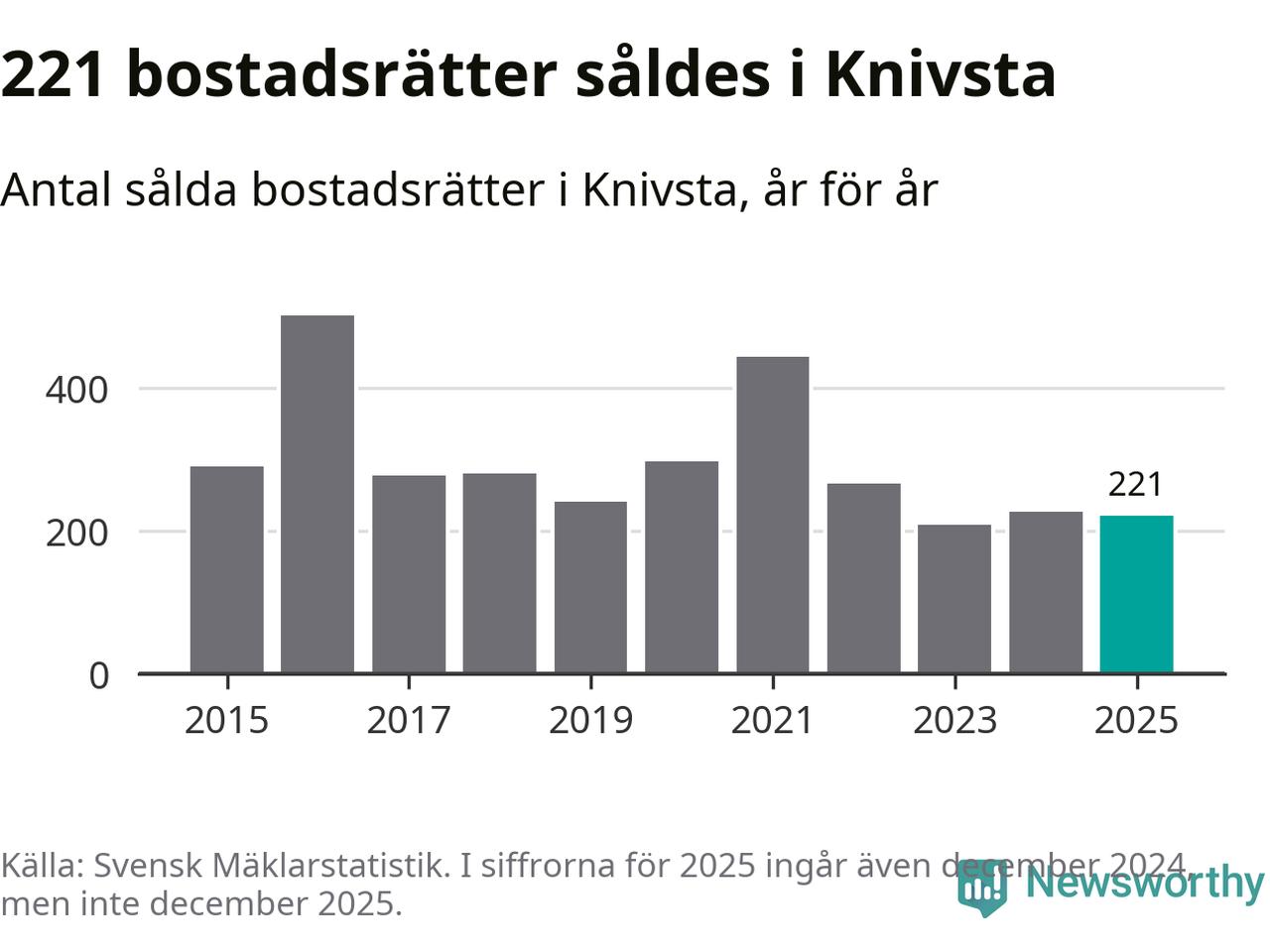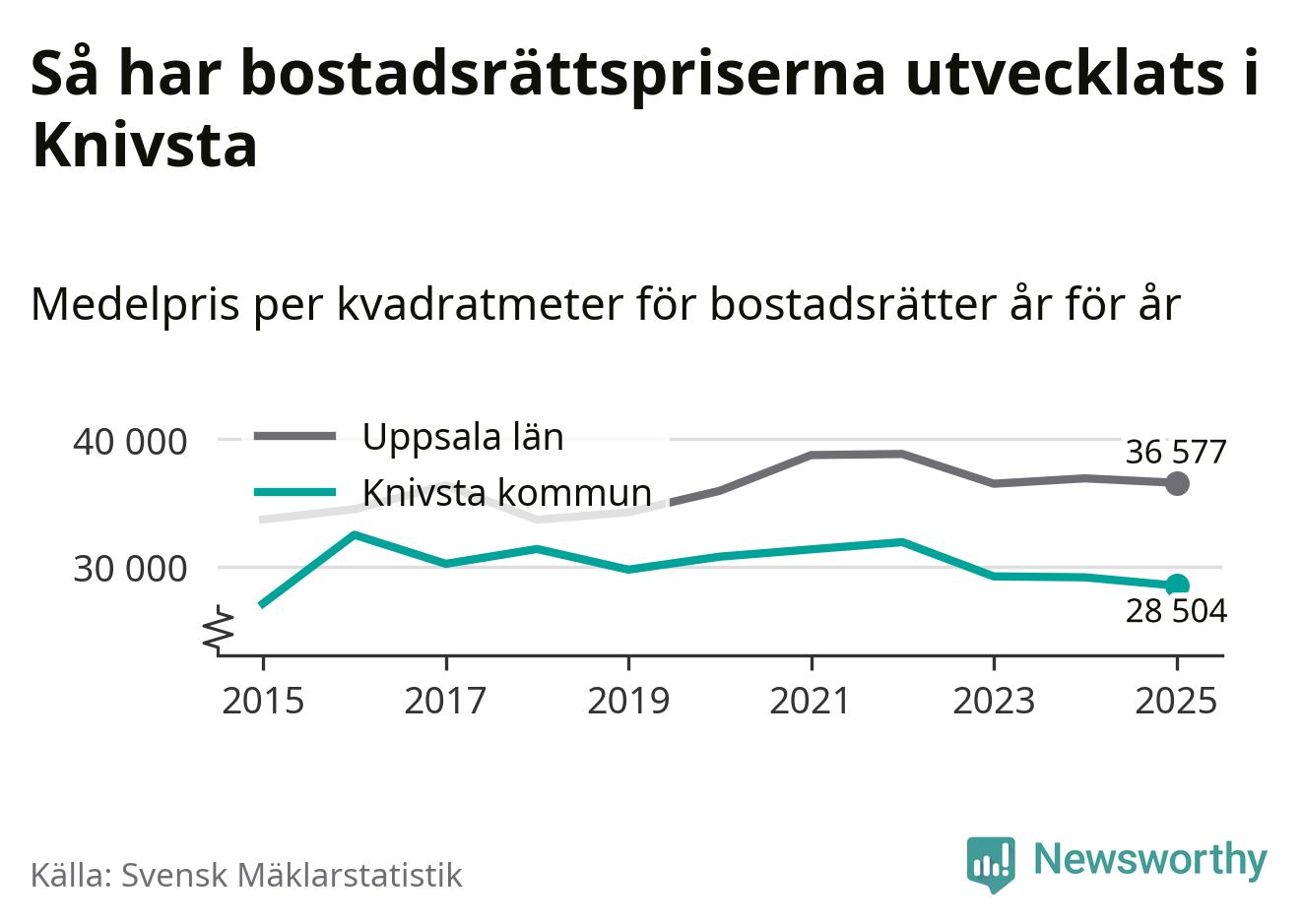Det såldes totalt 221 bostadsrätter i Knivsta kommun under året. Genomsnittspriset per kvadratmeter landade på 28 504 kronor. Det är en minskning med två procent i kommunen på ett år.