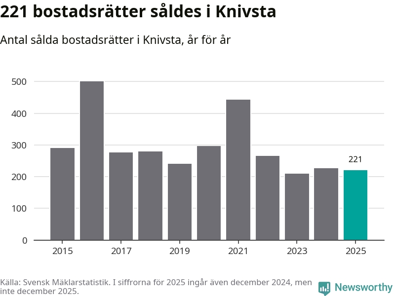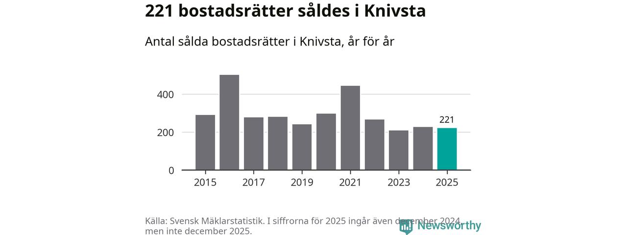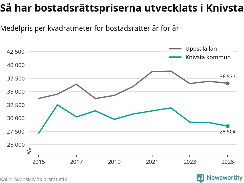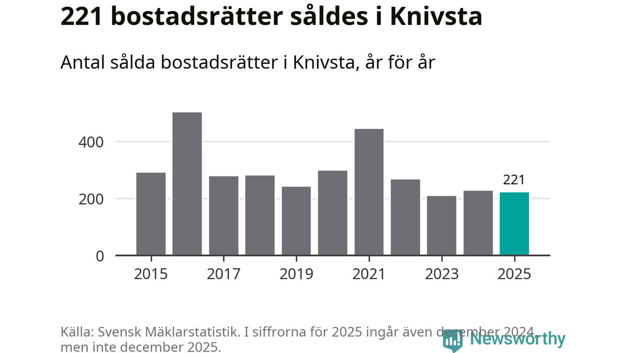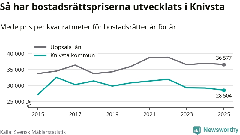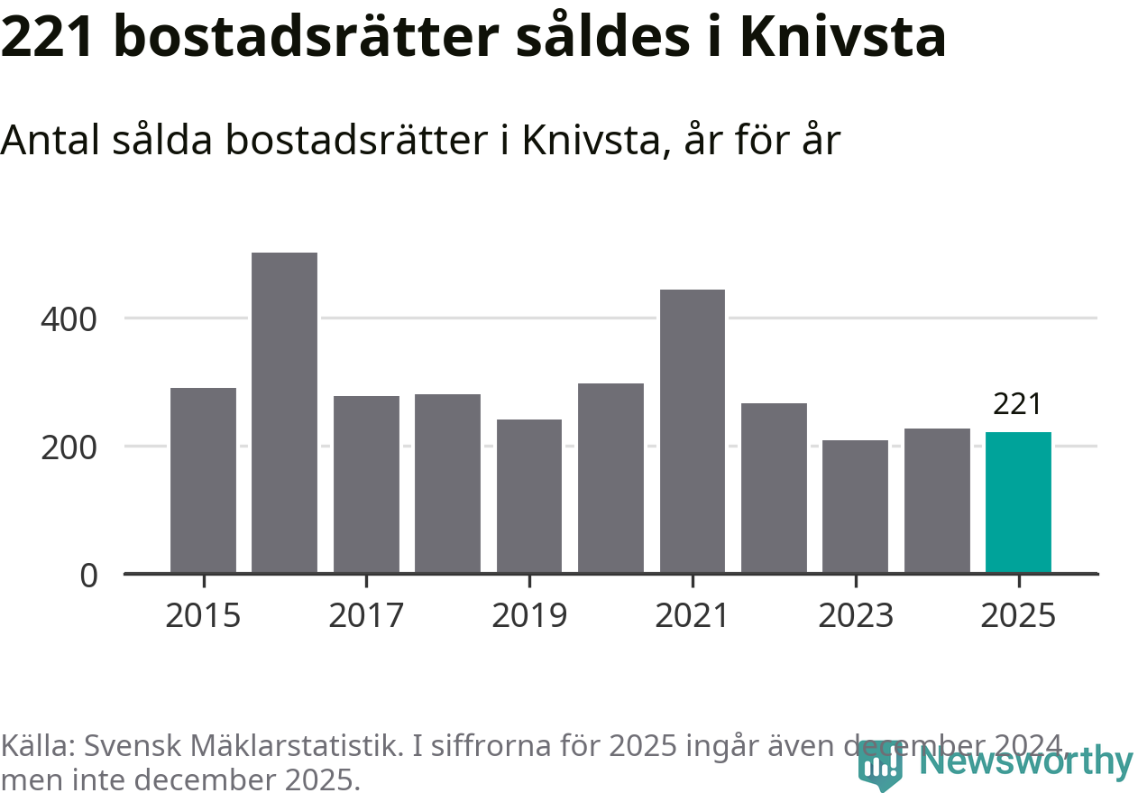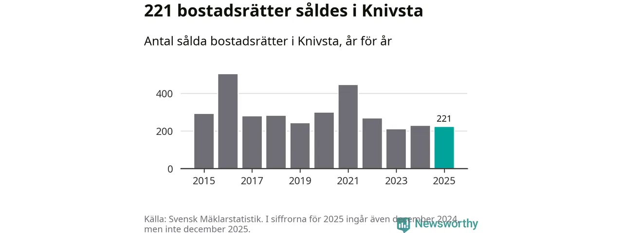 Det såldes totalt 221 bostadsrätter i Knivsta kommun under året. Genomsnittspriset per kvadratmeter landade på 28 504 kronor. Det är en minskning med två procent i kommunen på ett år.