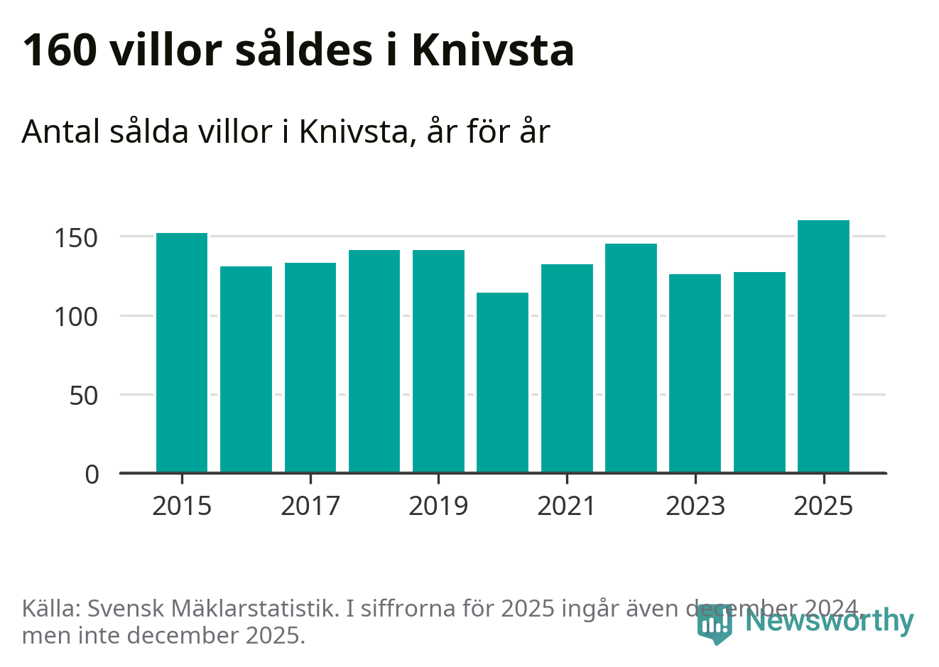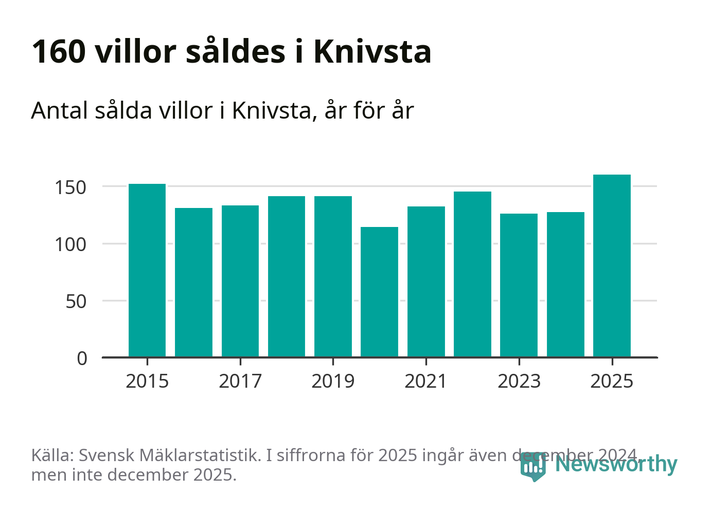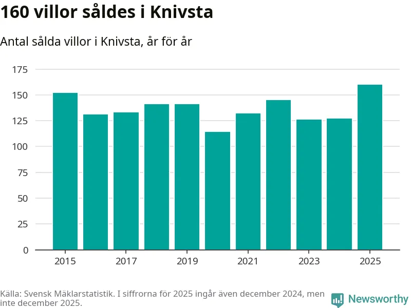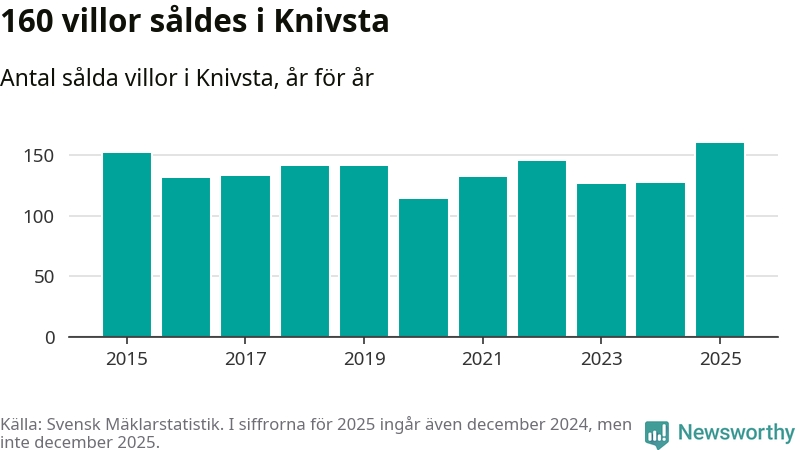 Antalet sålda villor ökade också. Totalt såldes 160 villor, att jämföra med 127 under 2024. Det är fler än något annat år sedan 2015.