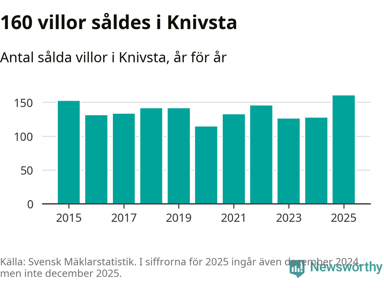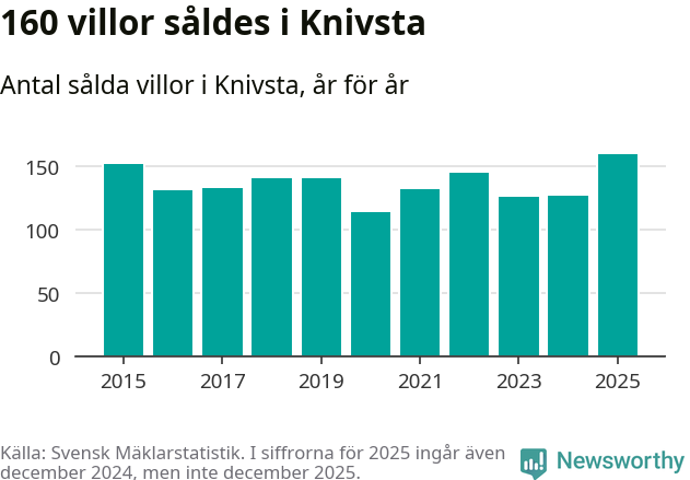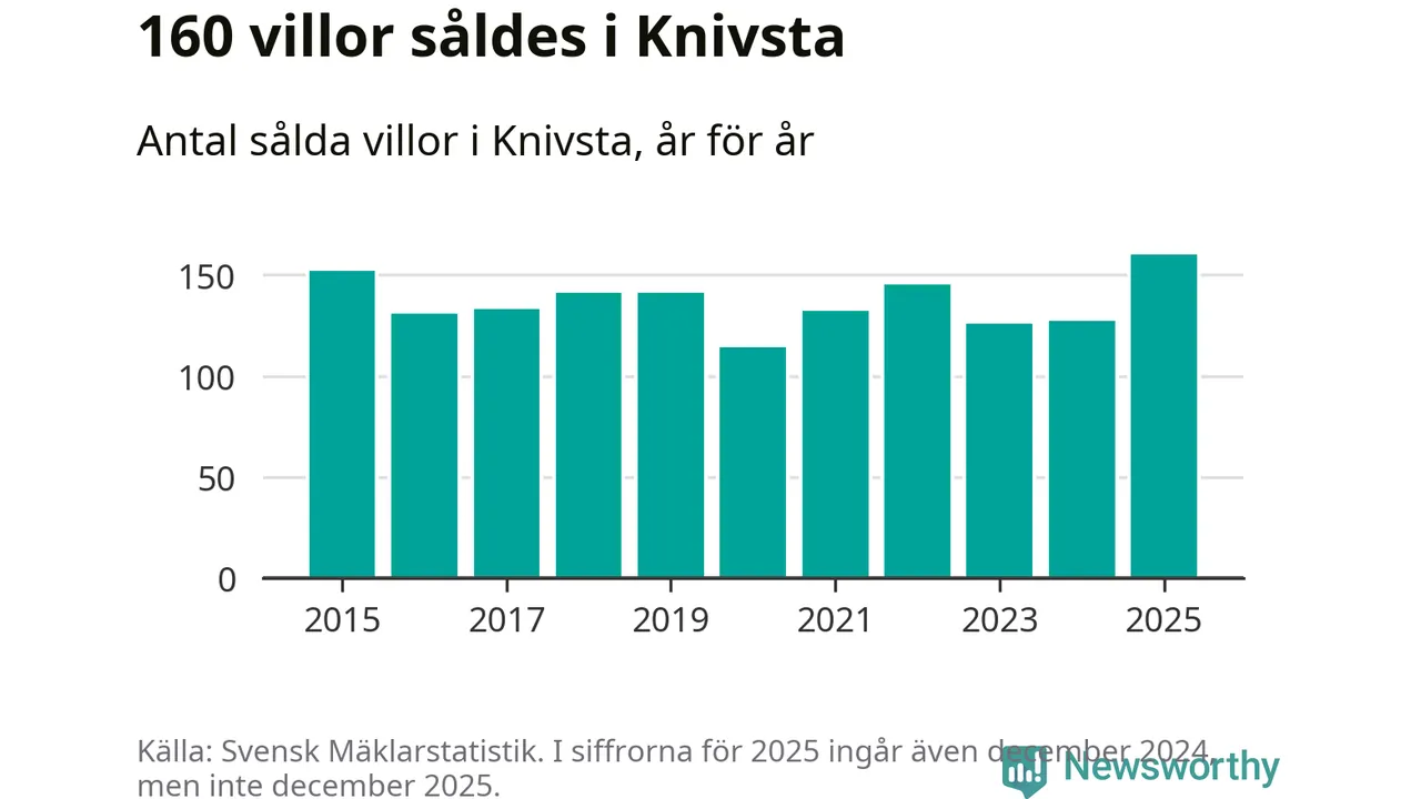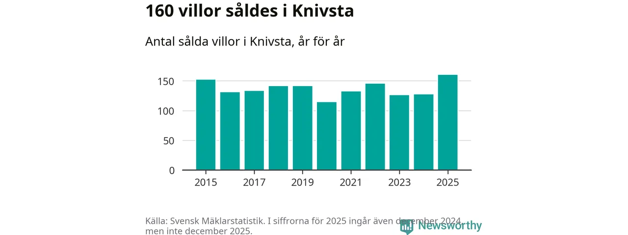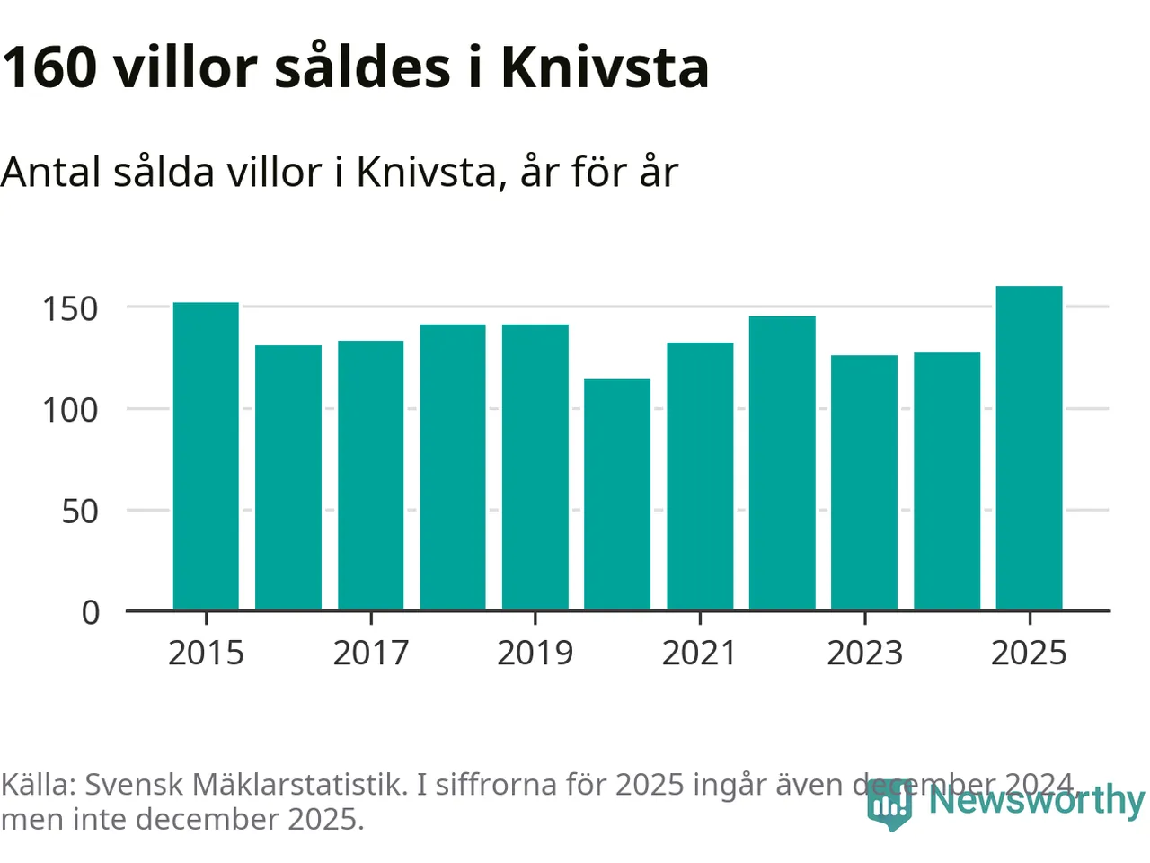 Antalet sålda villor ökade också. Totalt såldes 160 villor, att jämföra med 127 under 2024. Det är fler än något annat år sedan 2015.