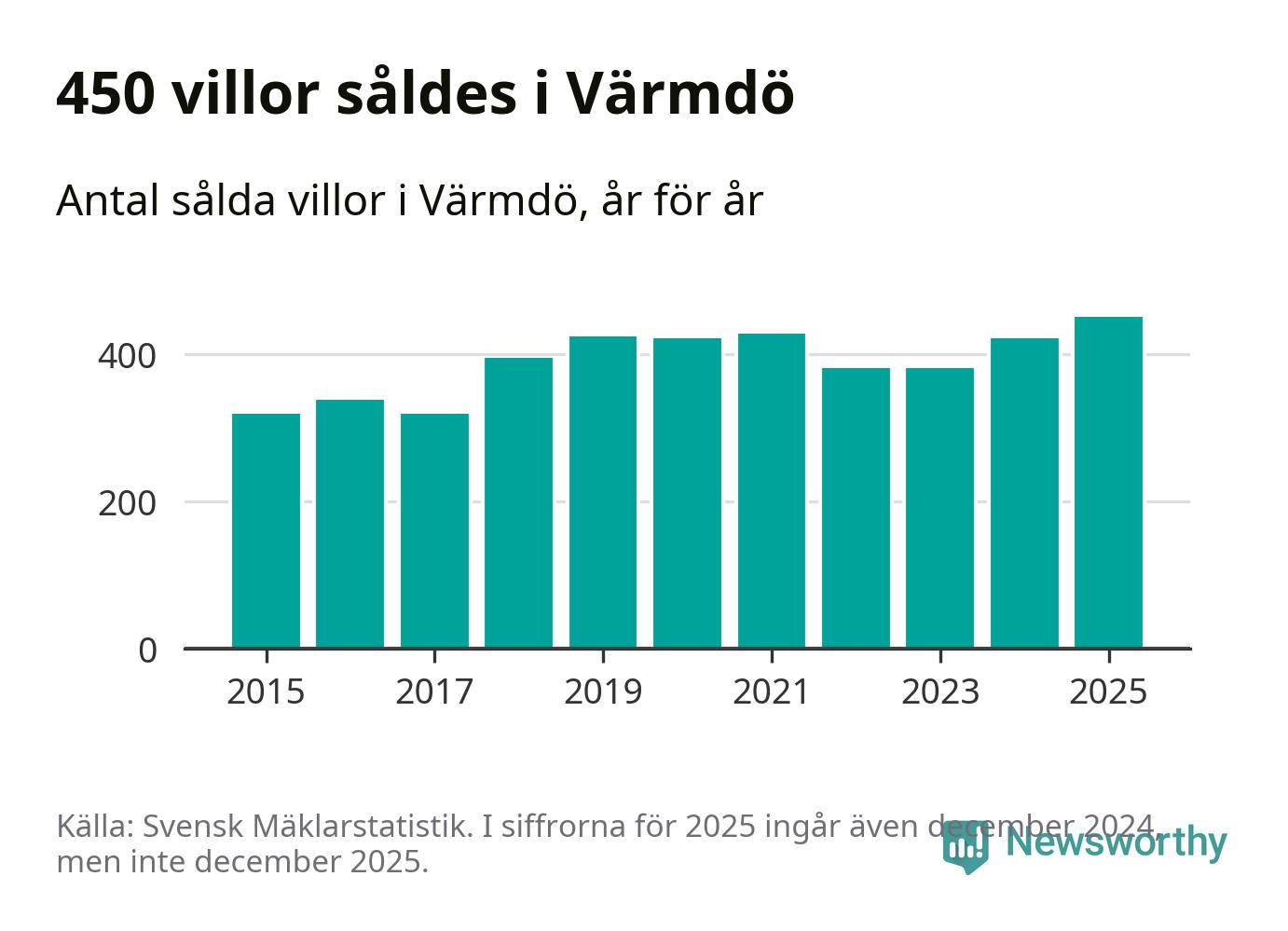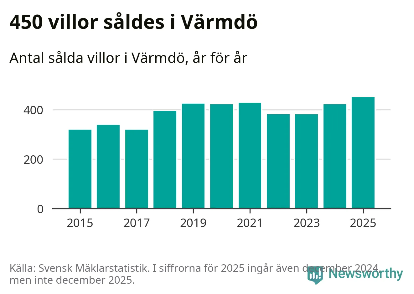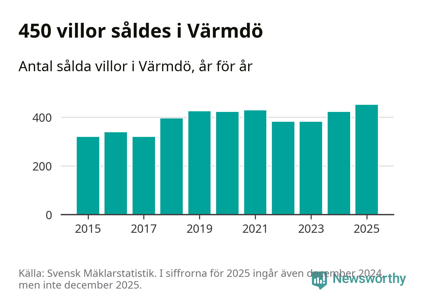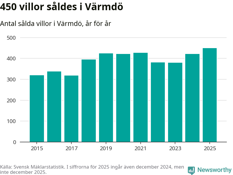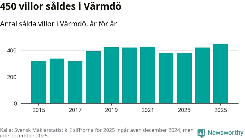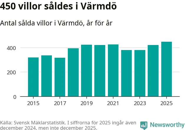 Antalet sålda villor ökade också. Totalt såldes 450 villor, att jämföra med 421 under 2024. Det är fler än något annat år sedan 2015.