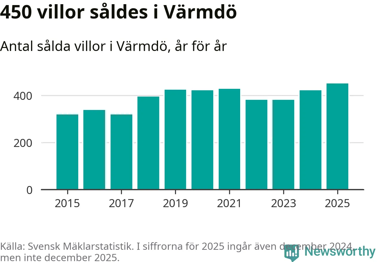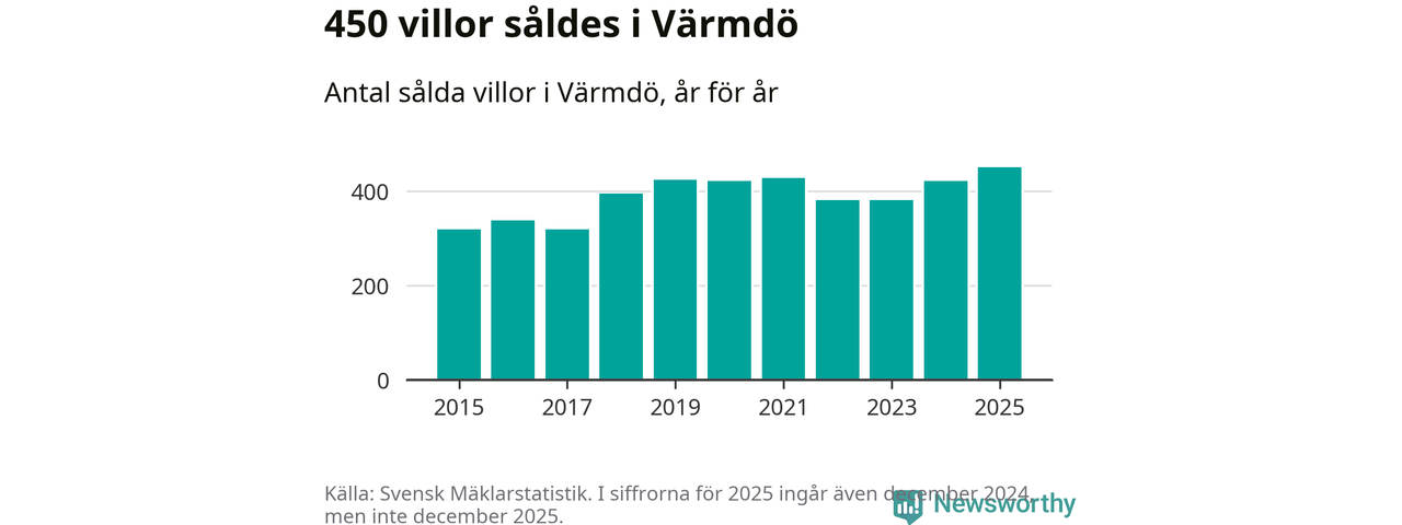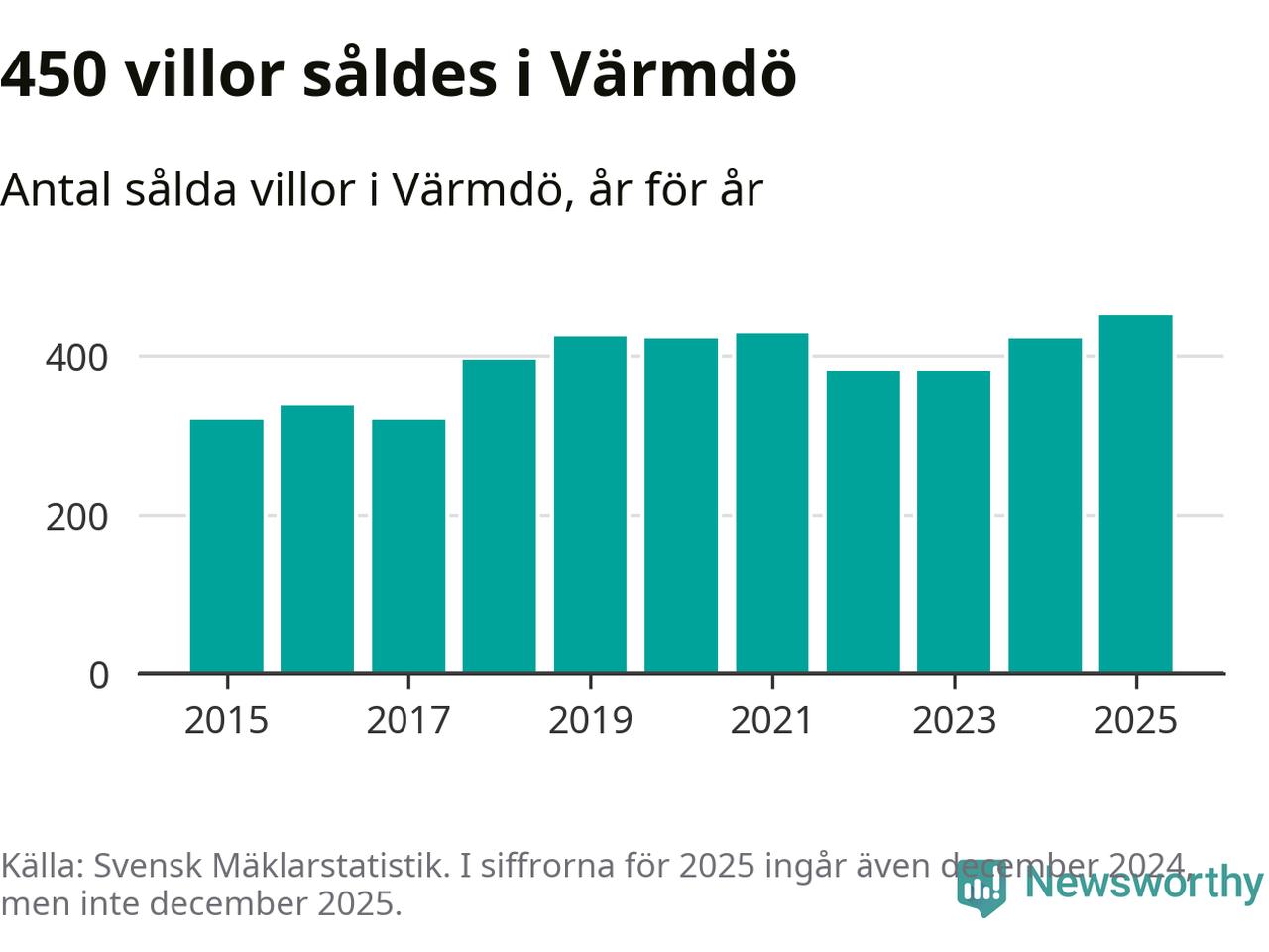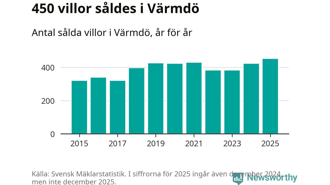 Antalet sålda villor ökade också. Totalt såldes 450 villor, att jämföra med 421 under 2024. Det är fler än något annat år sedan 2015.