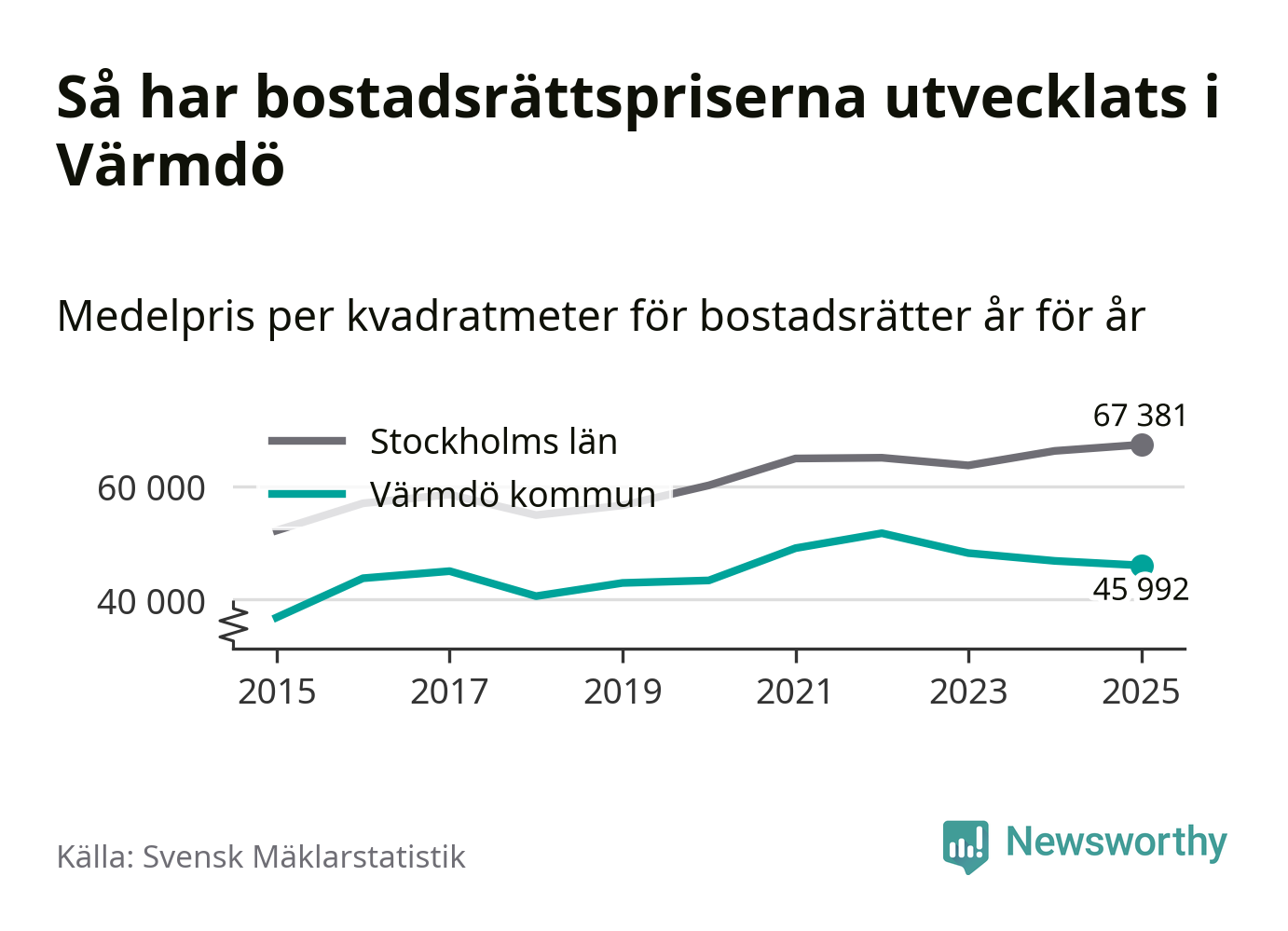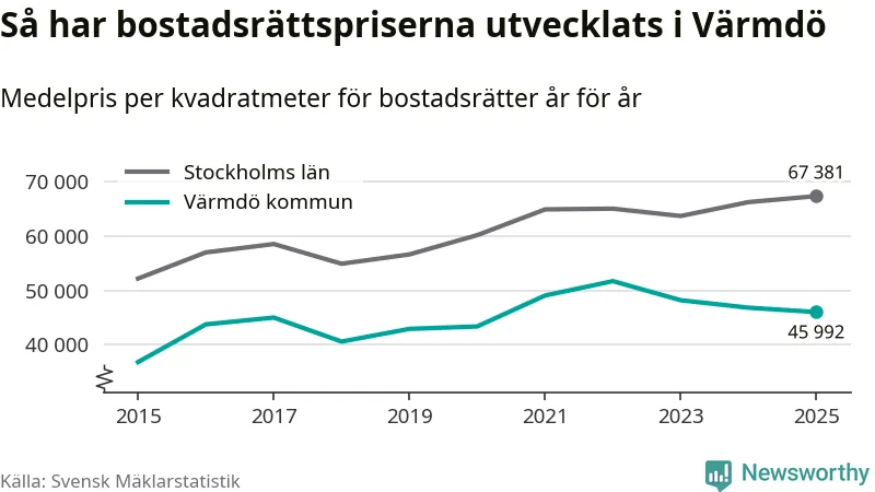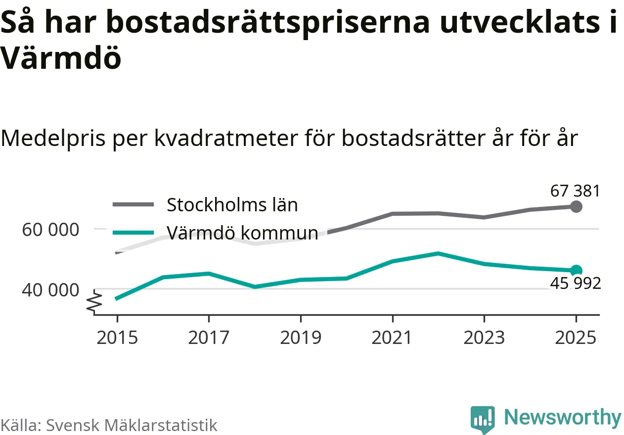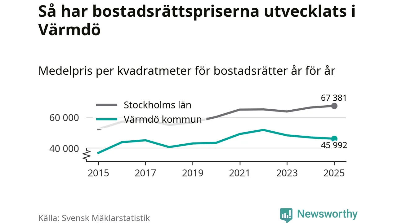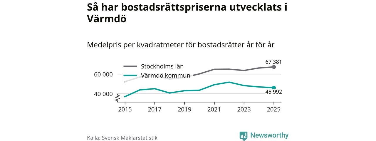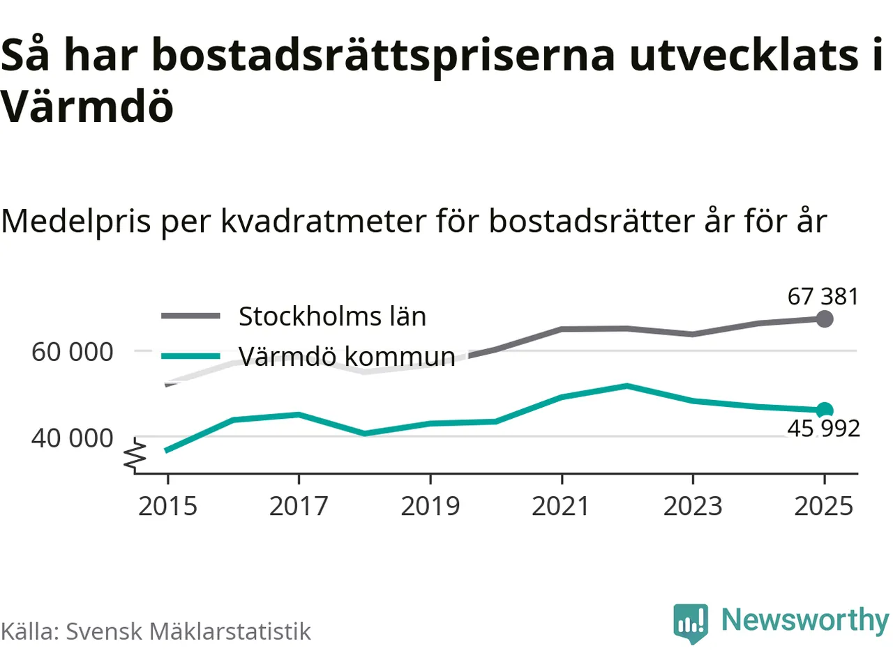 Det såldes totalt 433 bostadsrätter i Värmdö kommun under året. Genomsnittspriset per kvadratmeter landade på 45 992 kronor. Det är en minskning med två procent i kommunen på ett år.
