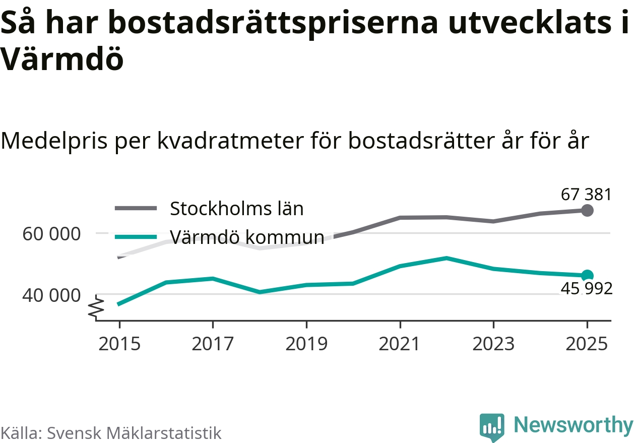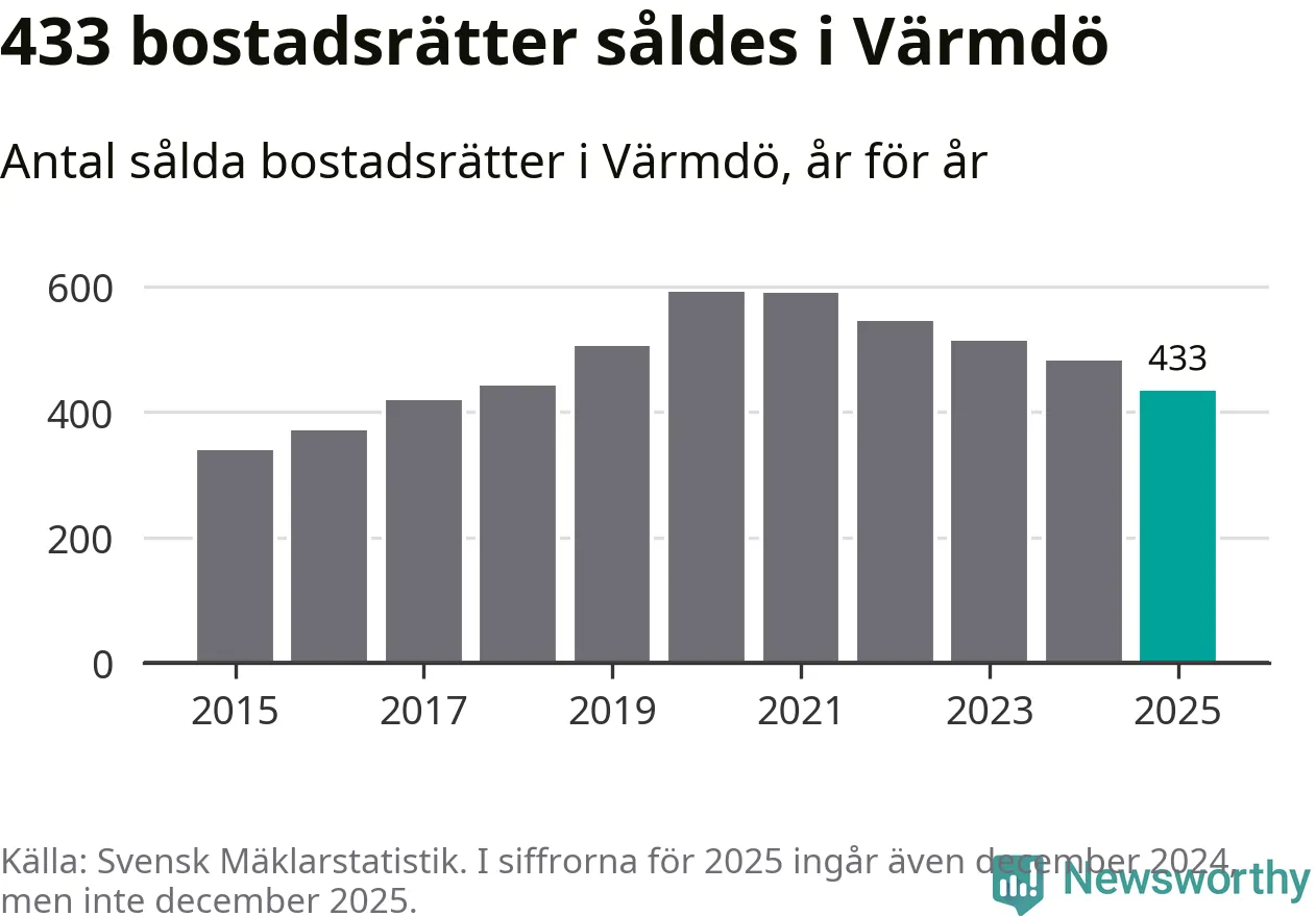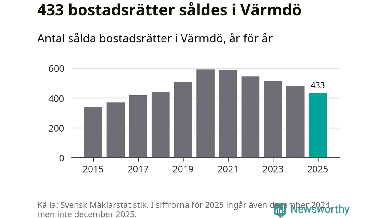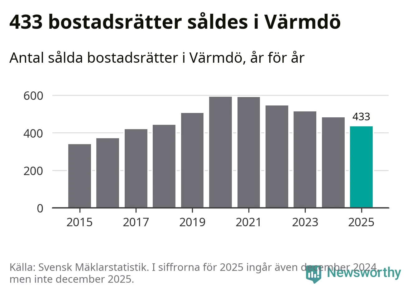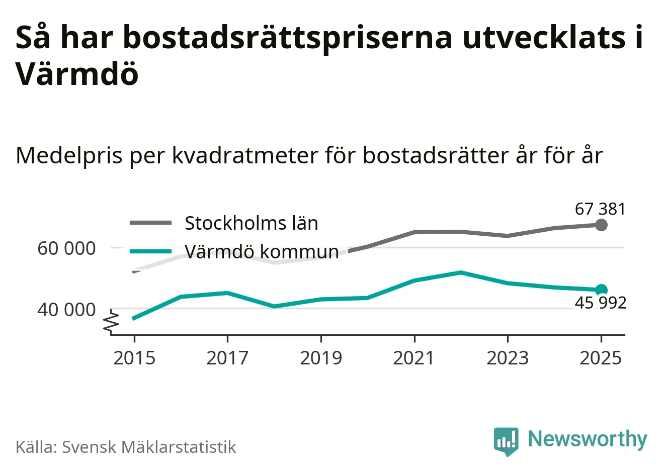 Det såldes totalt 433 bostadsrätter i Värmdö kommun under året. Genomsnittspriset per kvadratmeter landade på 45 992 kronor. Det är en minskning med två procent i kommunen på ett år.