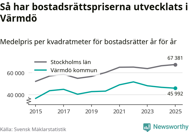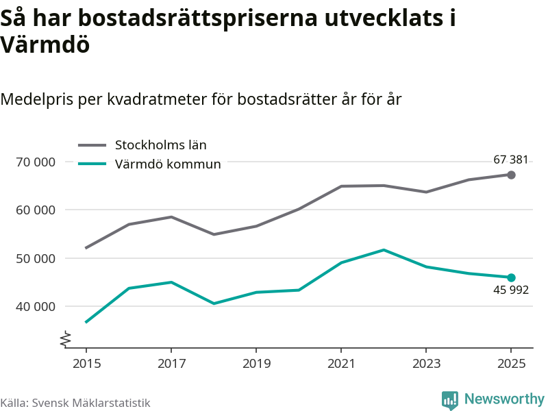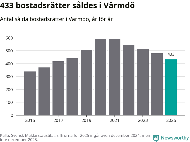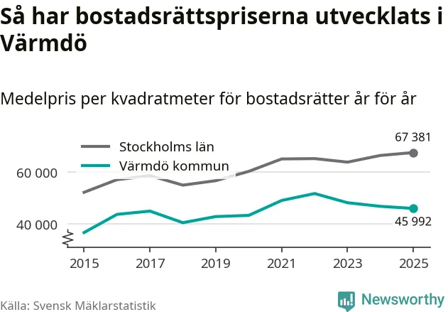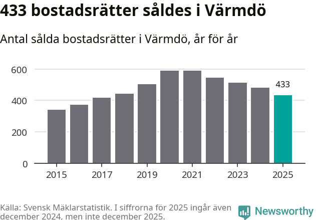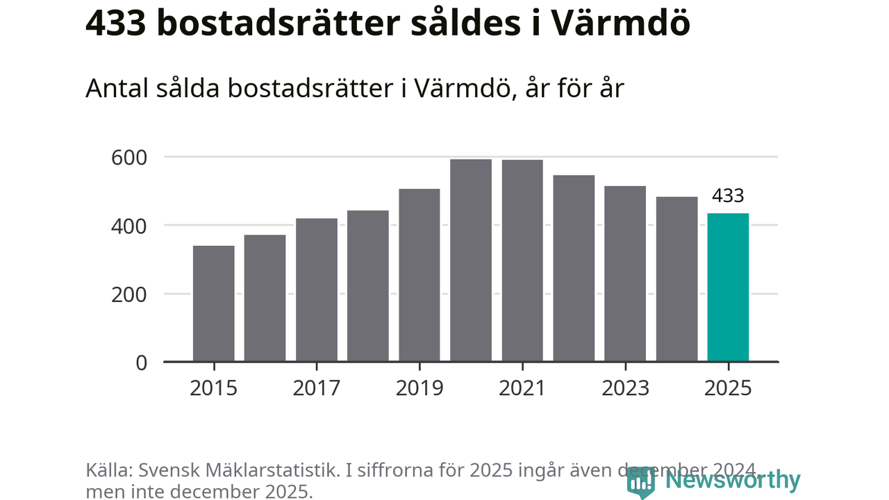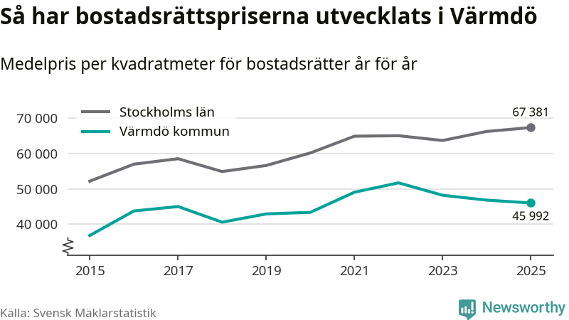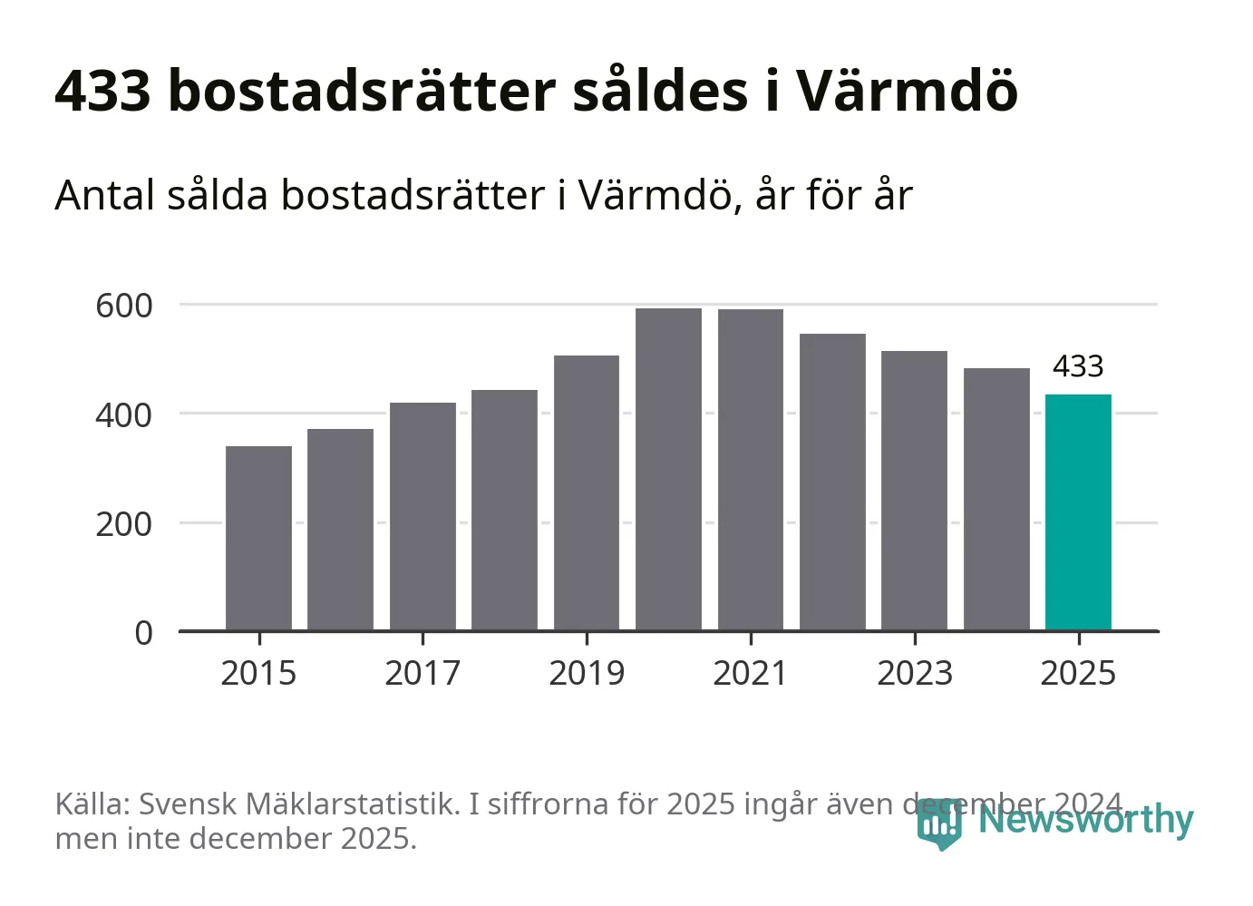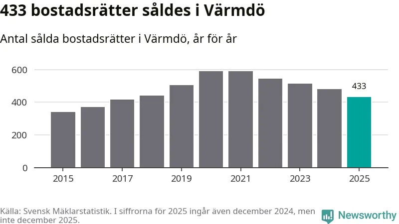 Det såldes totalt 433 bostadsrätter i Värmdö kommun under året. Genomsnittspriset per kvadratmeter landade på 45 992 kronor. Det är en minskning med två procent i kommunen på ett år.