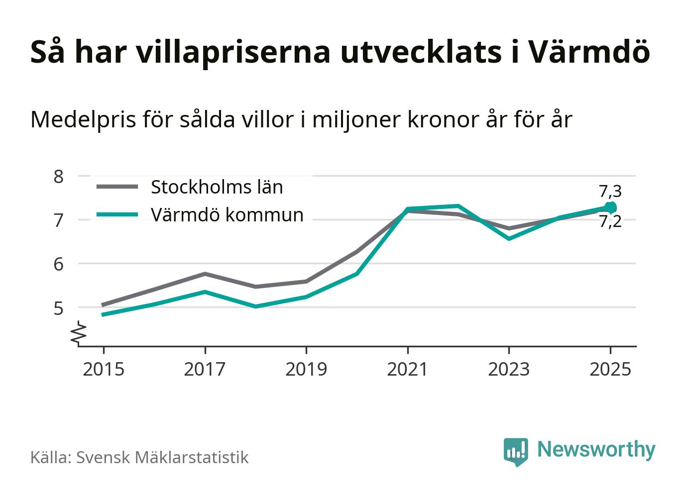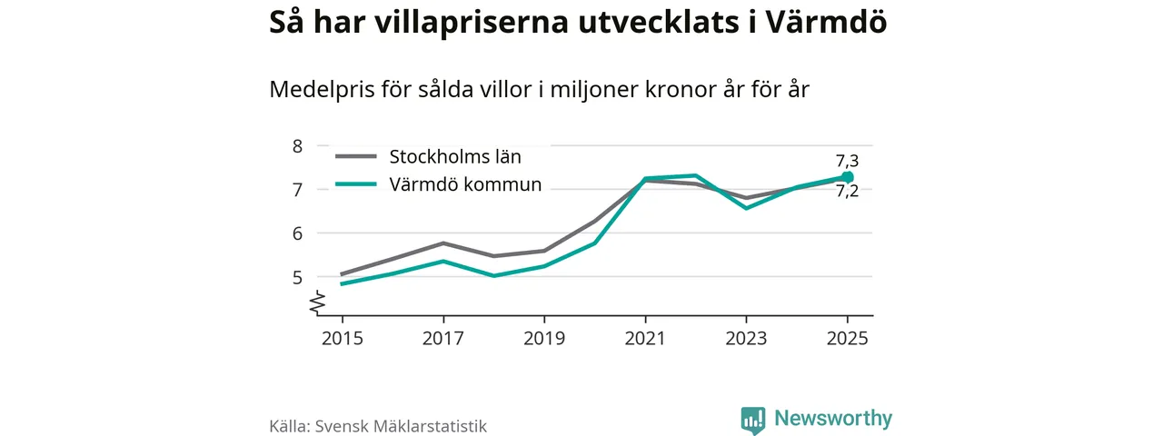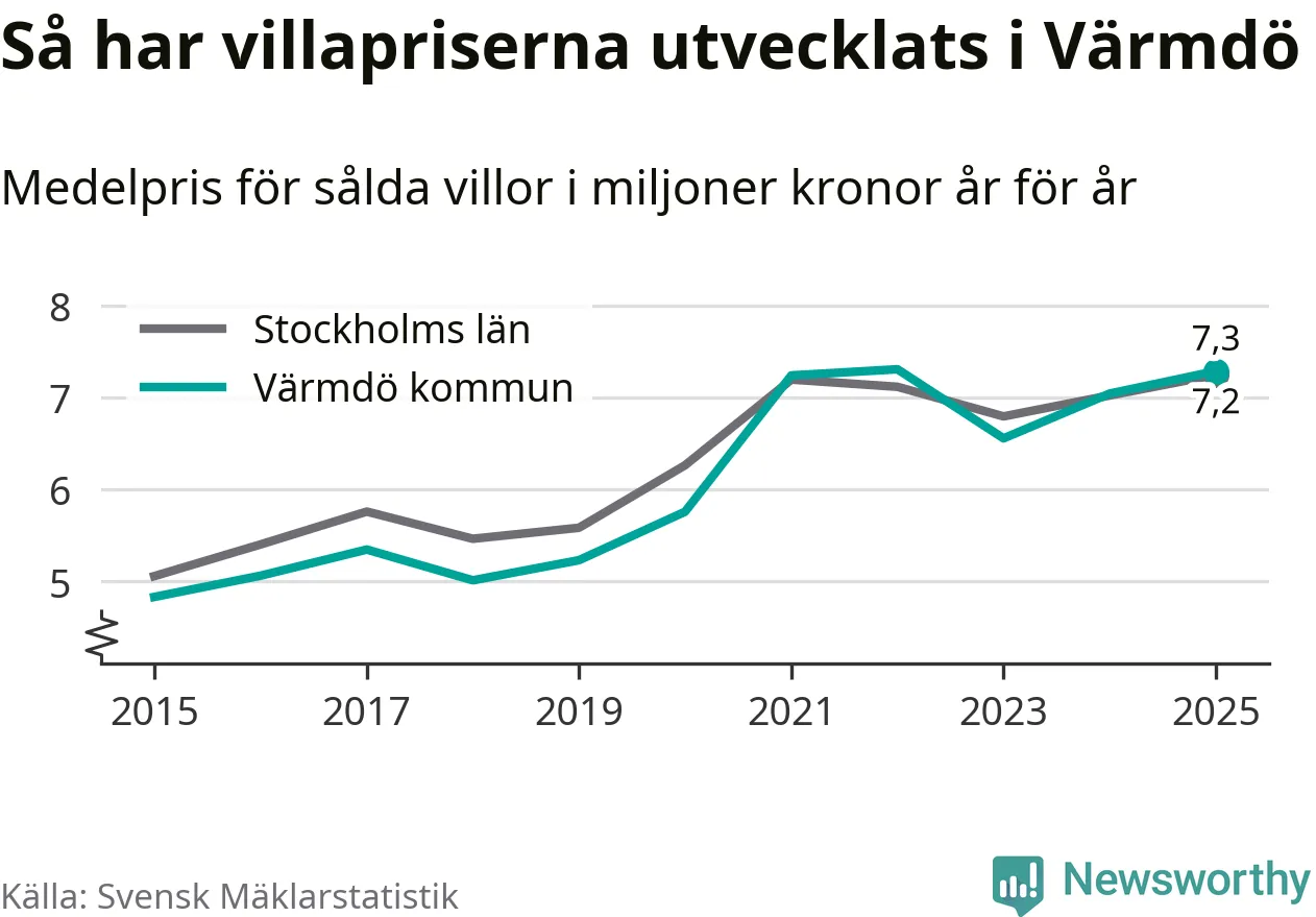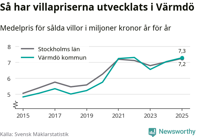 7,3 miljoner kronor är medelpriset för de villor som såldes i Värmdö kommun under året, eller 60 716 kronor per kvadratmeter. Det innebär en prisökning med tre procent på ett år och är andra året i rad som priserna ökar i kommunen.