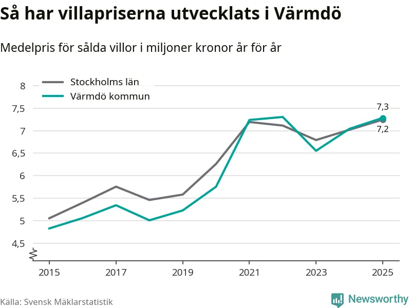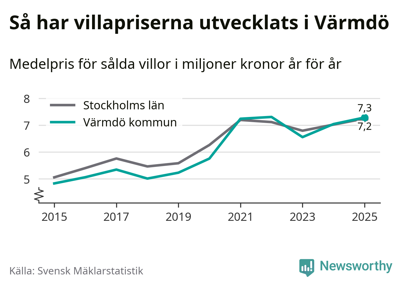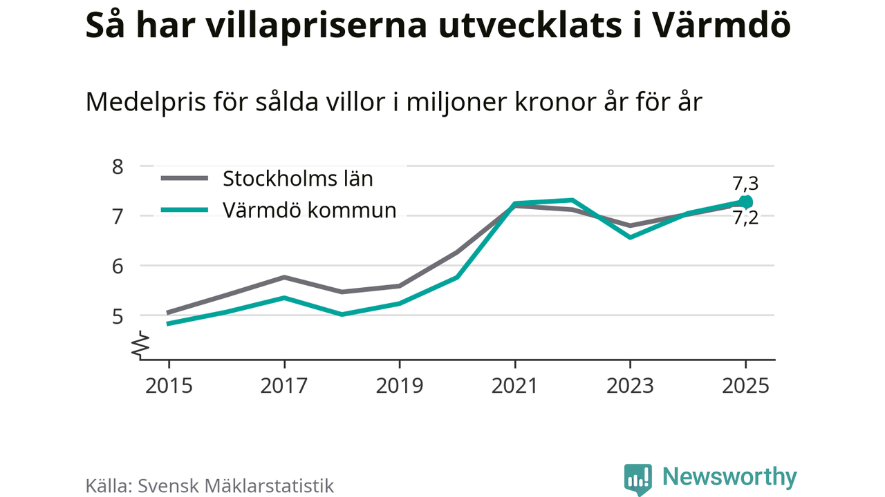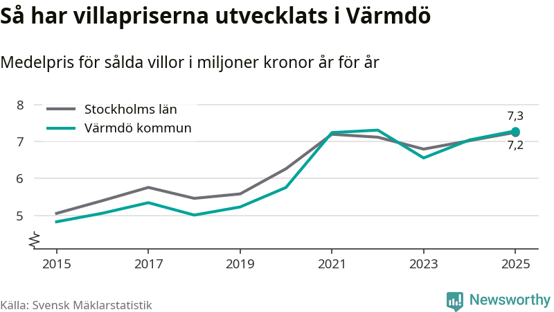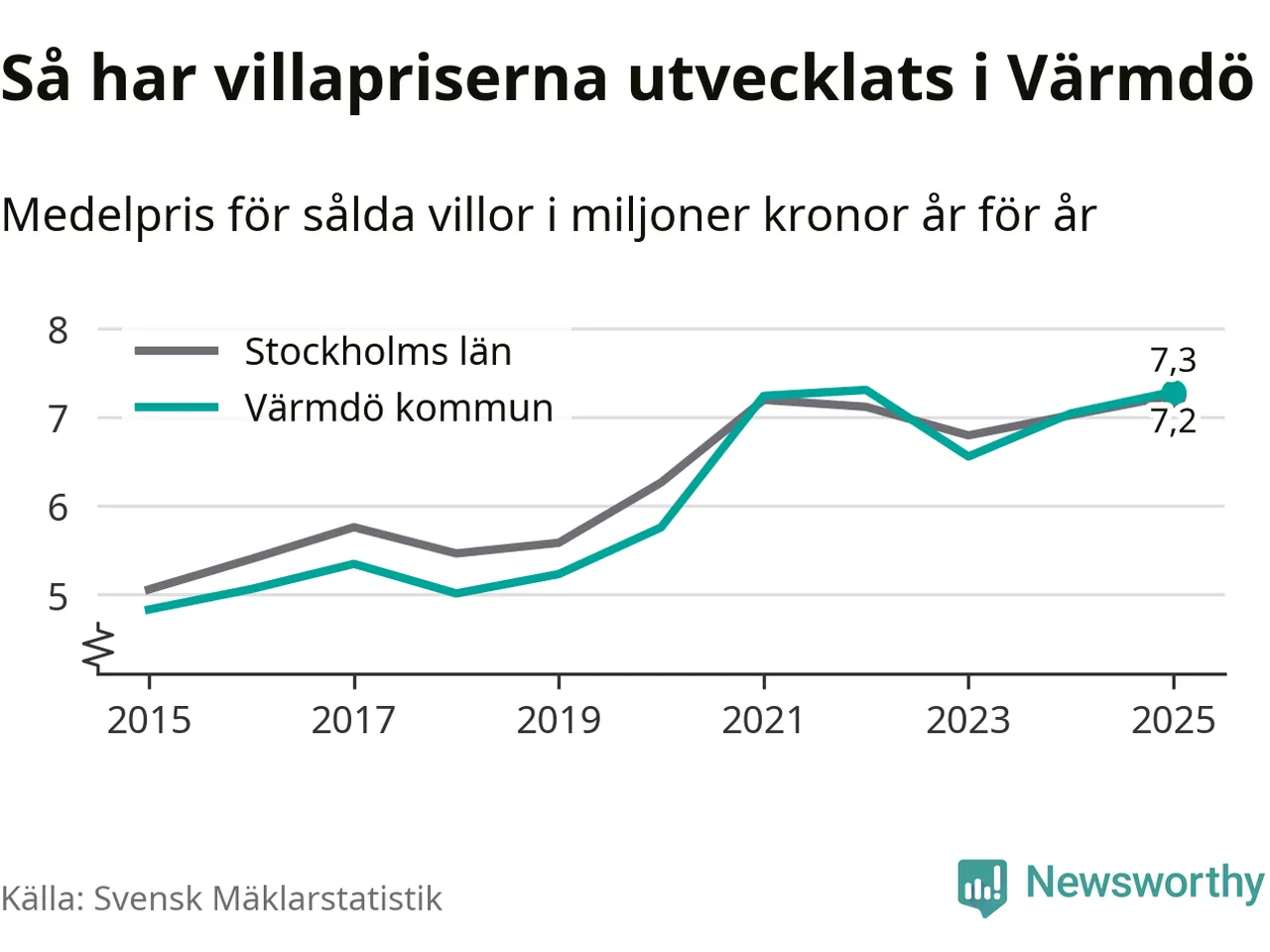 7,3 miljoner kronor är medelpriset för de villor som såldes i Värmdö kommun under året, eller 60 716 kronor per kvadratmeter. Det innebär en prisökning med tre procent på ett år och är andra året i rad som priserna ökar i kommunen.