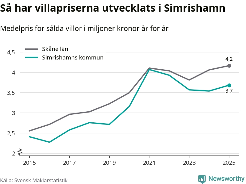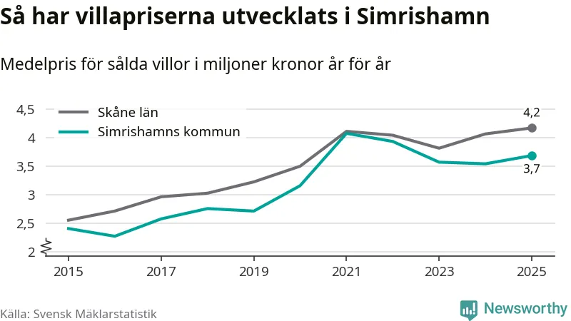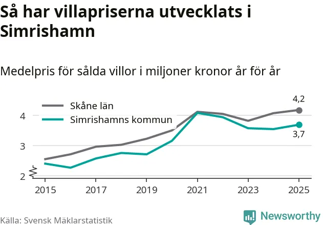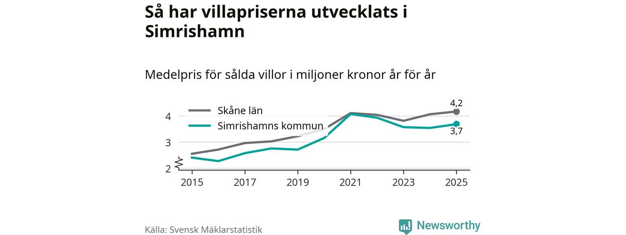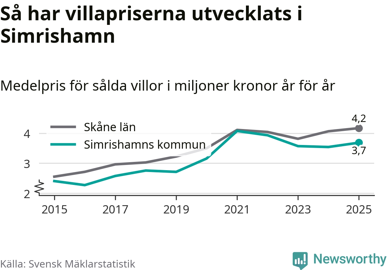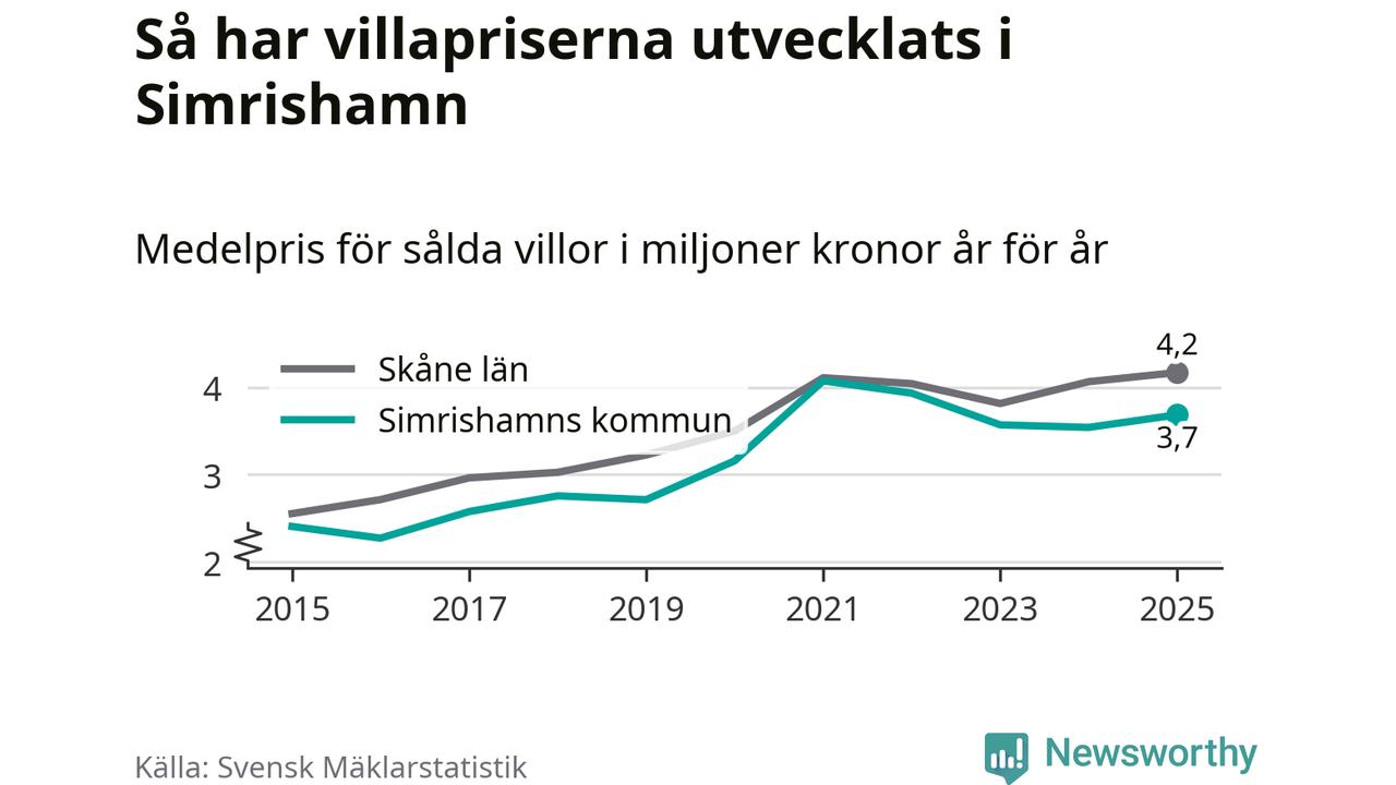 3,7 miljoner kronor är medelpriset för de villor som såldes i Simrishamns kommun under året, eller 30 513 kronor per kvadratmeter. Det innebär en prisökning med fyra procent på ett år.