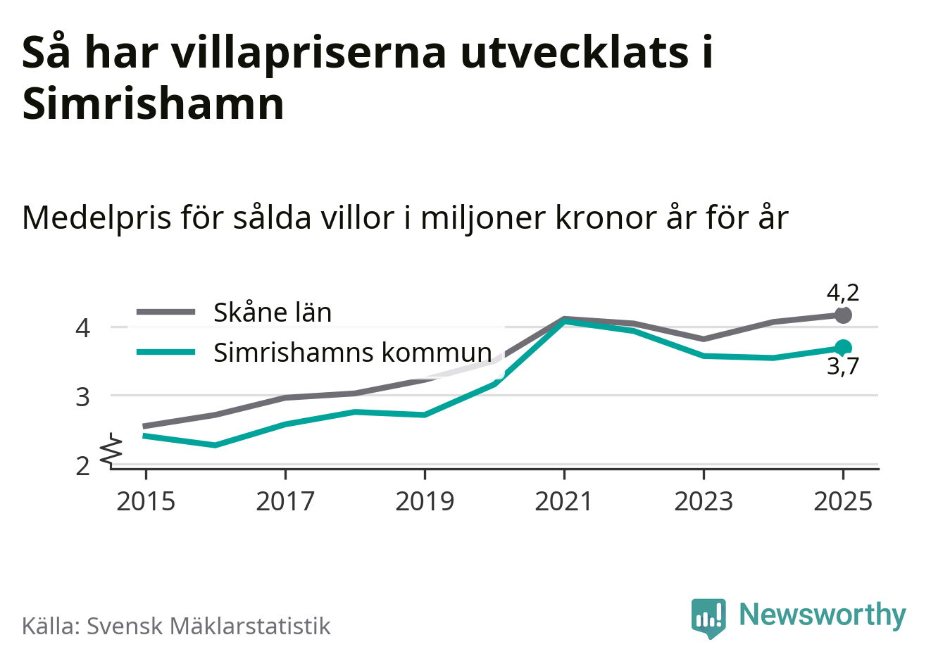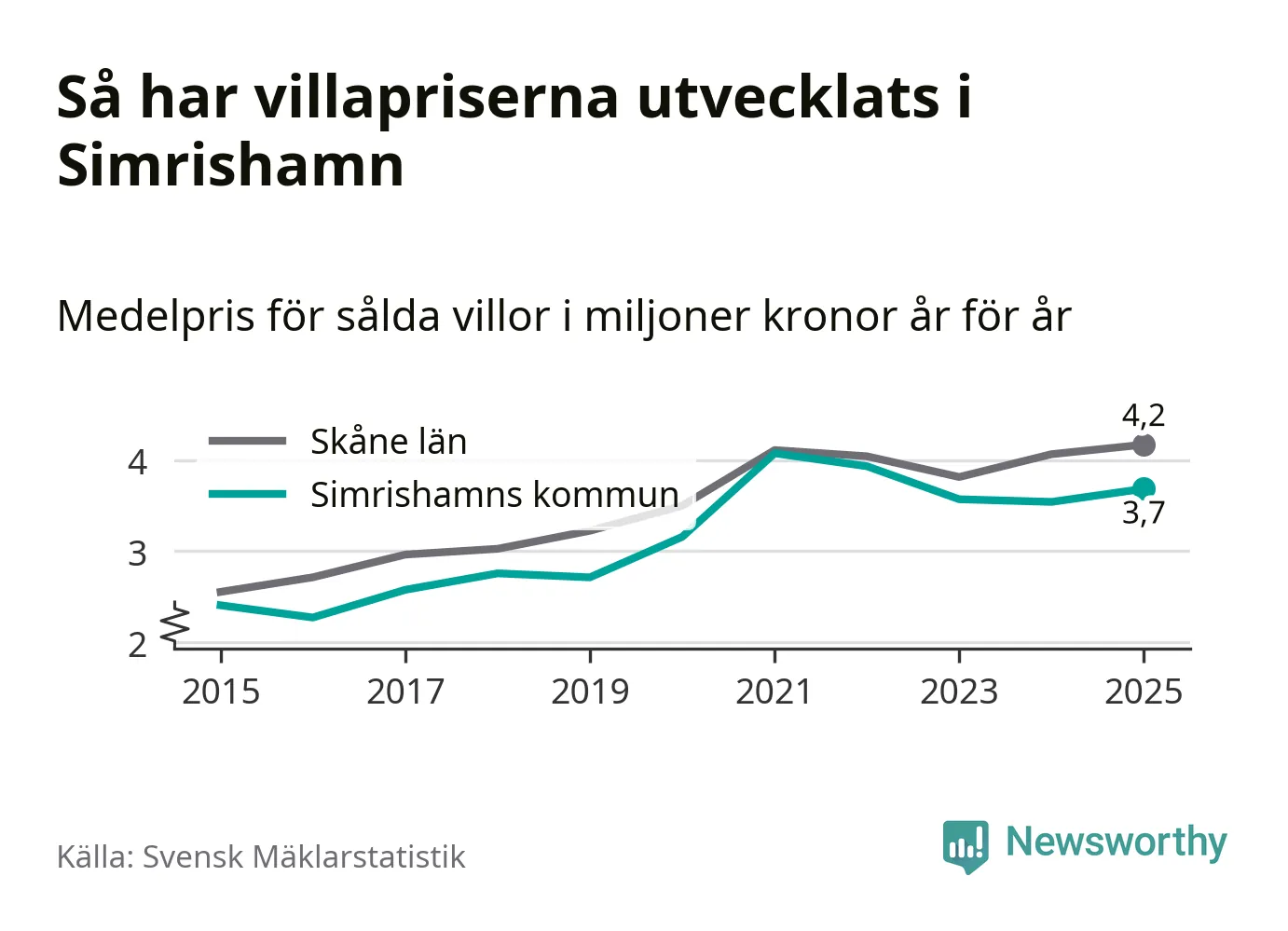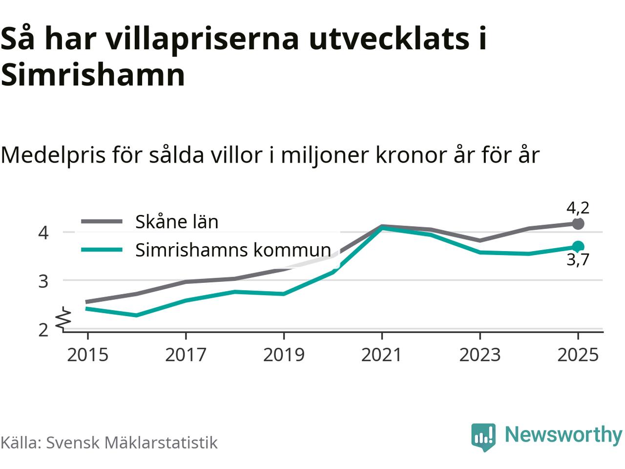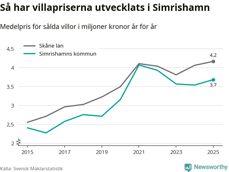 3,7 miljoner kronor är medelpriset för de villor som såldes i Simrishamns kommun under året, eller 30 513 kronor per kvadratmeter. Det innebär en prisökning med fyra procent på ett år.