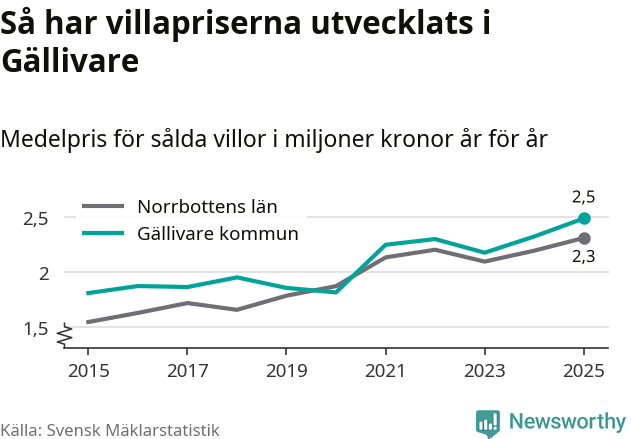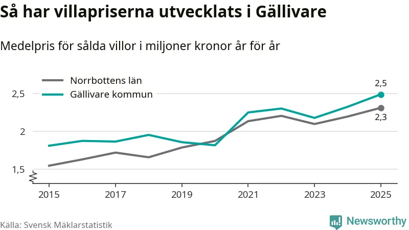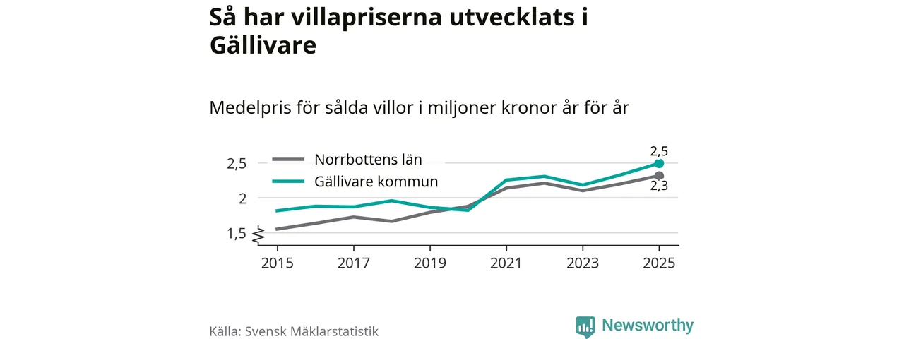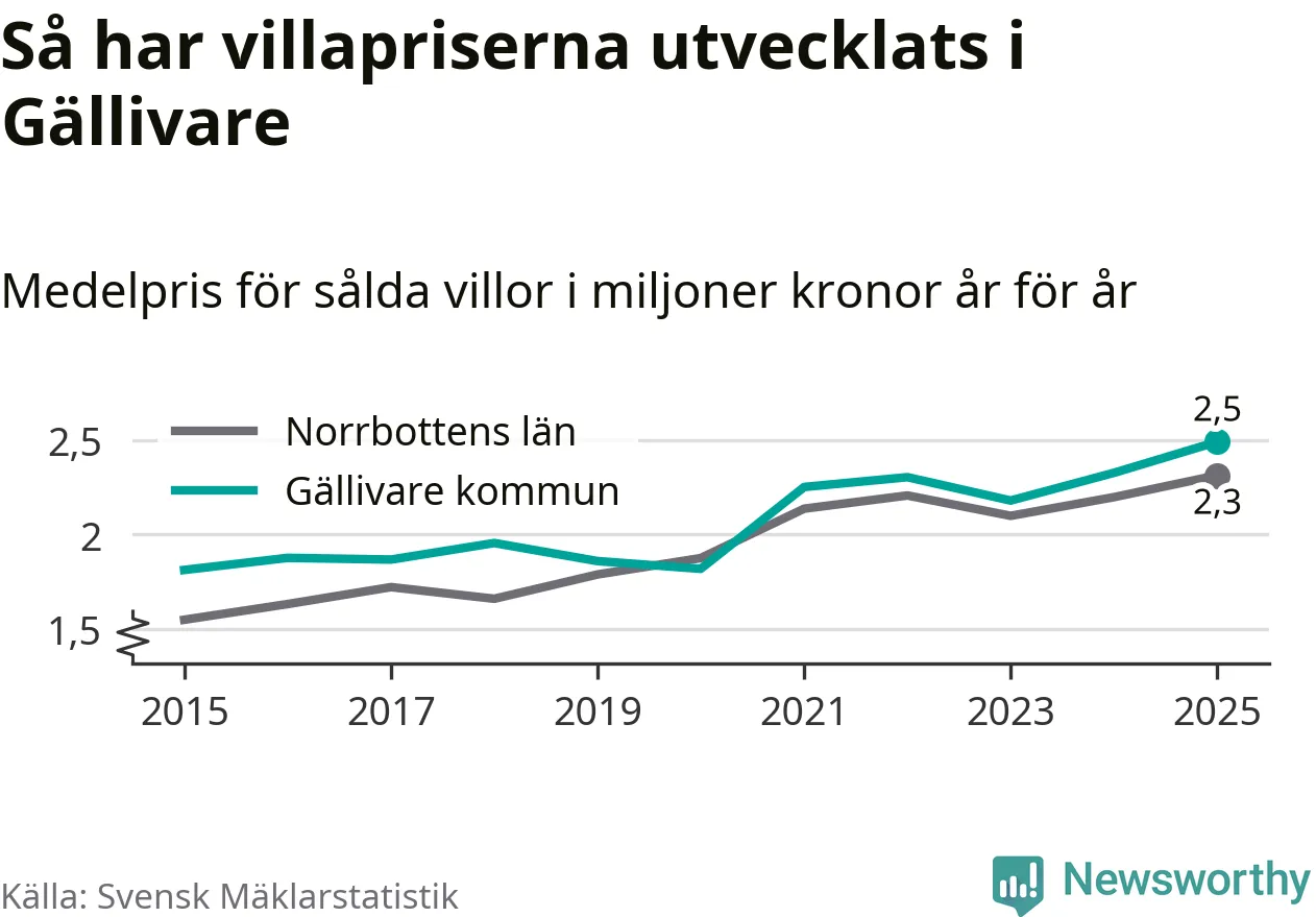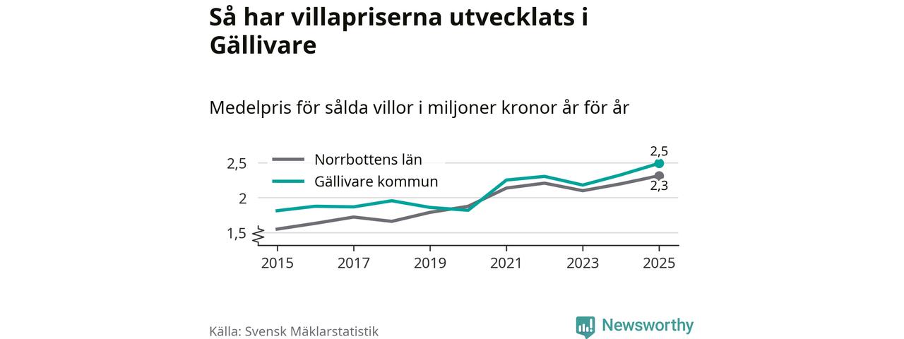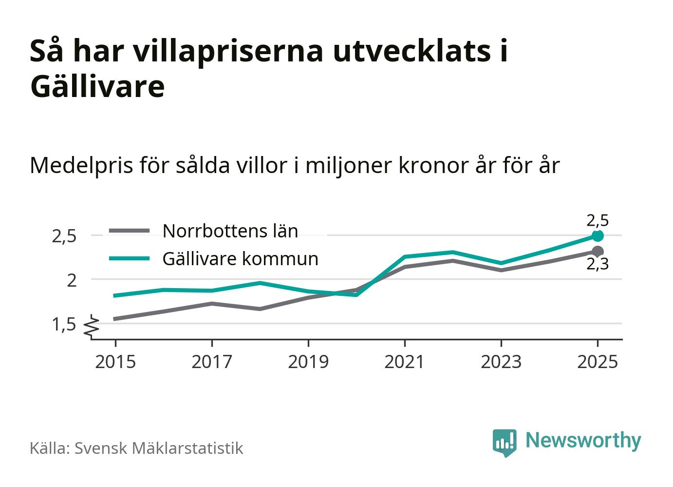 2,5 miljoner kronor är medelpriset för de villor som såldes i Gällivare kommun under året, eller 22 200 kronor per kvadratmeter. Det innebär en prisökning med sju procent på ett år. Det är det högsta årssnittet på åtminstone tio år.