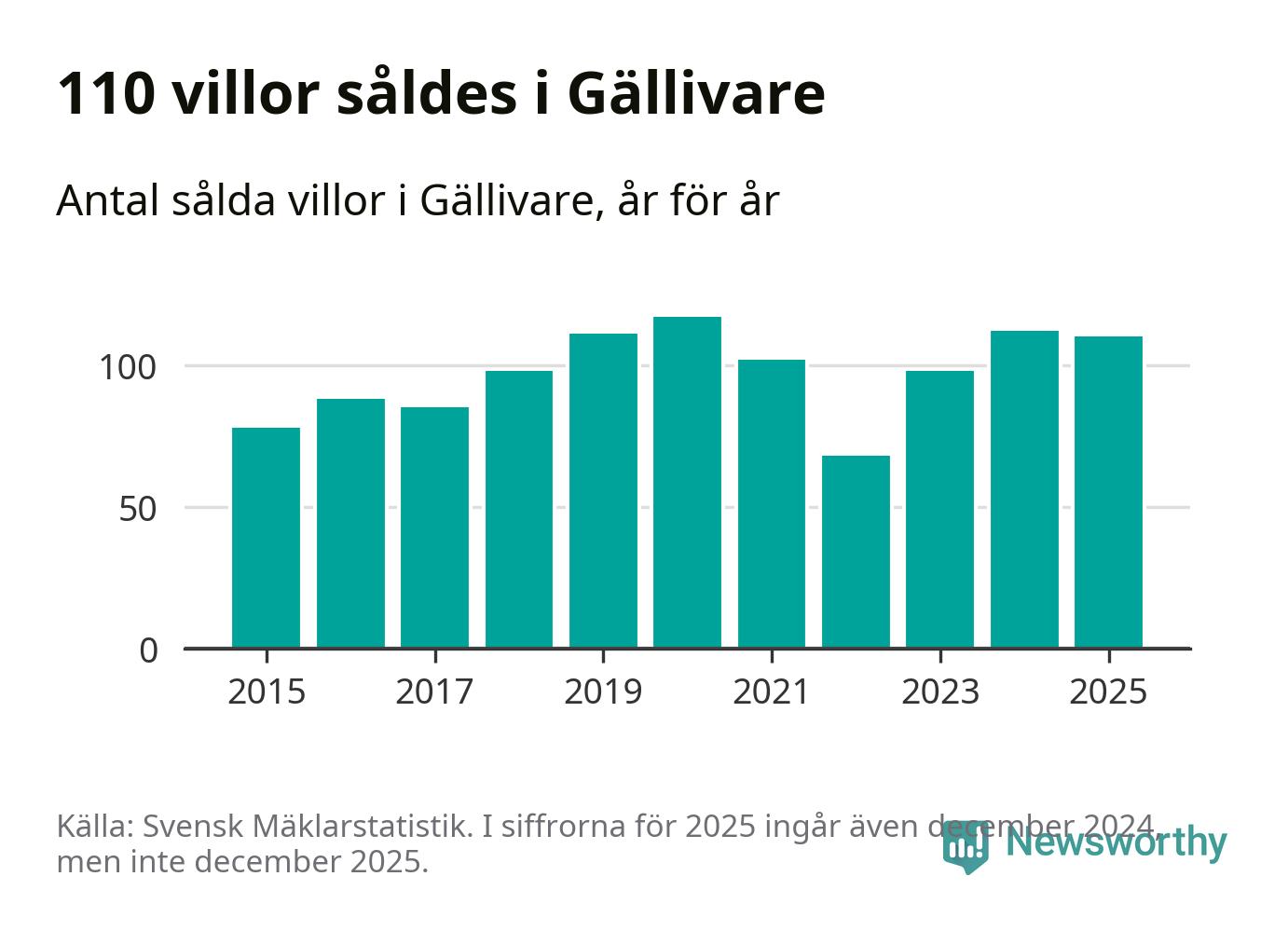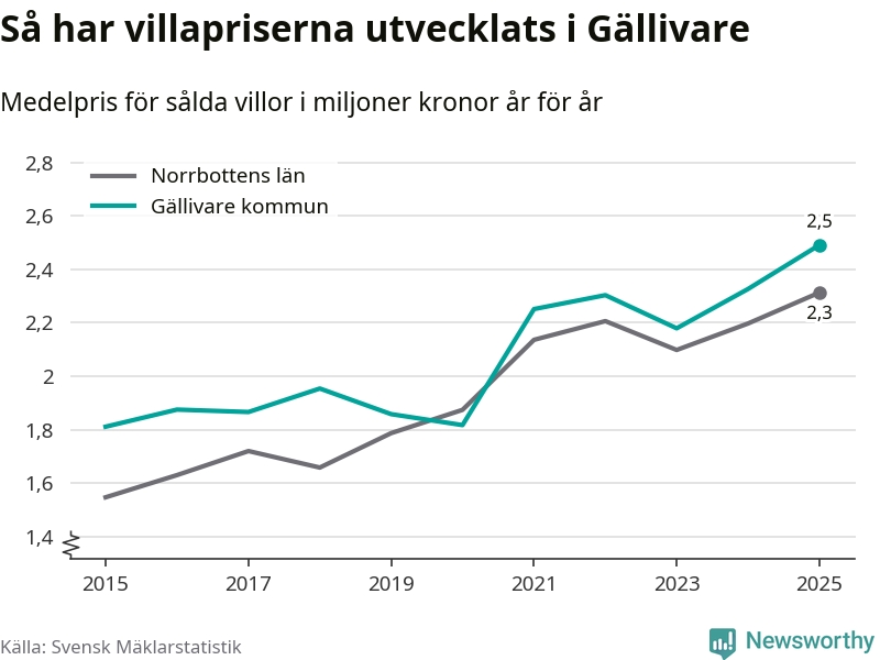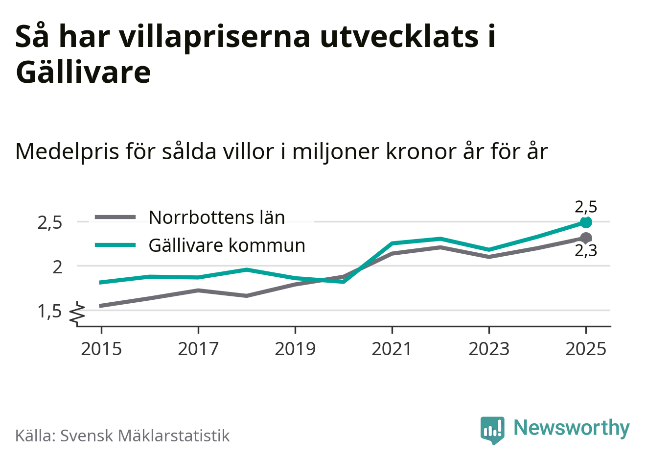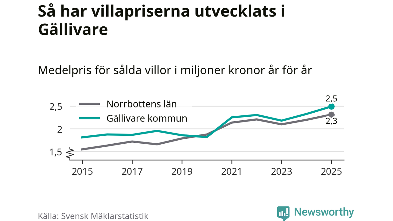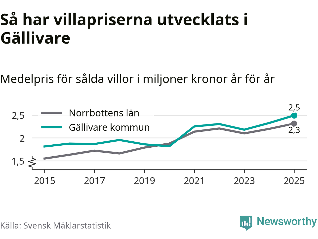 2,5 miljoner kronor är medelpriset för de villor som såldes i Gällivare kommun under året, eller 22 200 kronor per kvadratmeter. Det innebär en prisökning med sju procent på ett år. Det är det högsta årssnittet på åtminstone tio år.