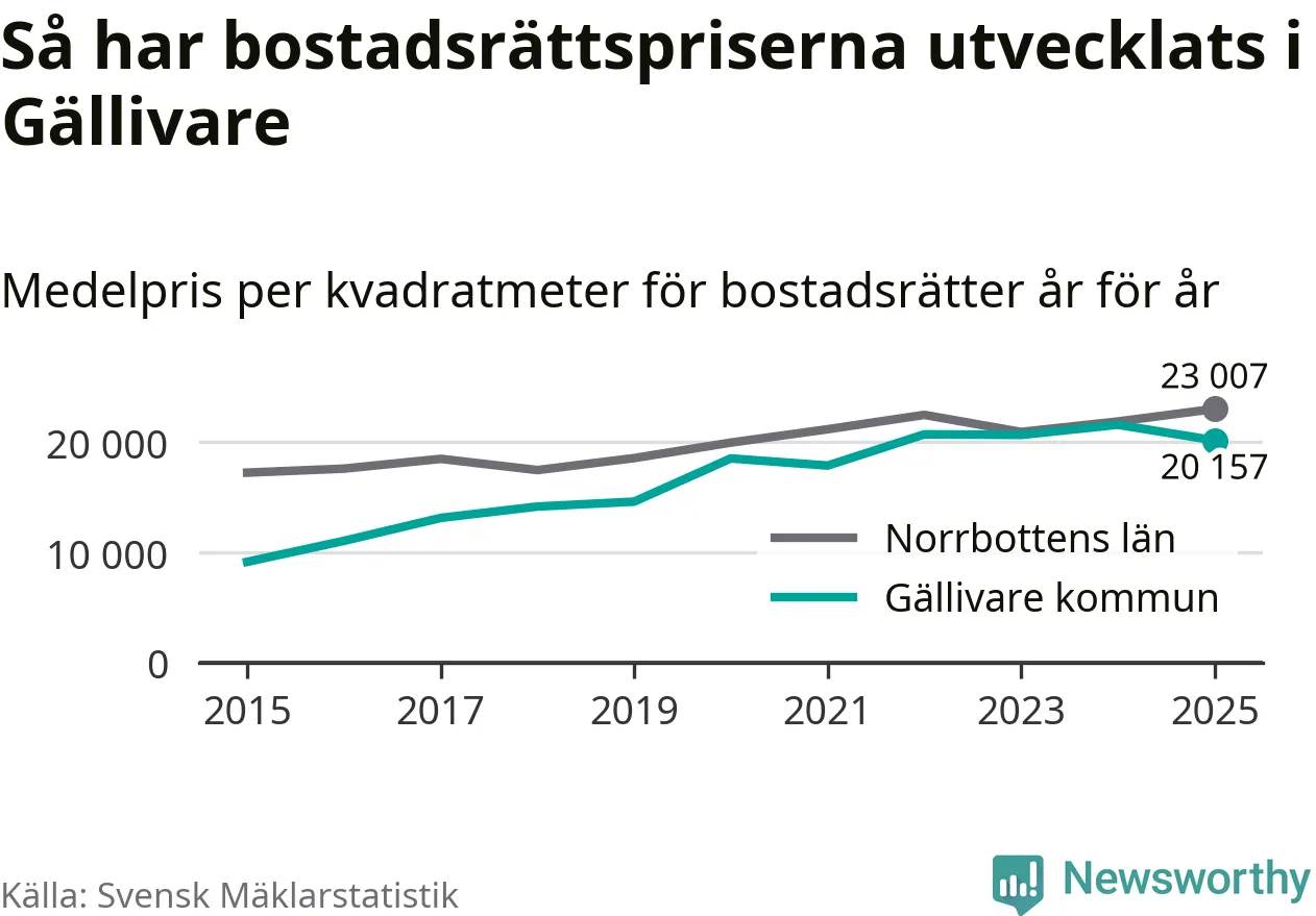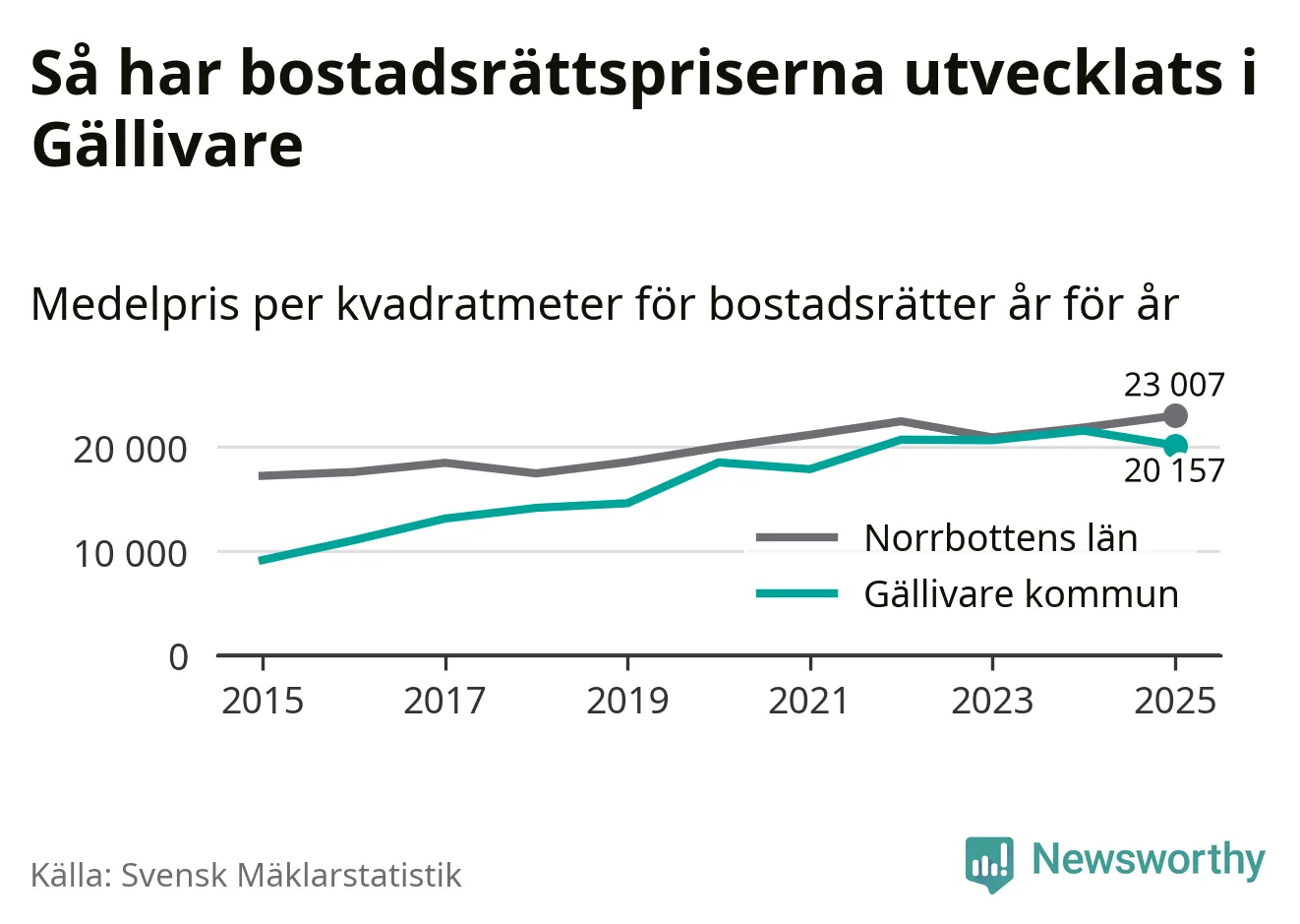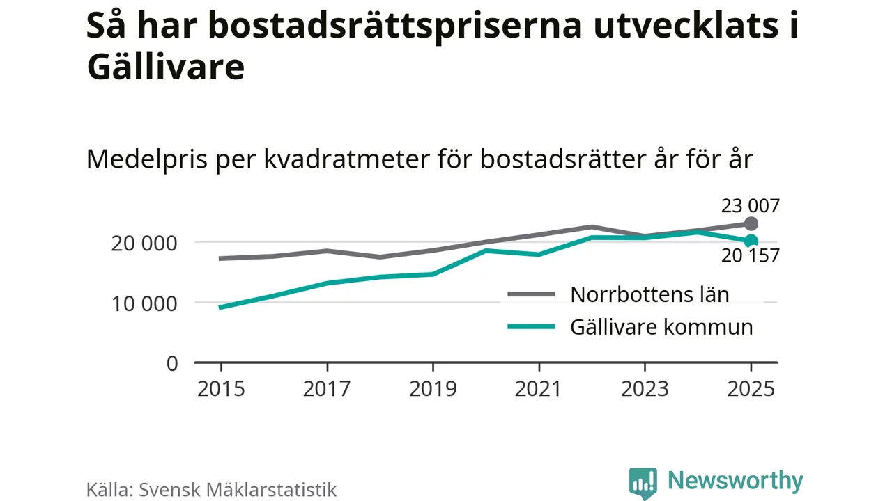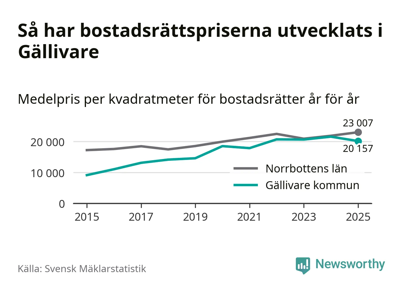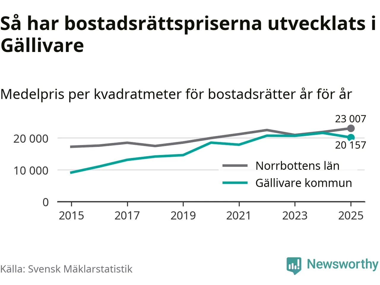 Det såldes totalt 117 bostadsrätter i Gällivare kommun under året. Genomsnittspriset per kvadratmeter landade på 20 157 kronor. Det är en minskning med sju procent i kommunen på ett år.