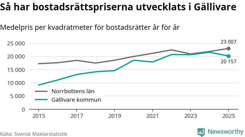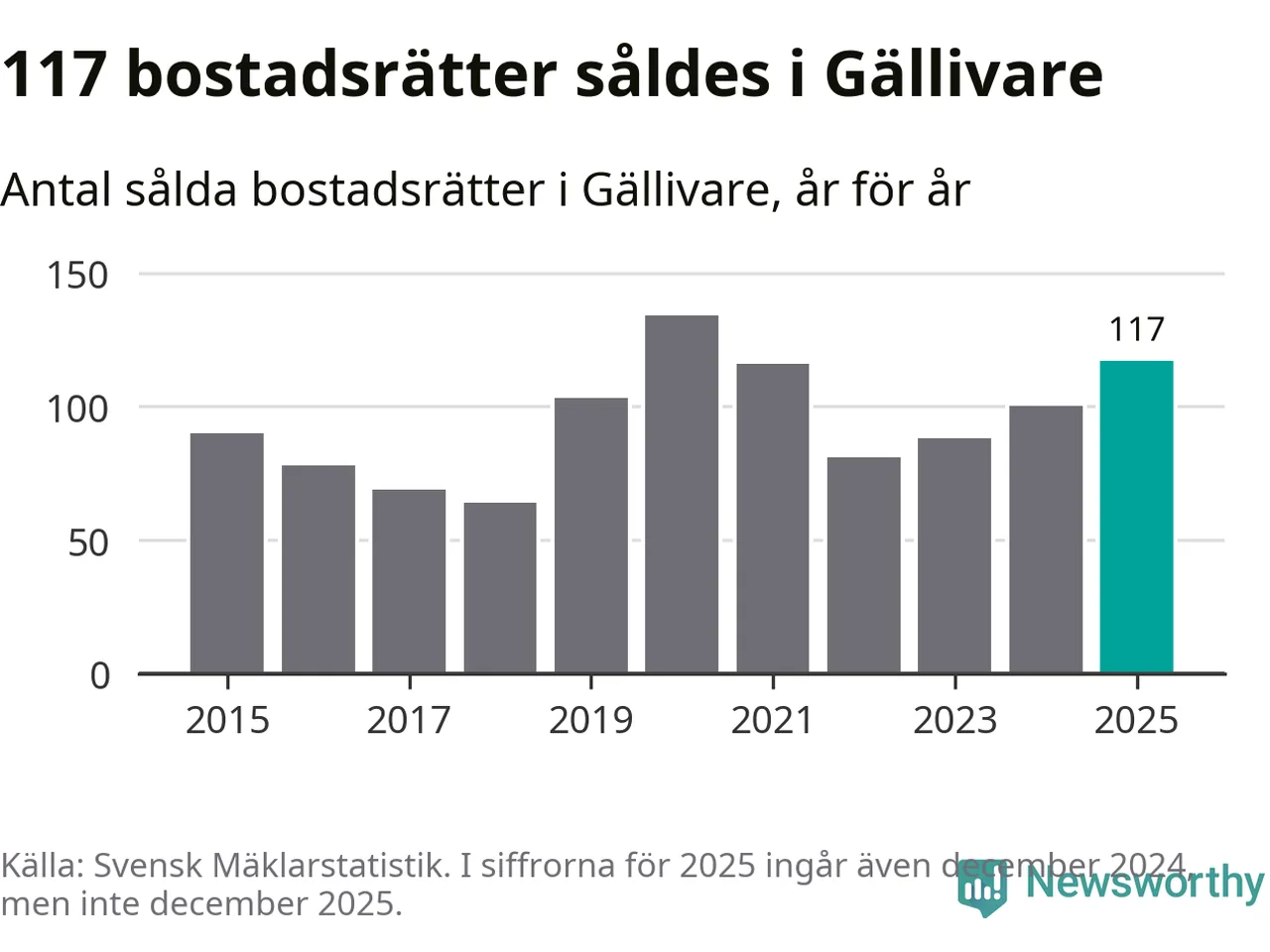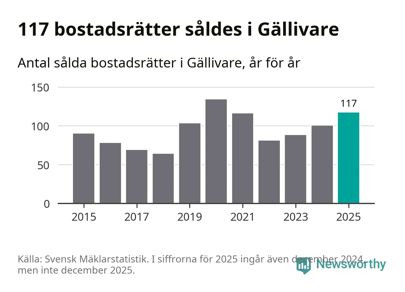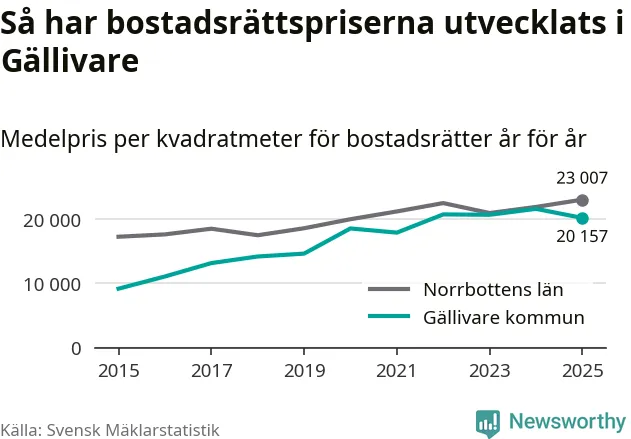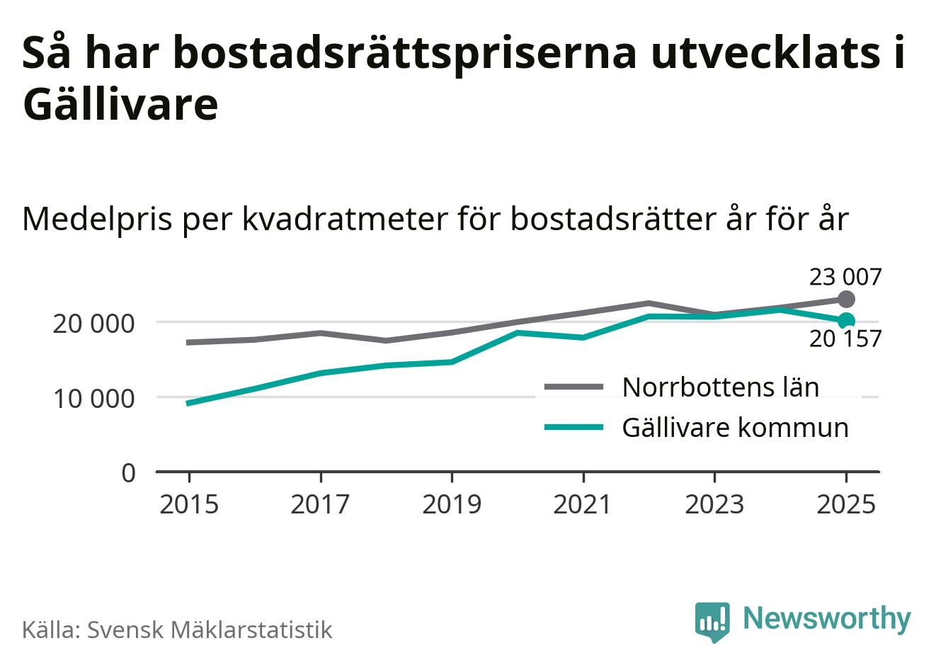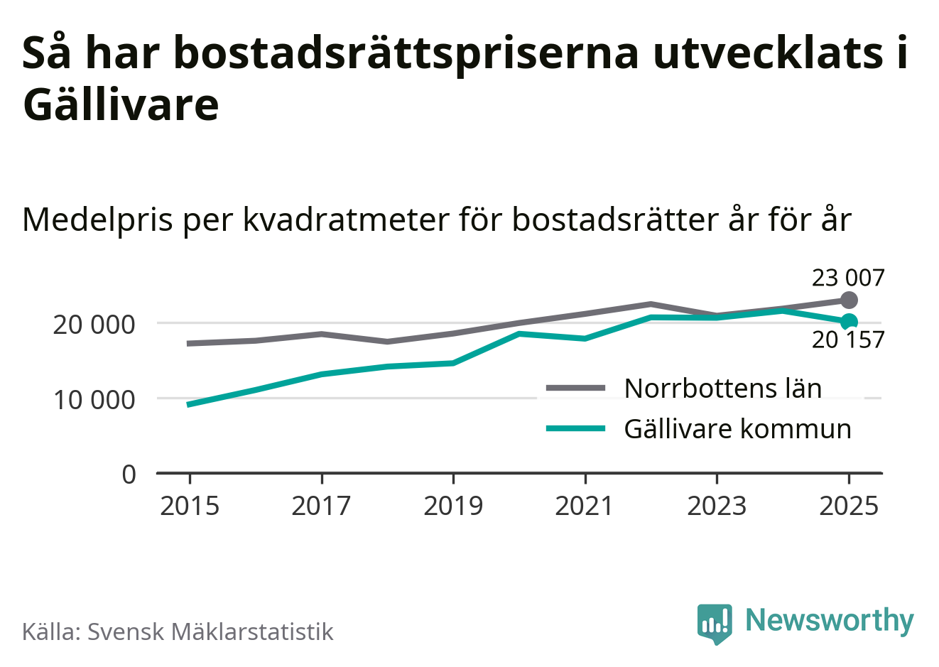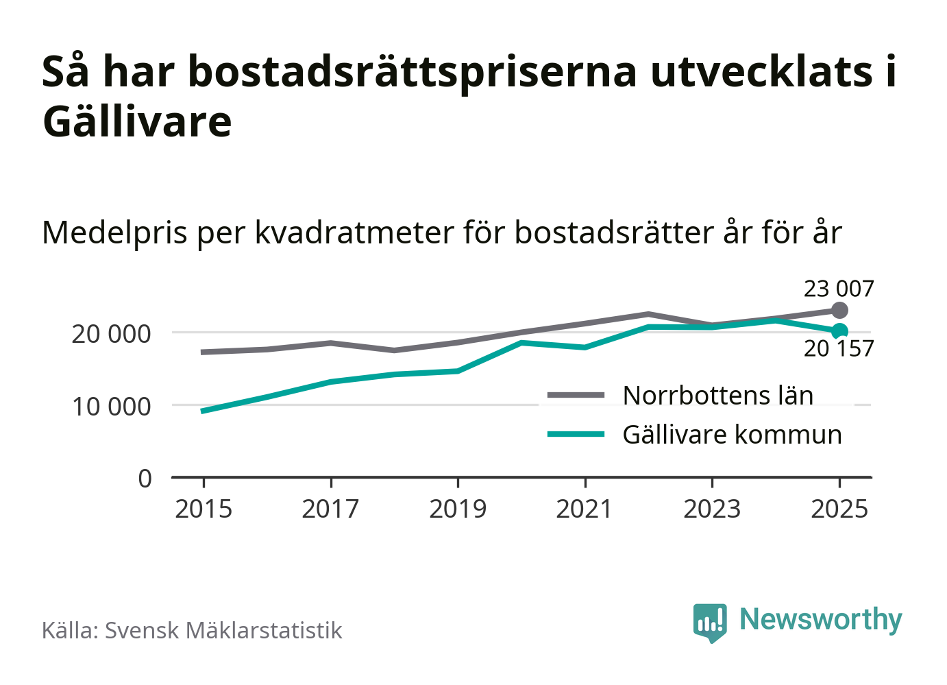 Det såldes totalt 117 bostadsrätter i Gällivare kommun under året. Genomsnittspriset per kvadratmeter landade på 20 157 kronor. Det är en minskning med sju procent i kommunen på ett år.