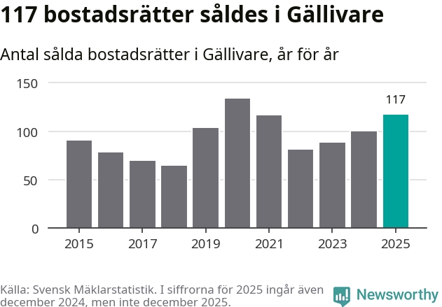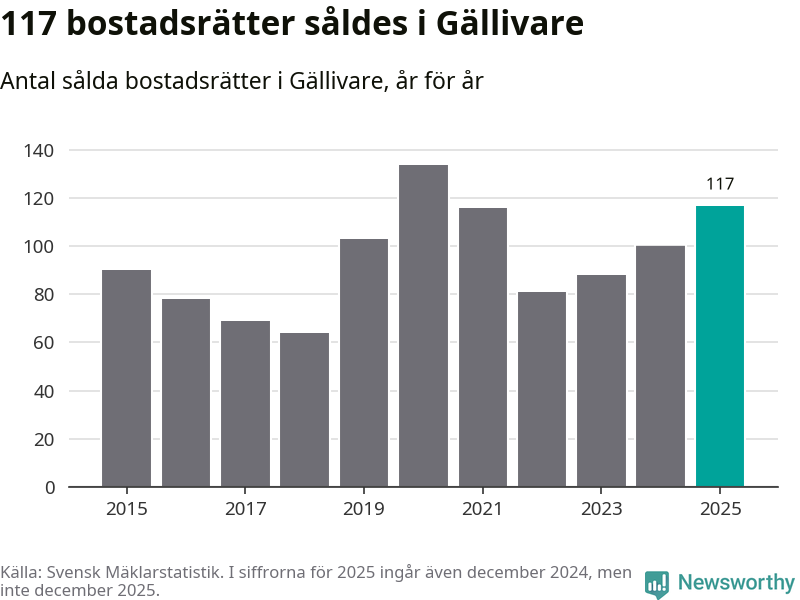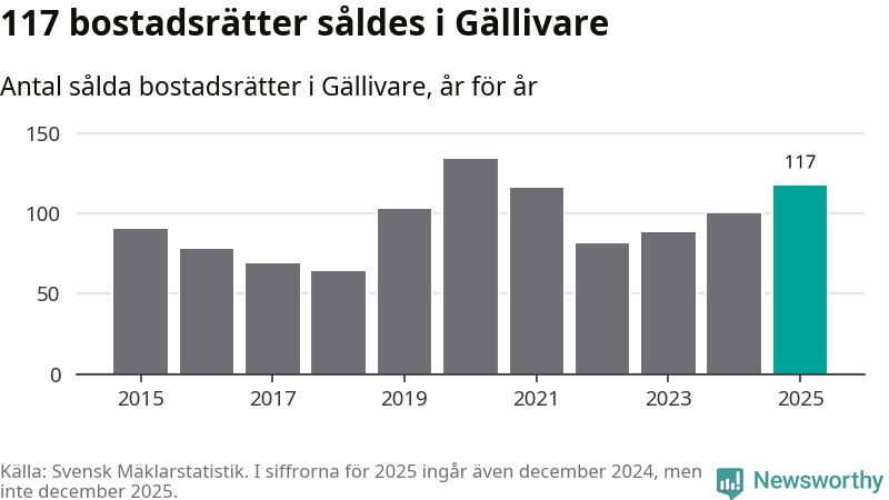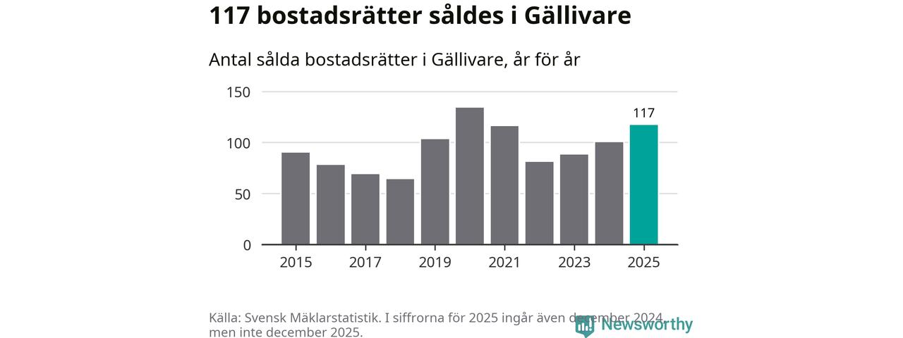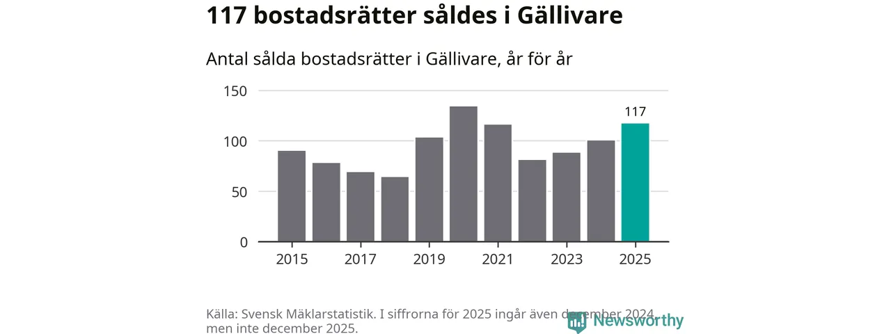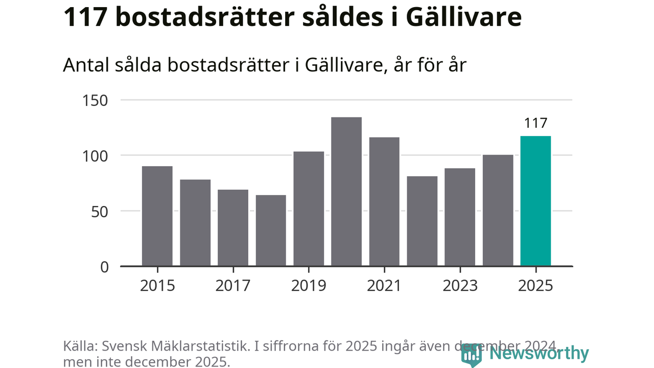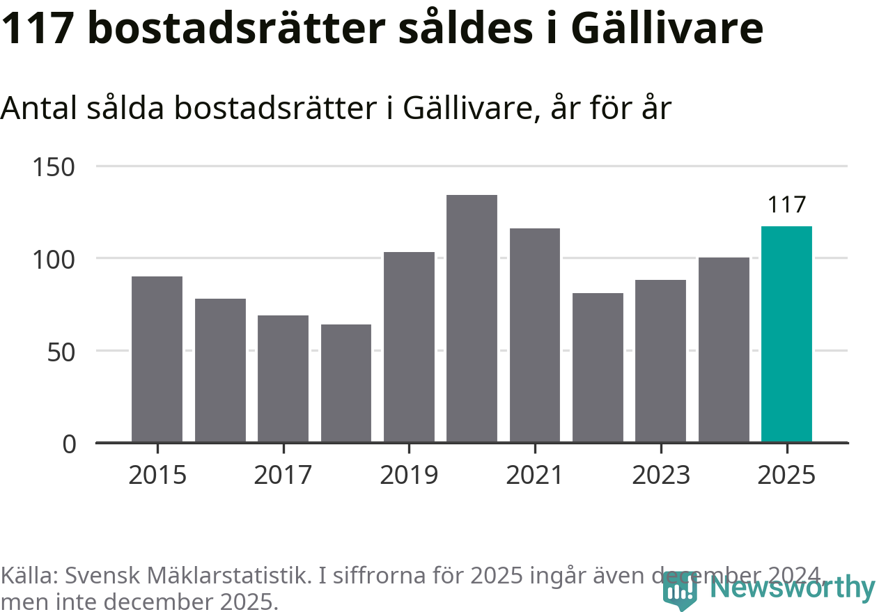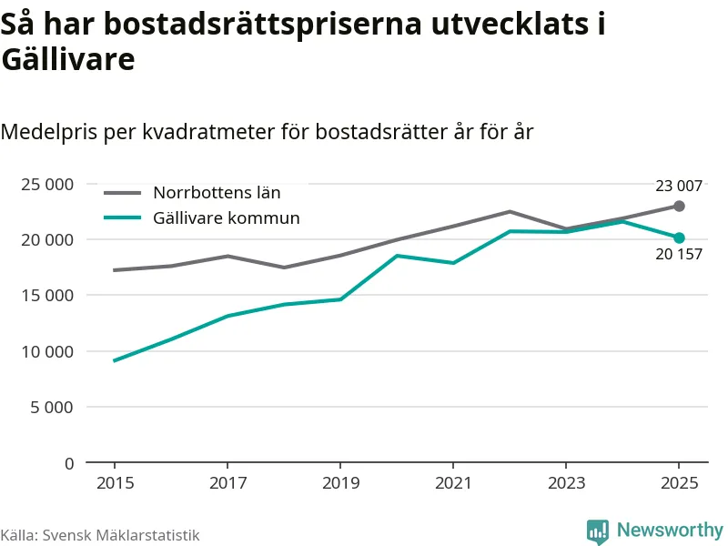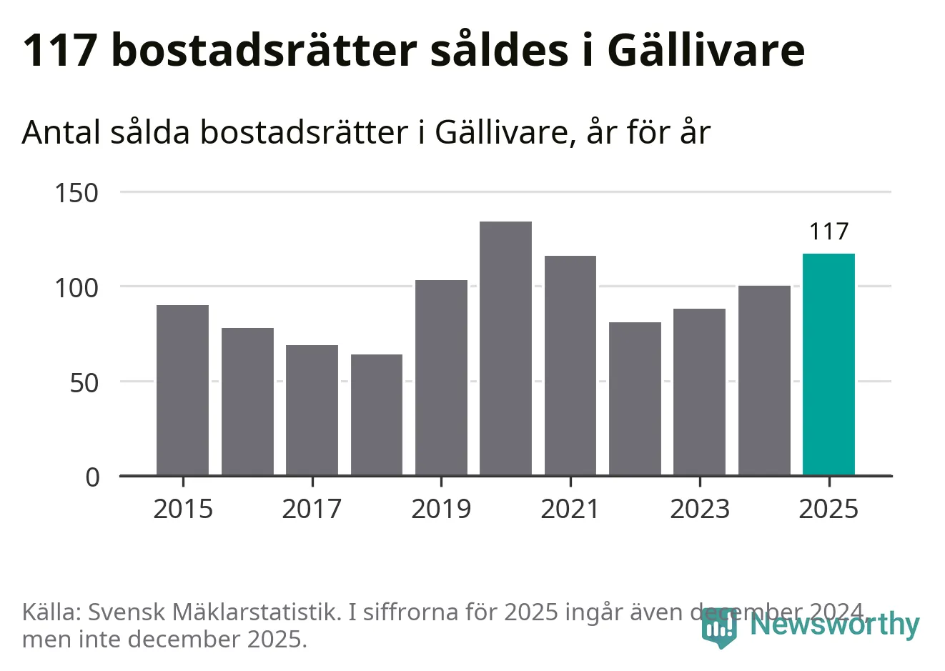 Det såldes totalt 117 bostadsrätter i Gällivare kommun under året. Genomsnittspriset per kvadratmeter landade på 20 157 kronor. Det är en minskning med sju procent i kommunen på ett år.