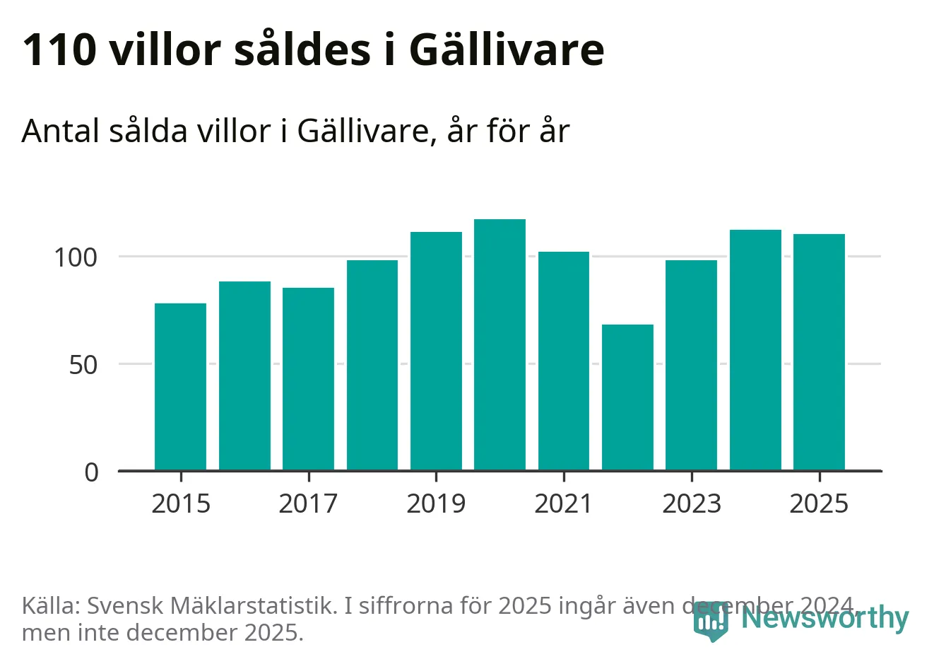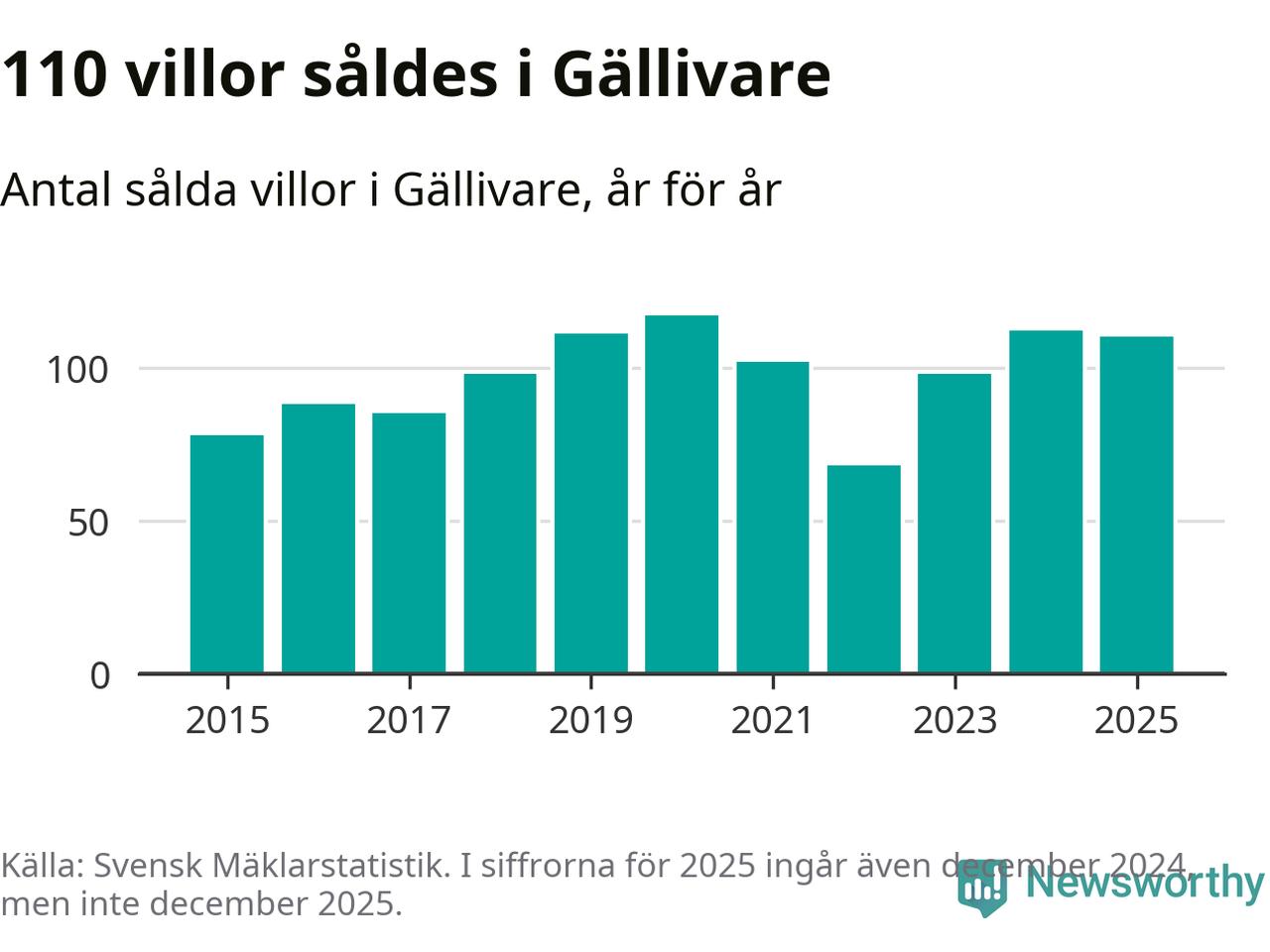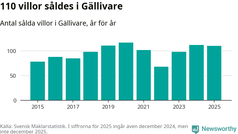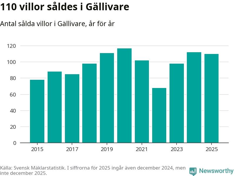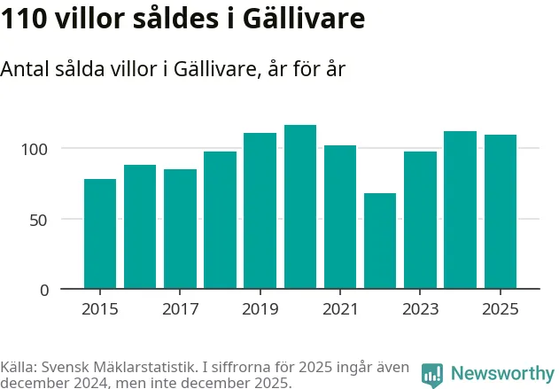 Däremot minskade antalet sålda villor något. Totalt såldes 110 villor, att jämföra med 112 under 2024.