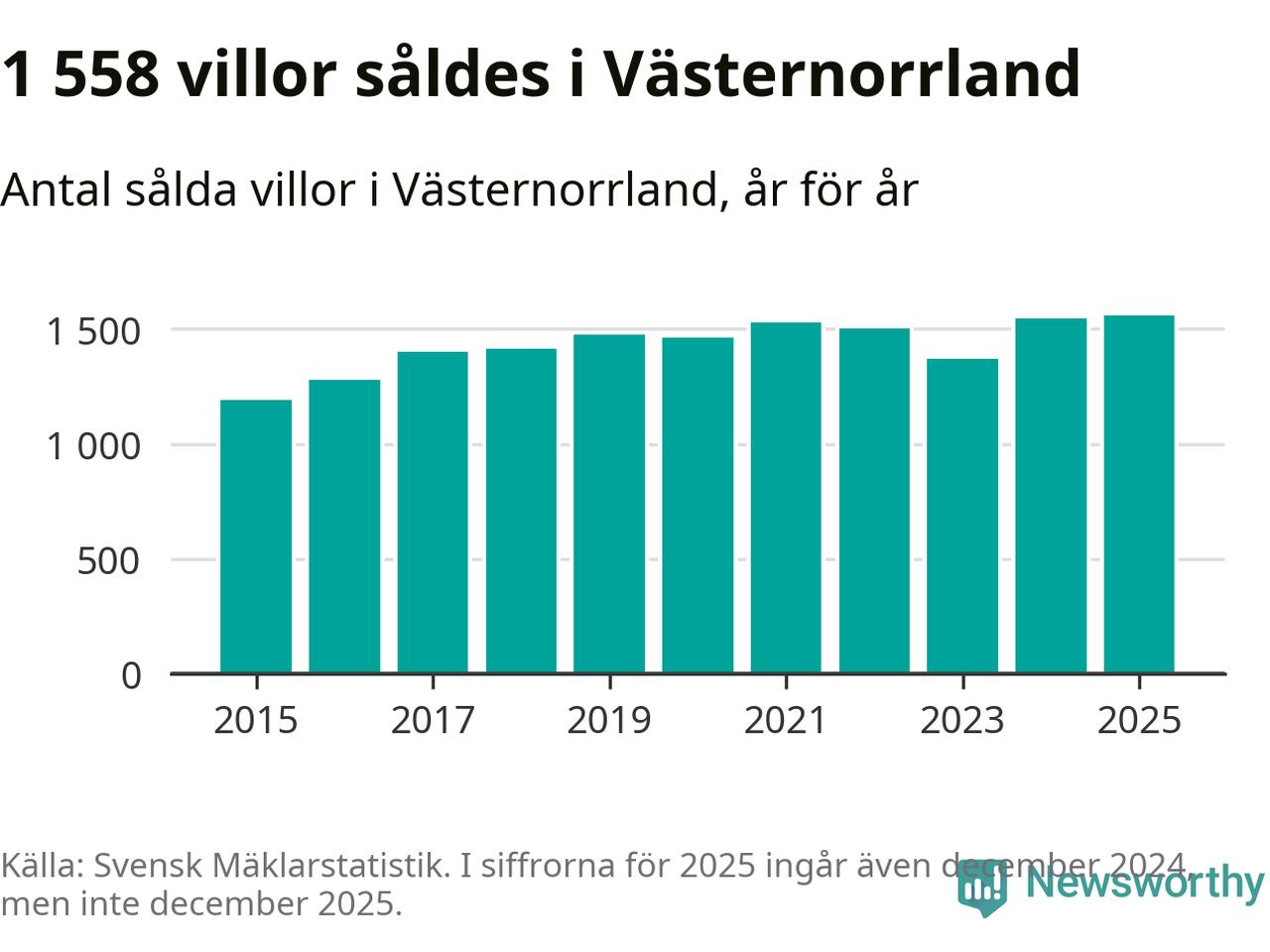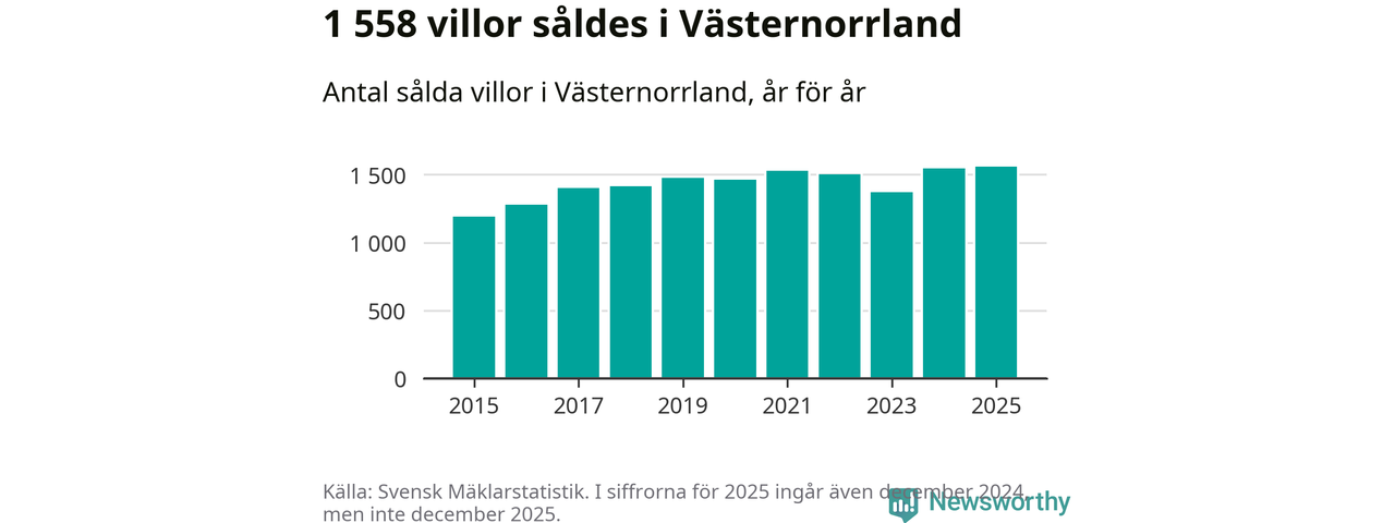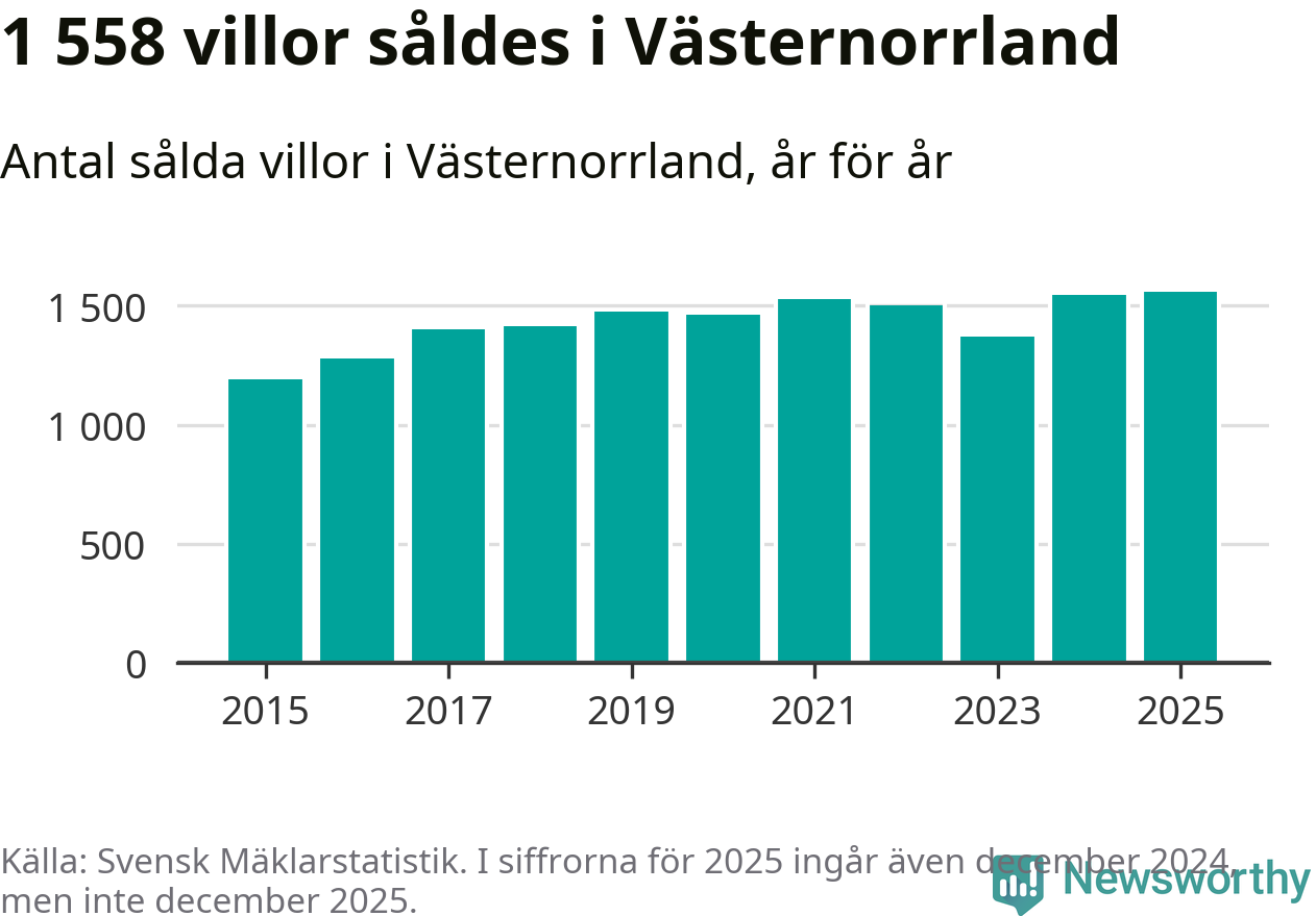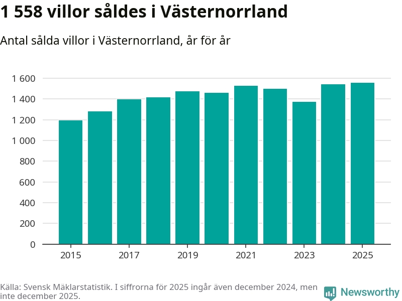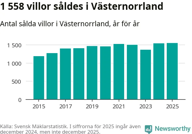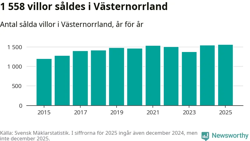 Antalet sålda villor ökade också. Totalt såldes 1 558 villor, att jämföra med 1 543 under 2024. Det är fler än något annat år sedan 2015.