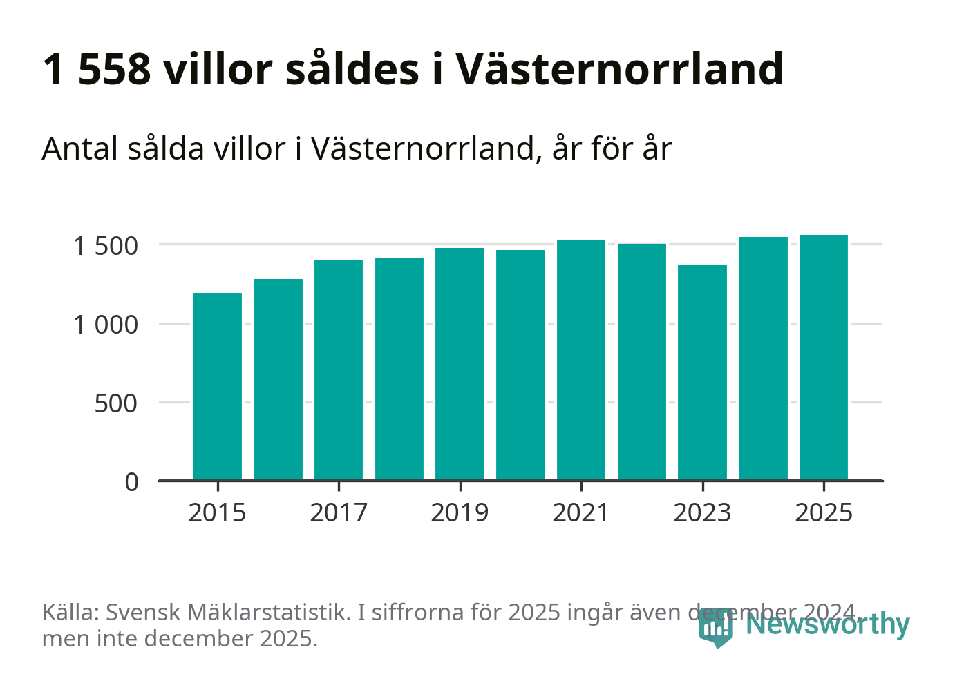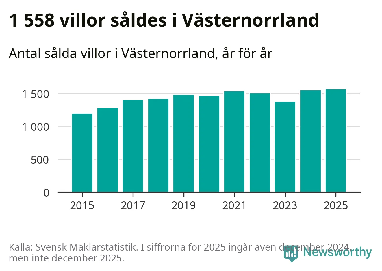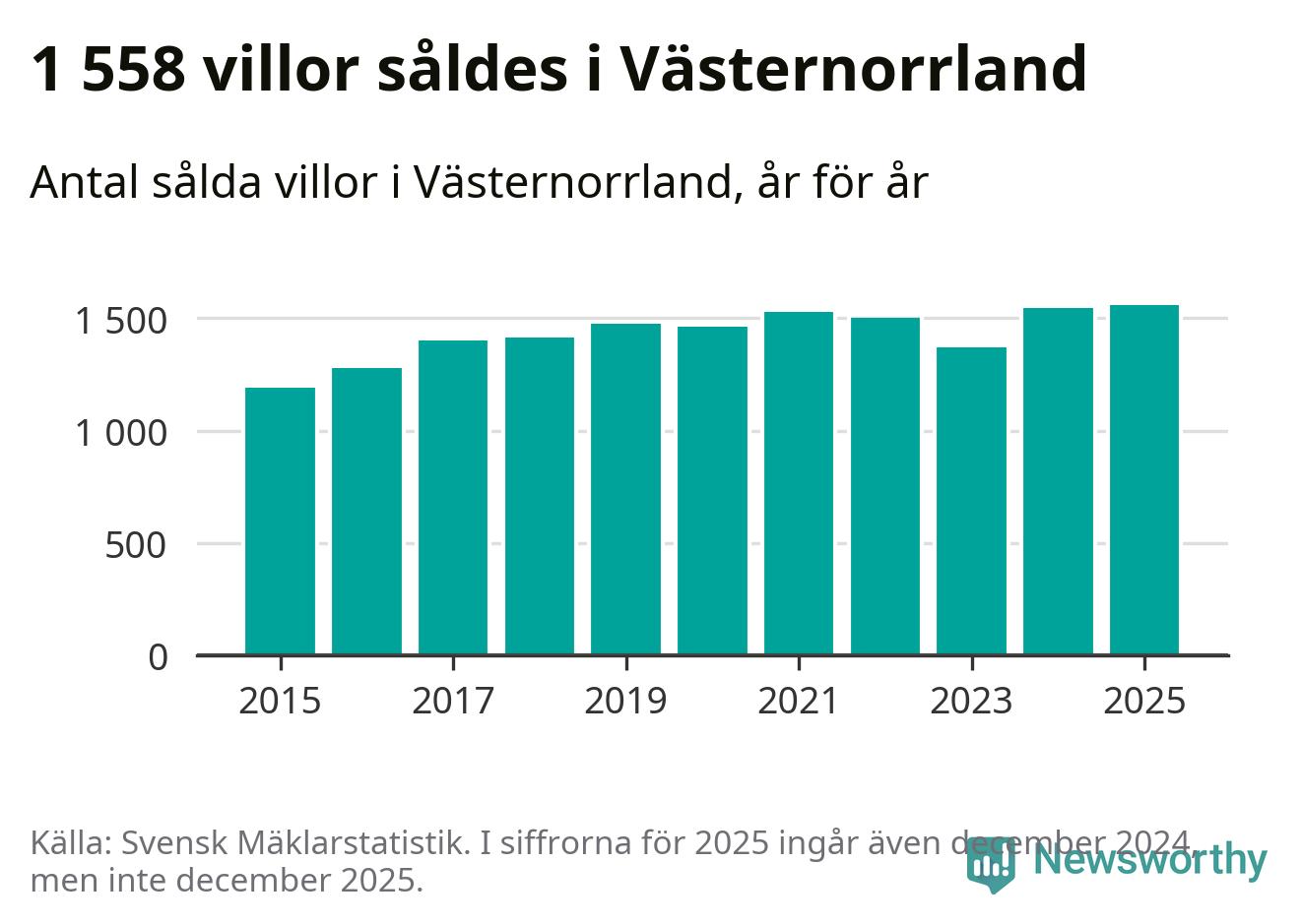 Antalet sålda villor ökade också. Totalt såldes 1 558 villor, att jämföra med 1 543 under 2024. Det är fler än något annat år sedan 2015.
