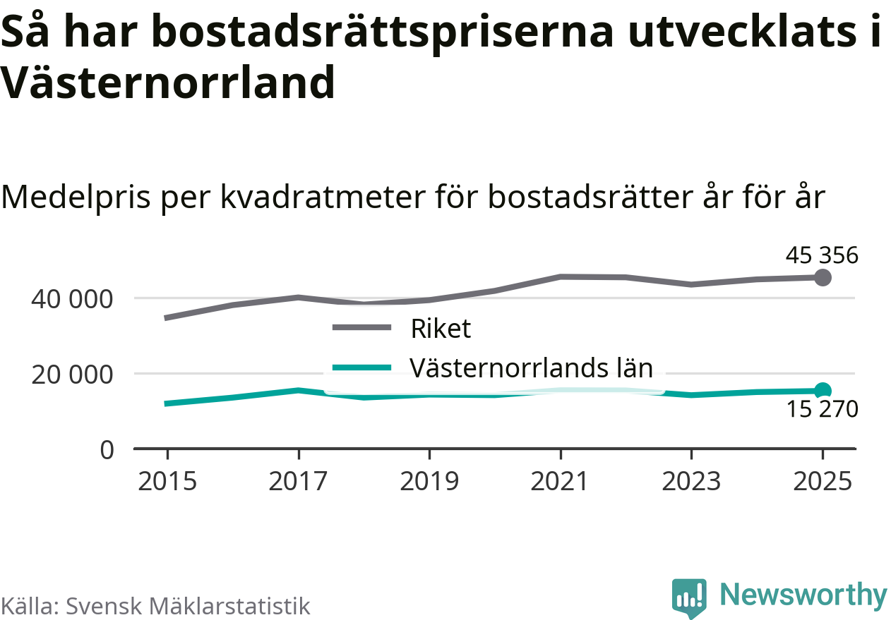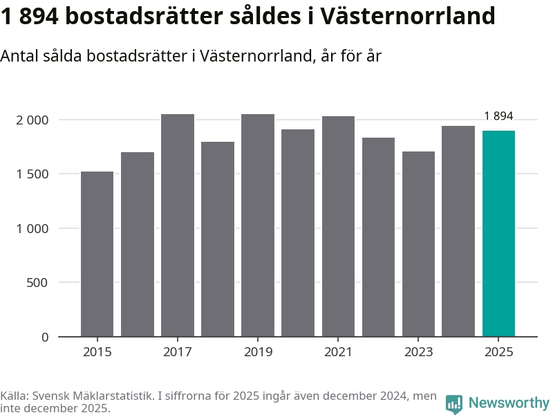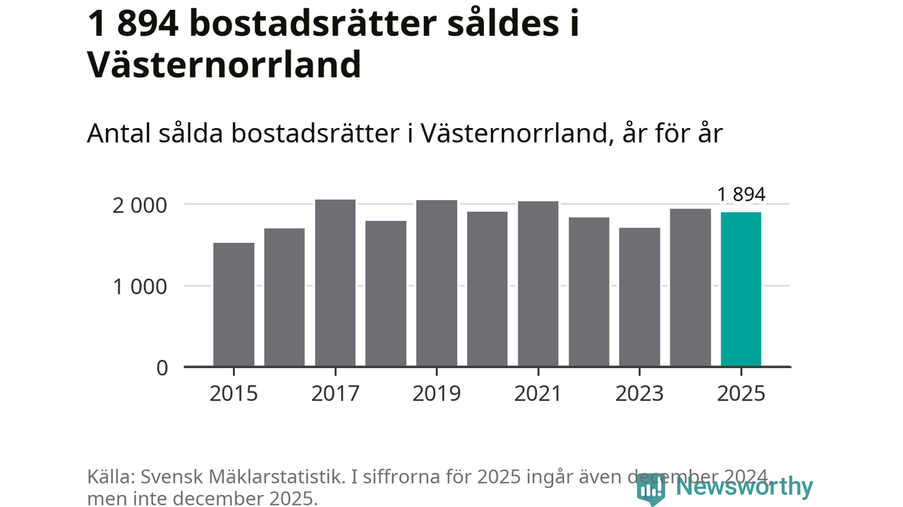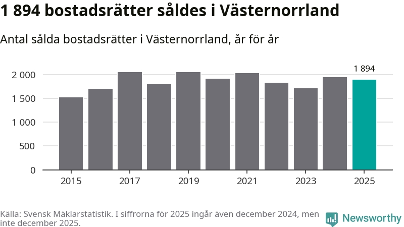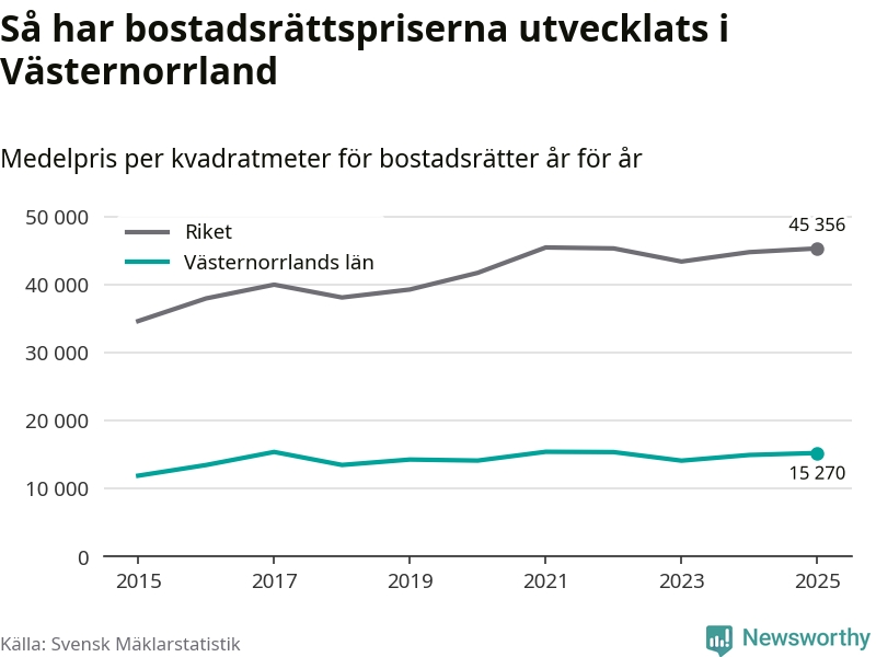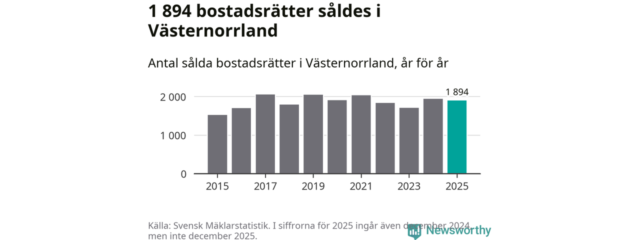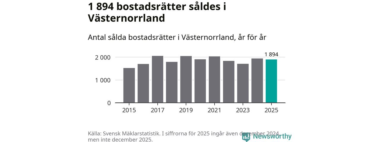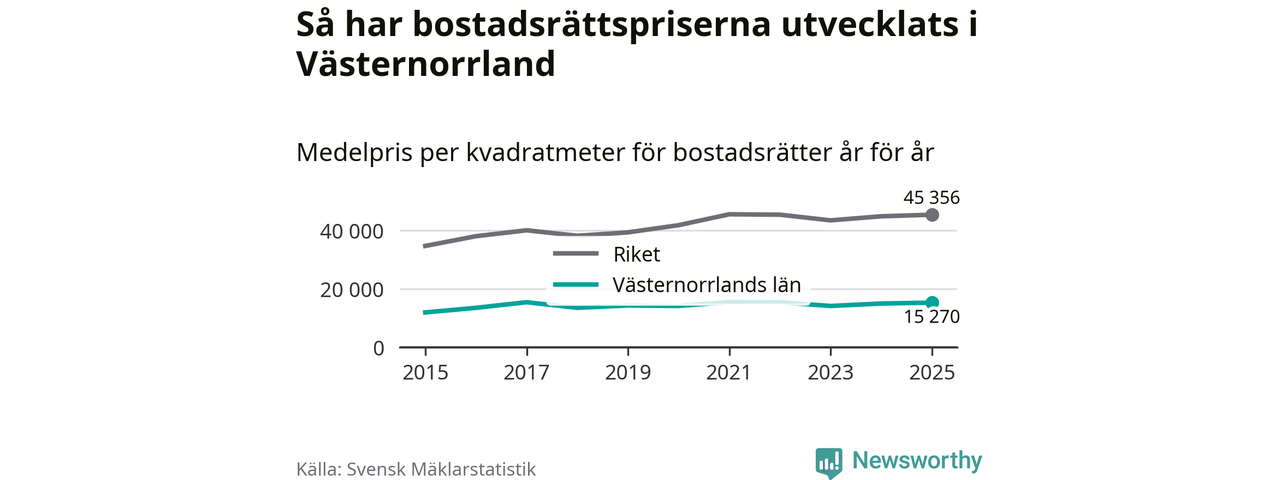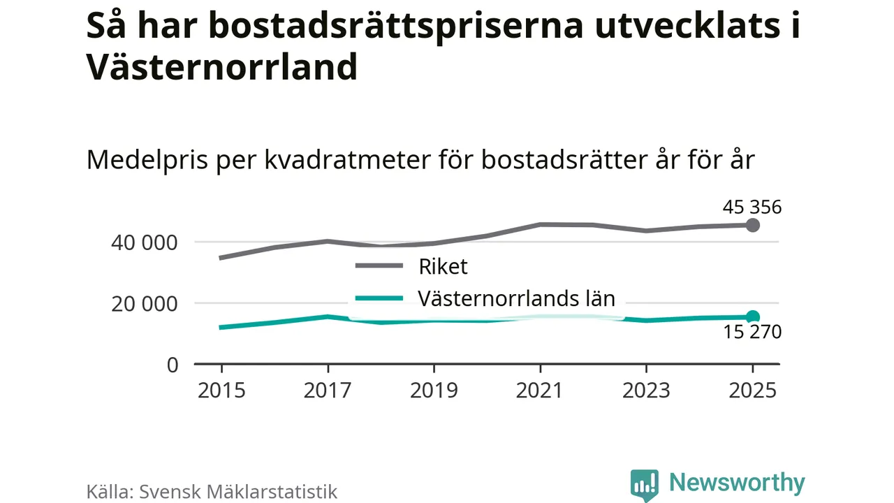 Det såldes totalt 1 894 bostadsrätter i Västernorrlands län under året. Genomsnittspriset per kvadratmeter landade på 15 270 kronor. Det är en ökning med två procent i länet på ett år.